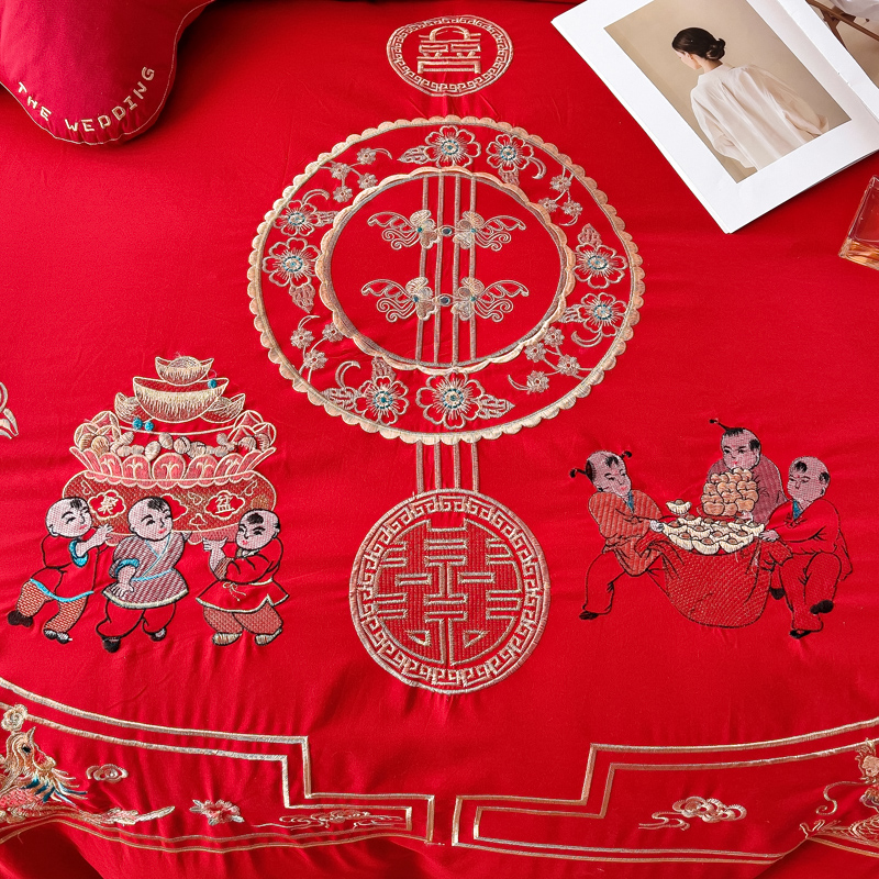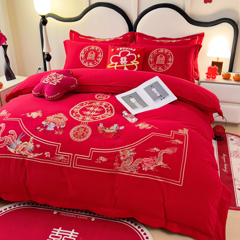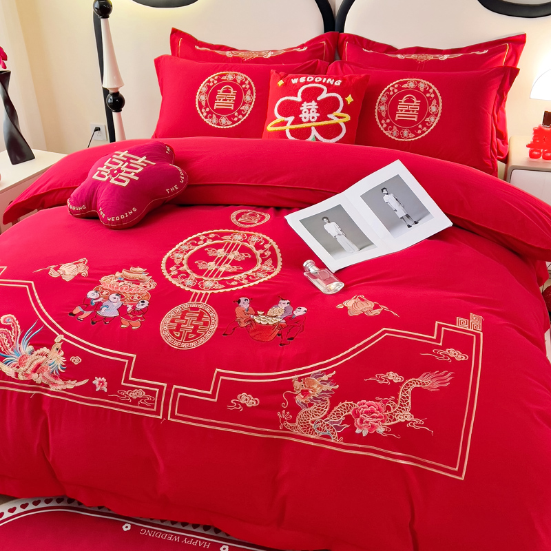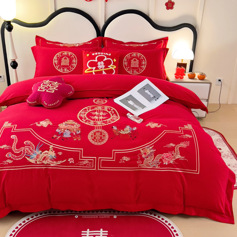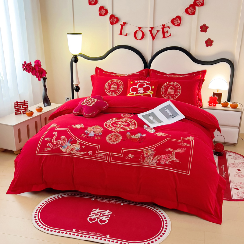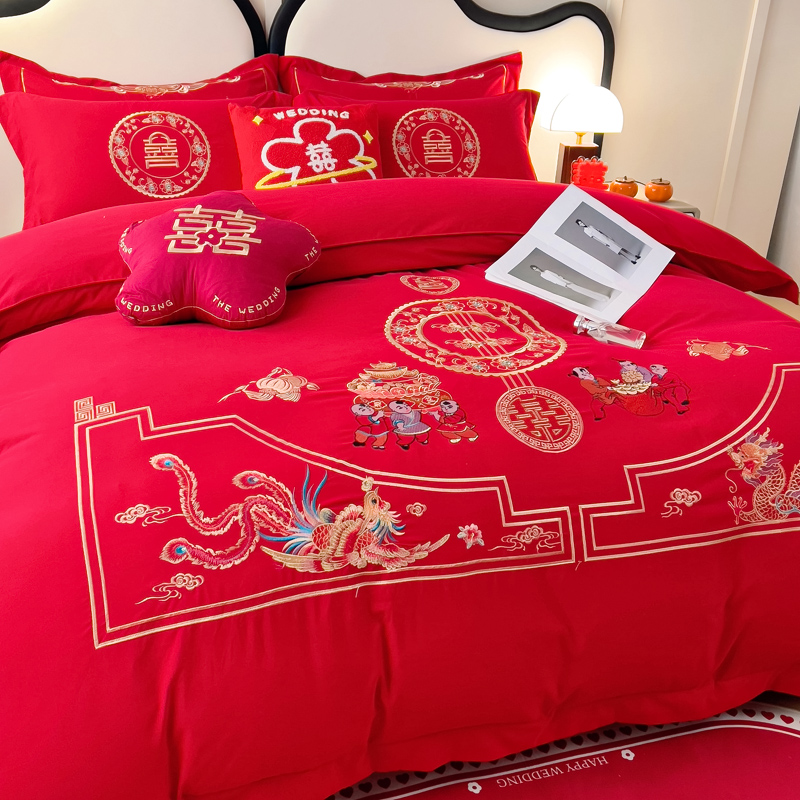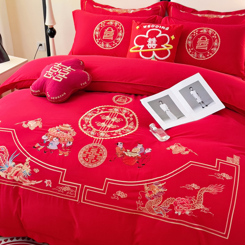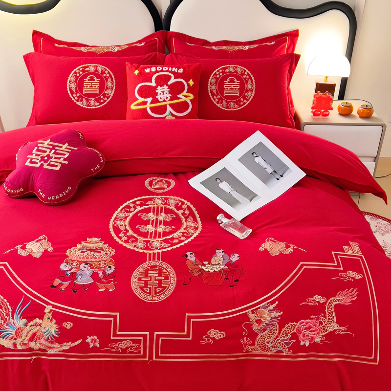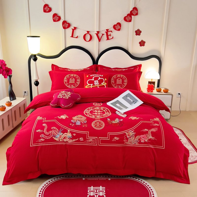 2025新款100支150克双面长绒棉婚庆绣花四件套 龙凤九天