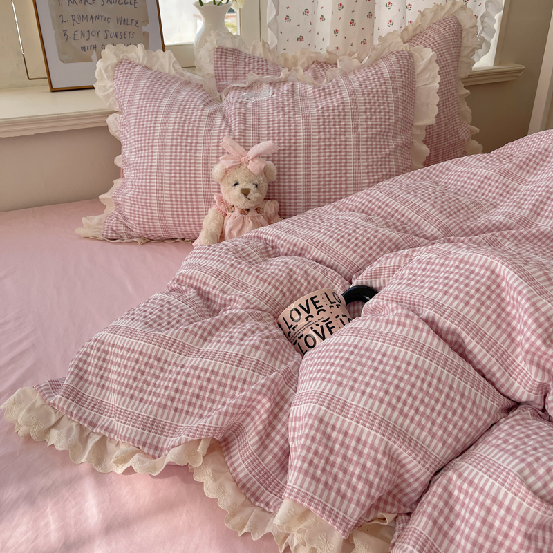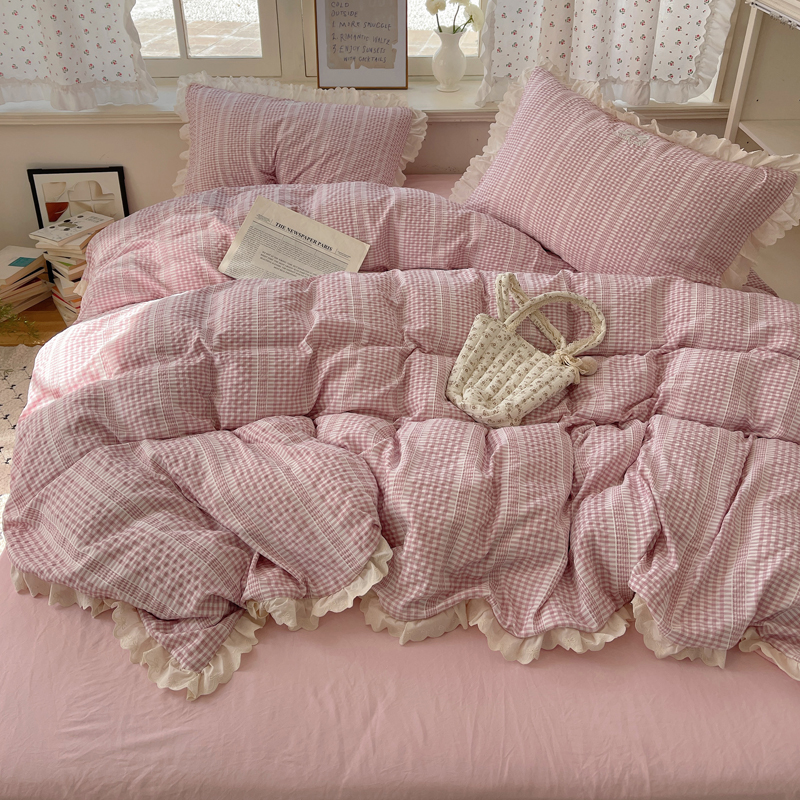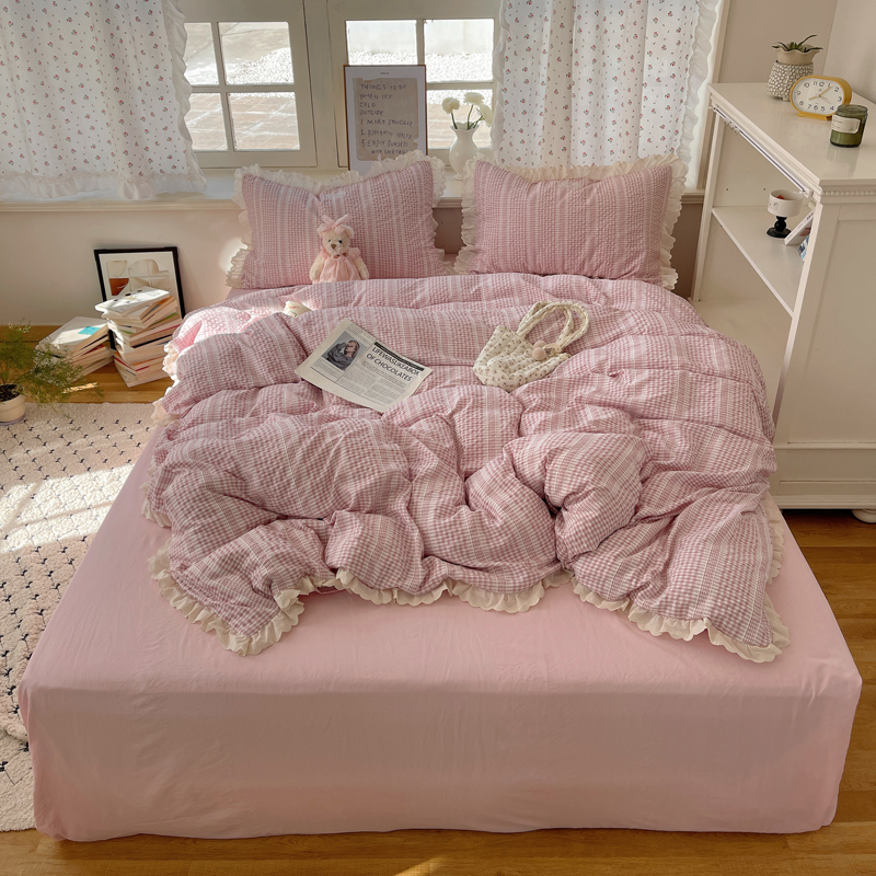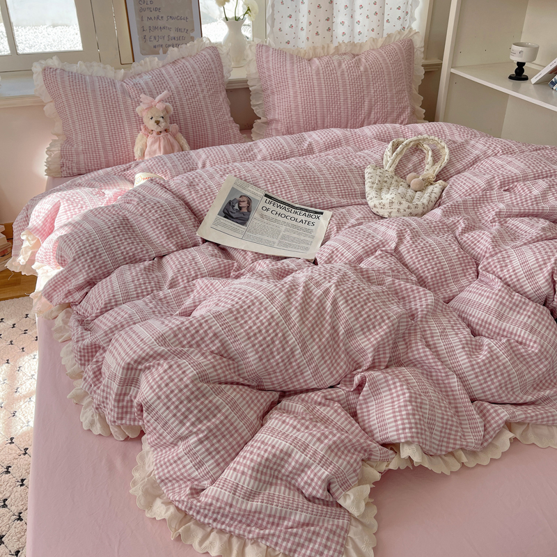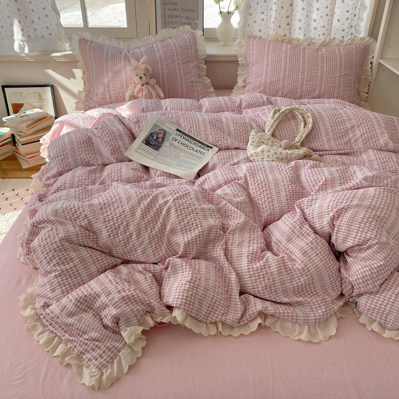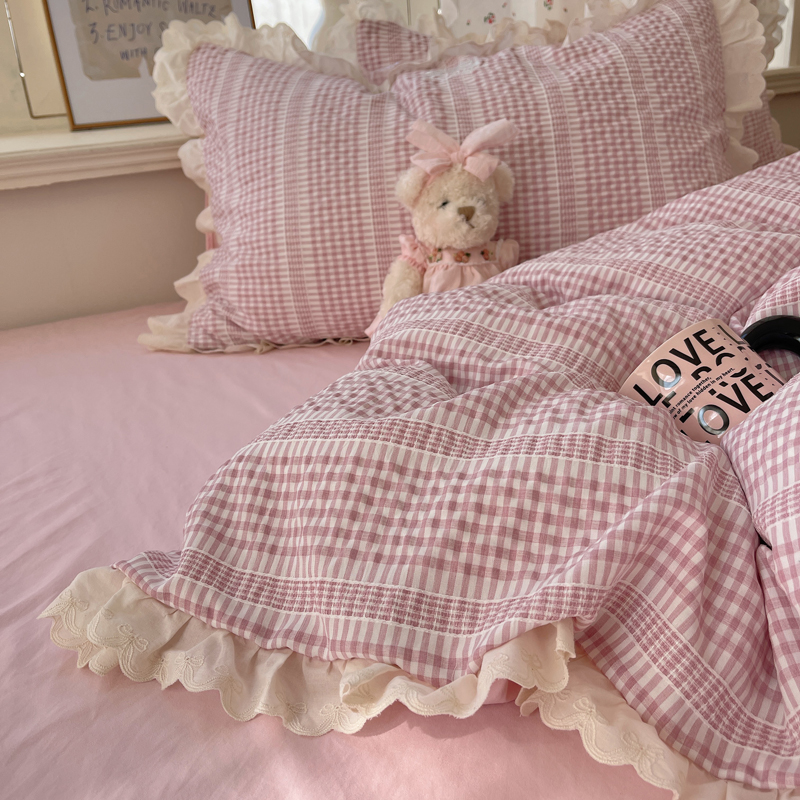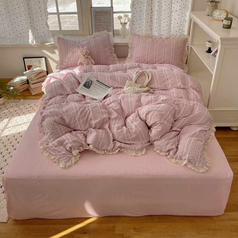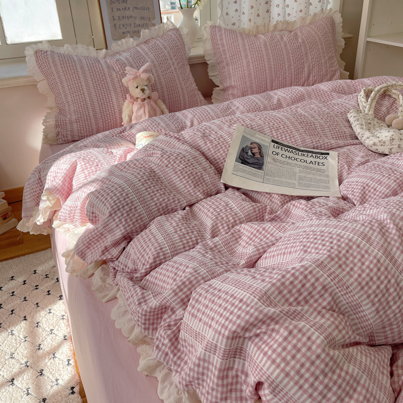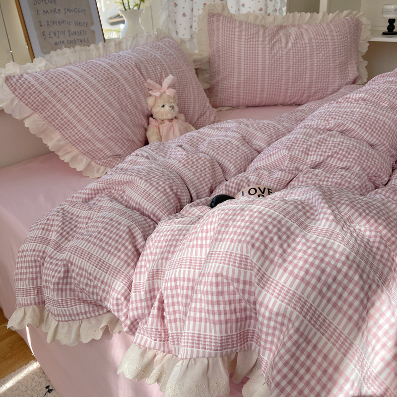 商品名称:轻奢坊 2025新款色织提花格子水洗棉仙仙花边安妮四件套 花边安妮-粉