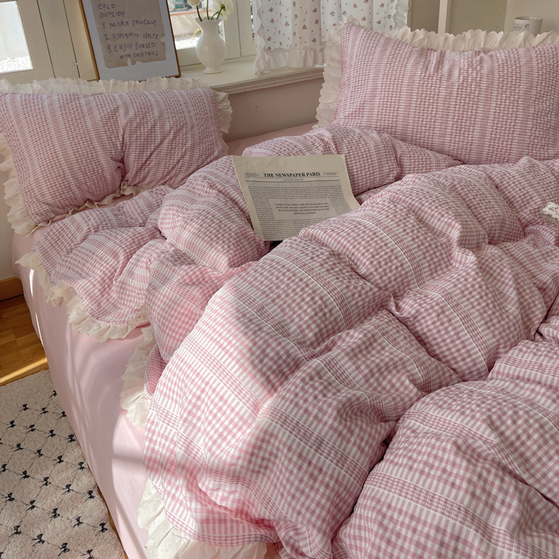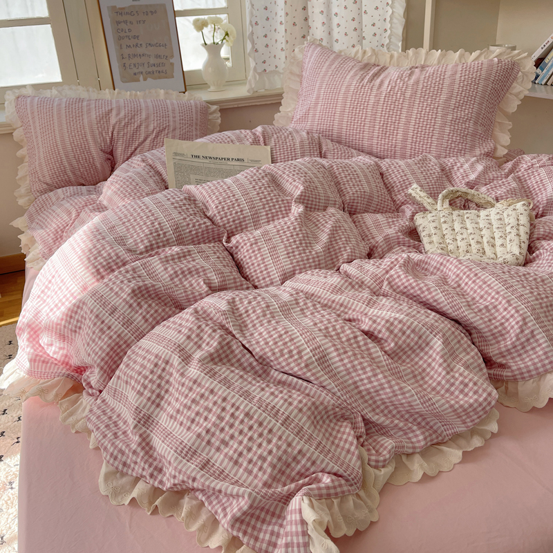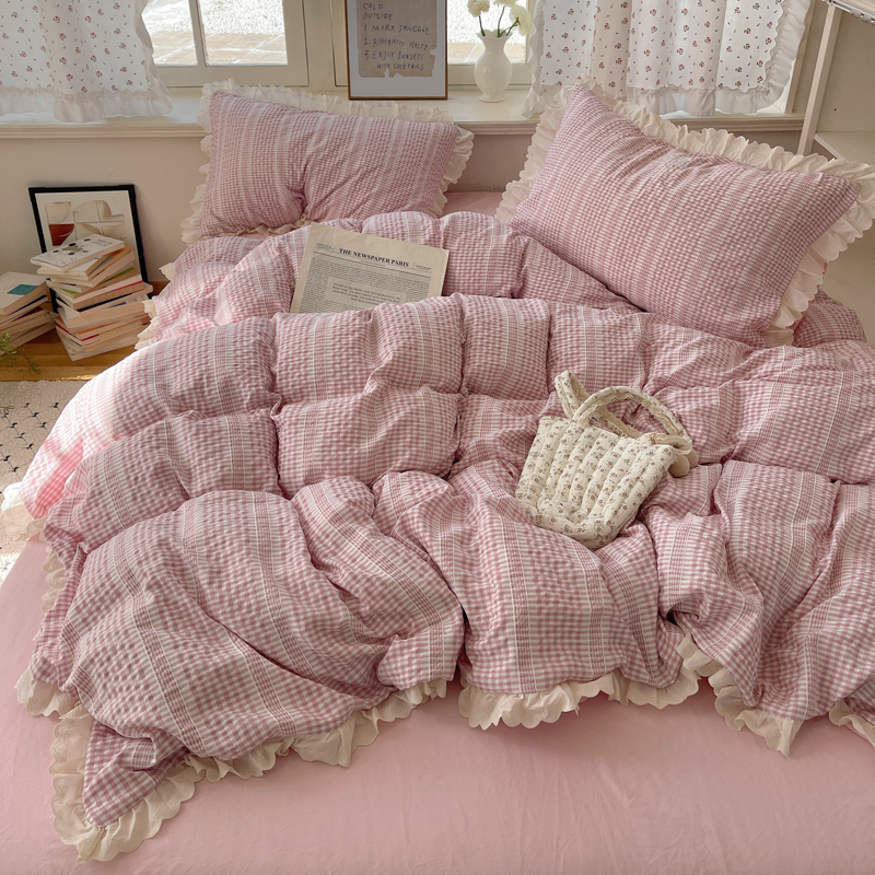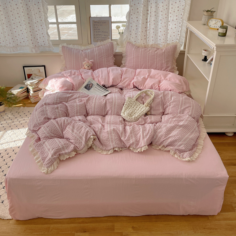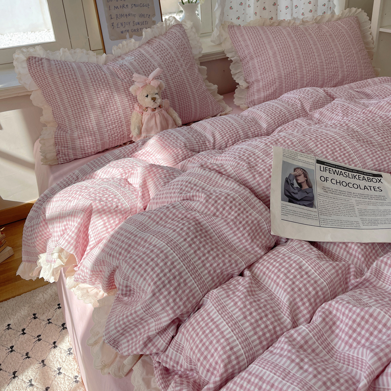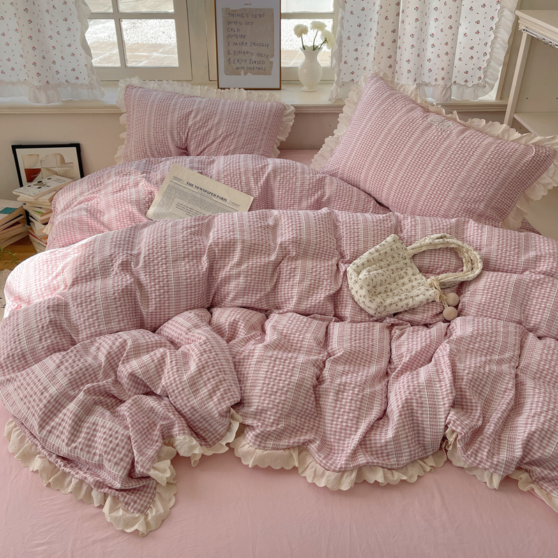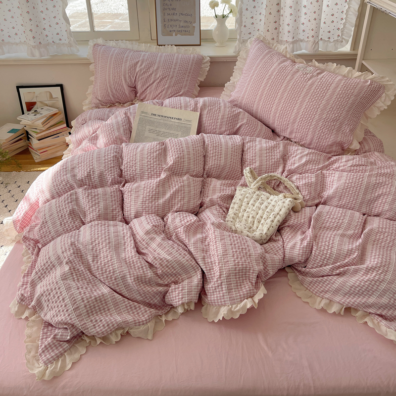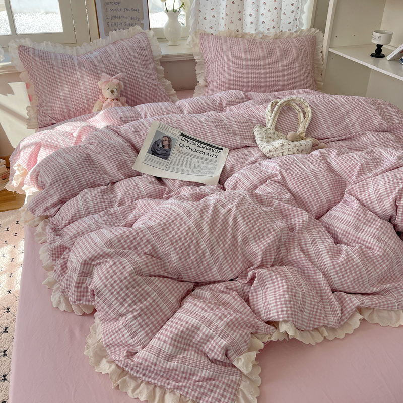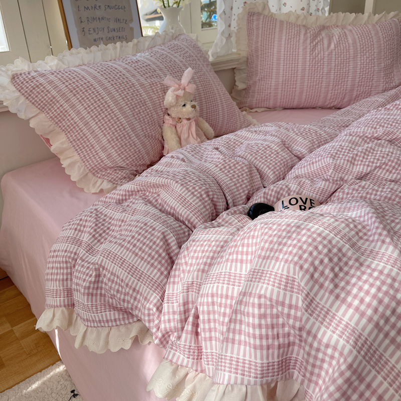 商品名称:轻奢坊 2025新款色织提花格子水洗棉仙仙花边安妮四件套 花边安妮-粉
