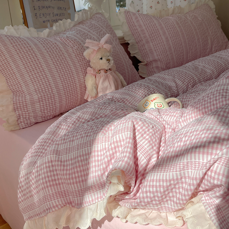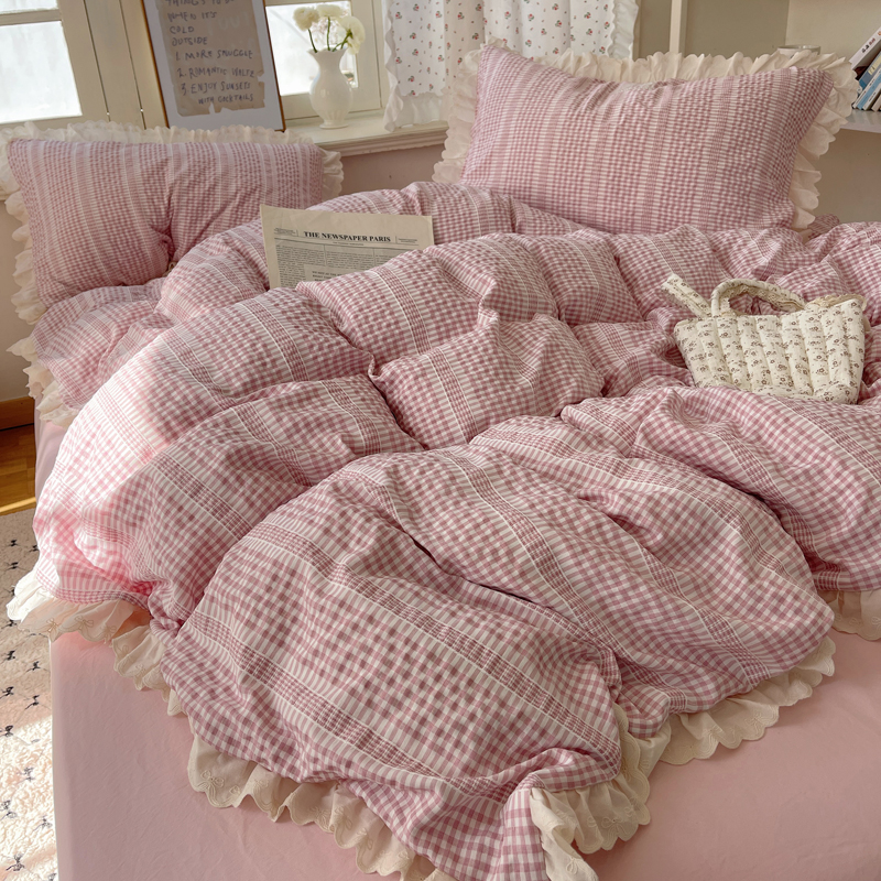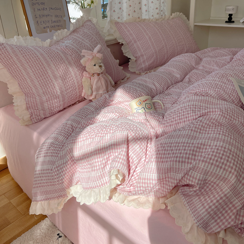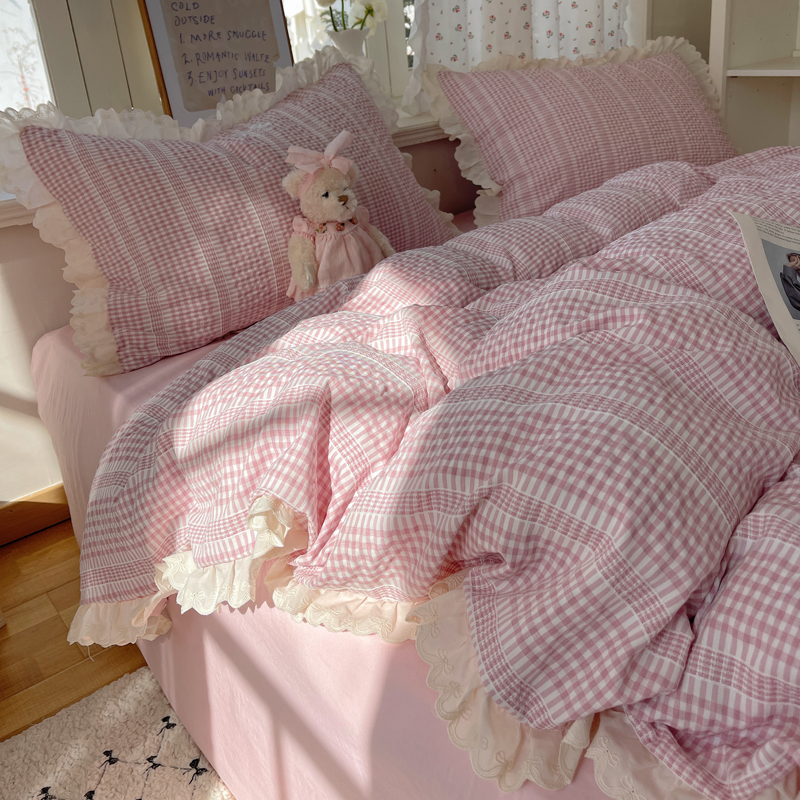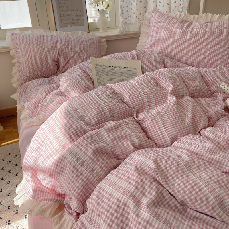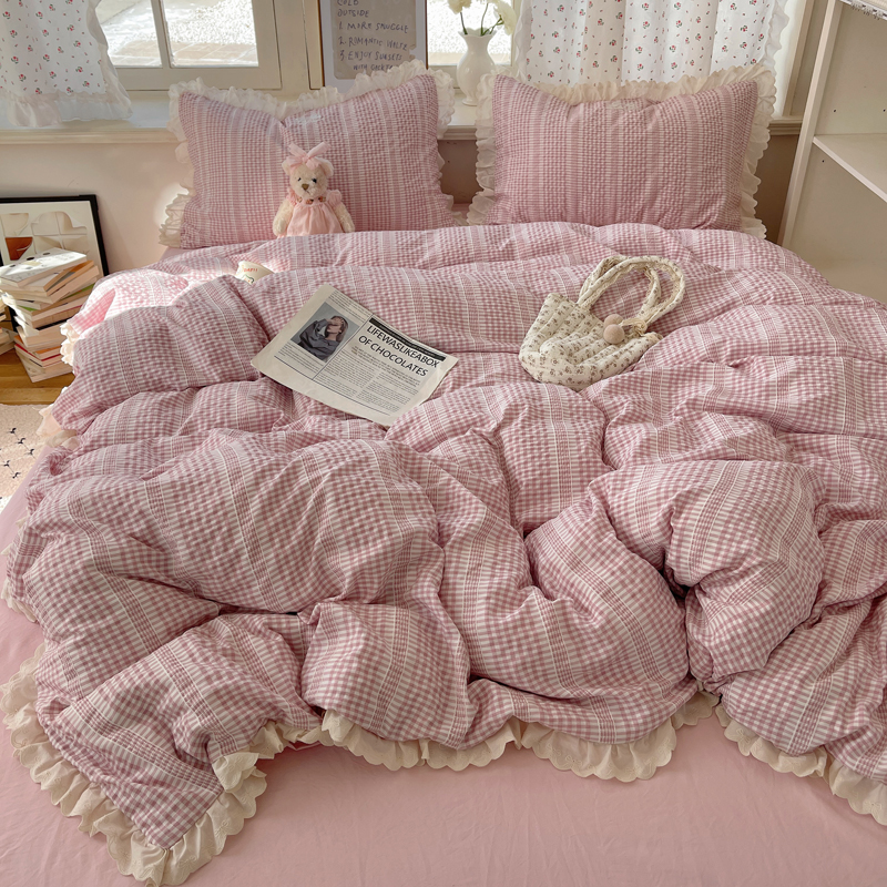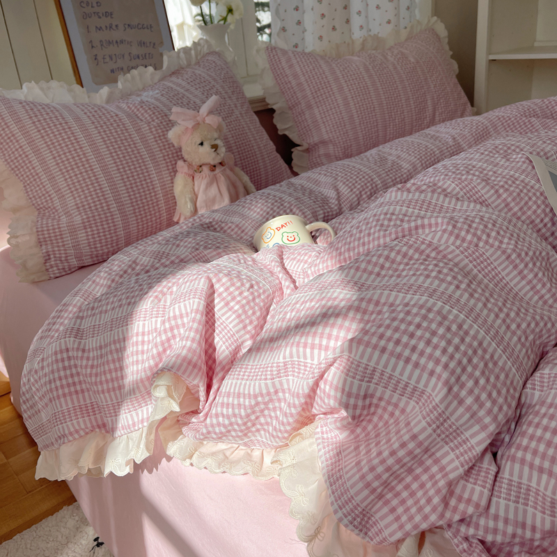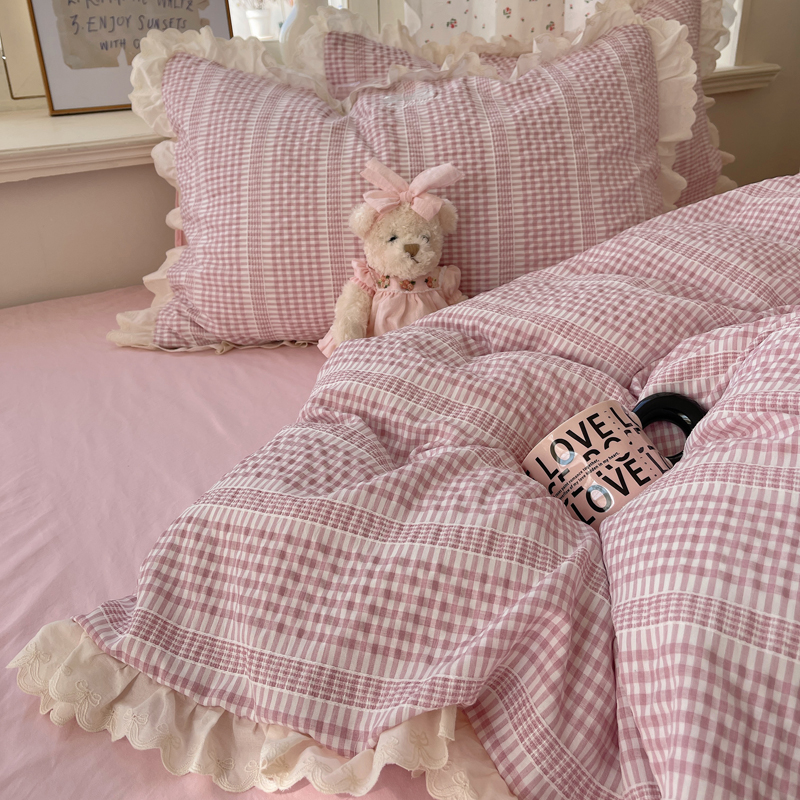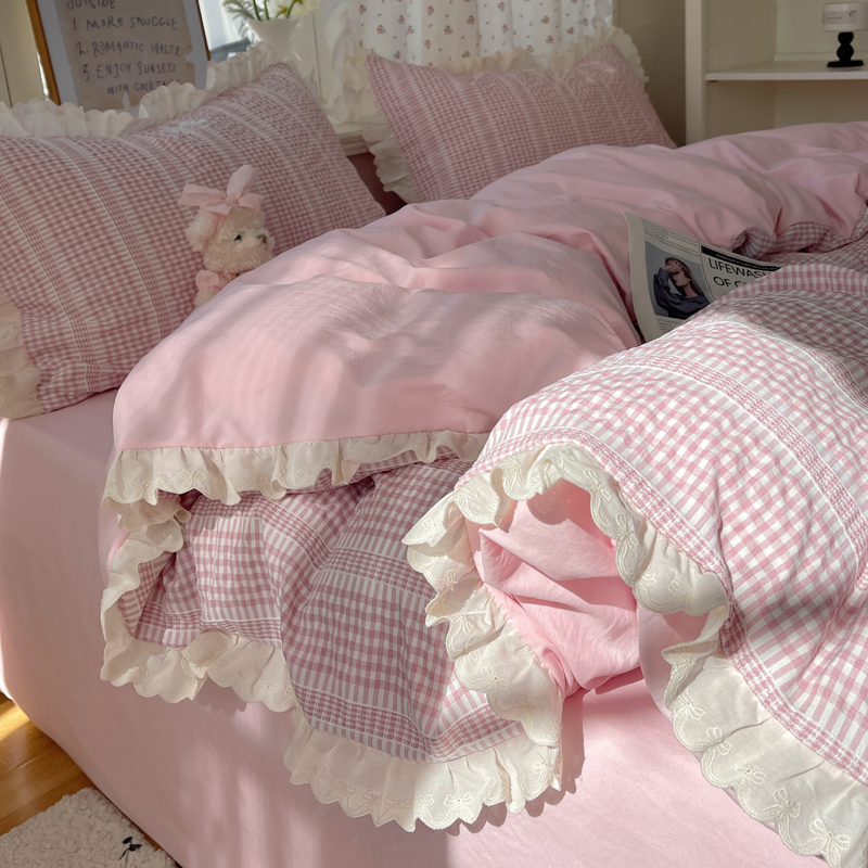 商品名称:轻奢坊 2025新款色织提花格子水洗棉仙仙花边安妮四件套 花边安妮-粉