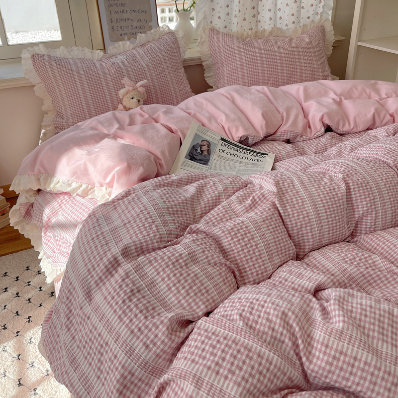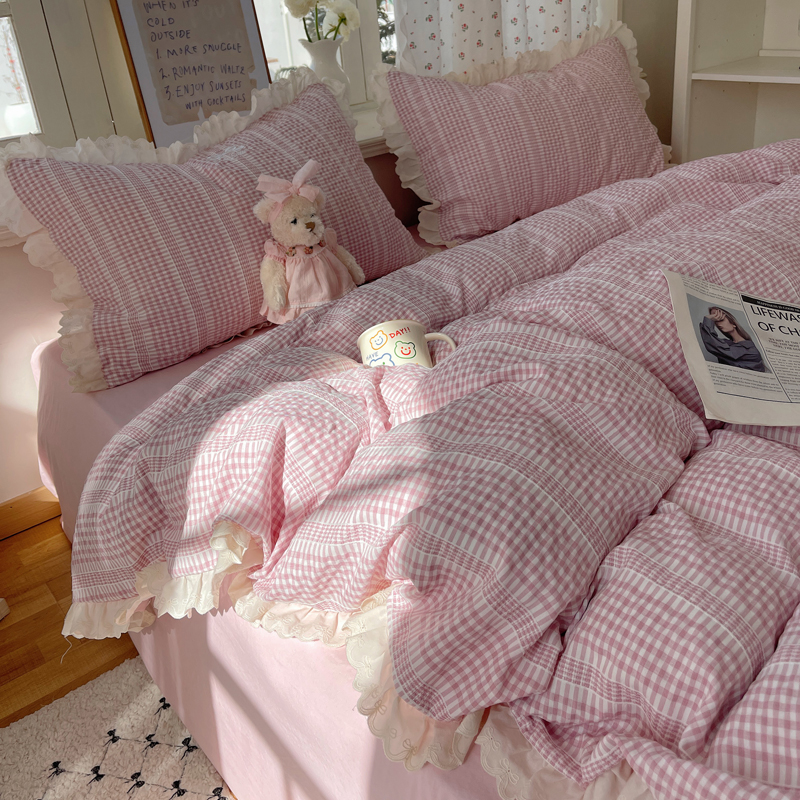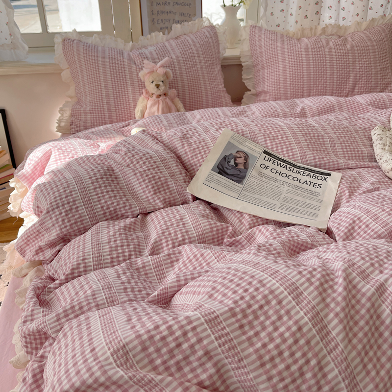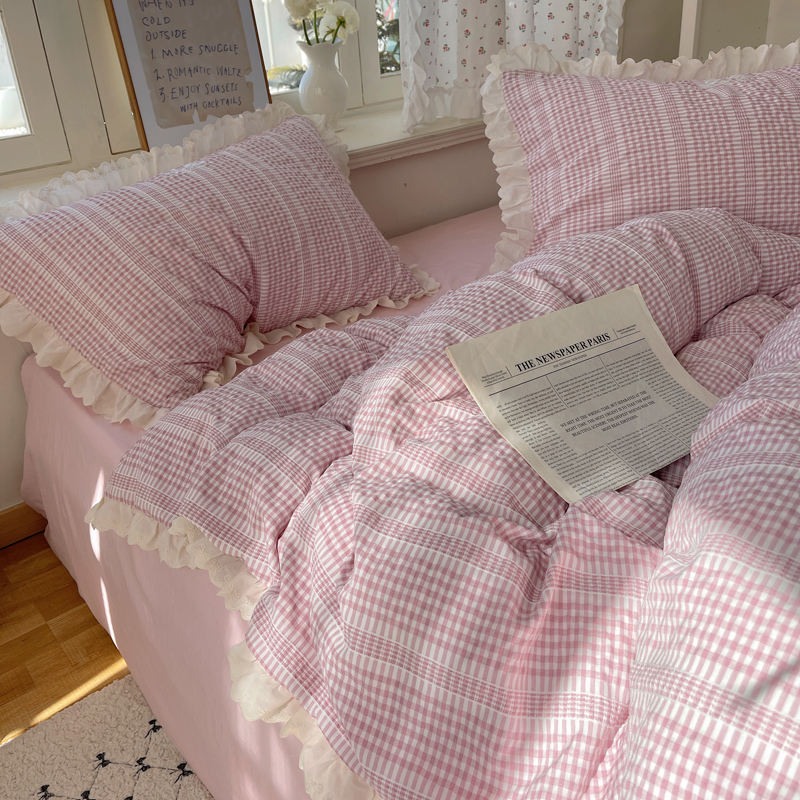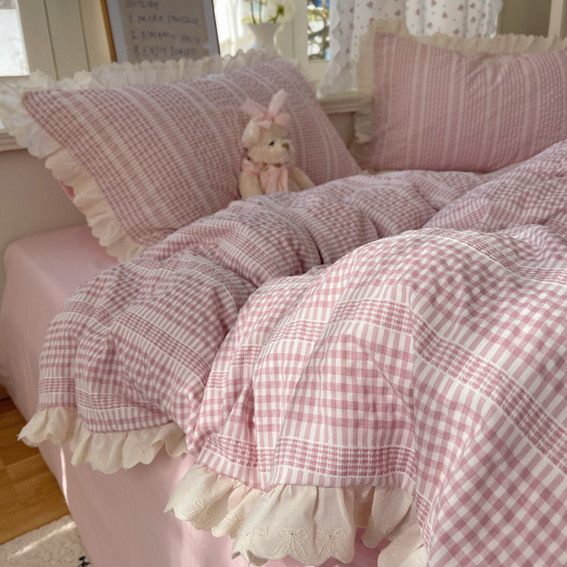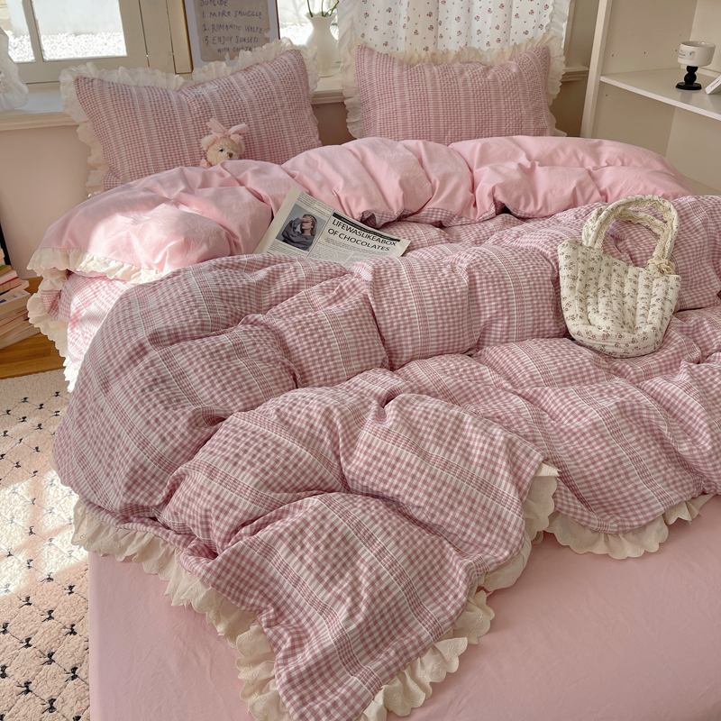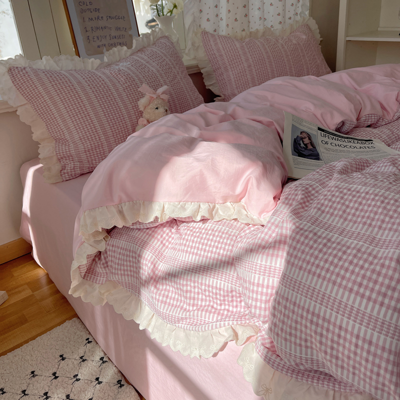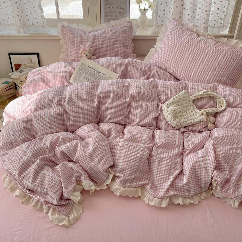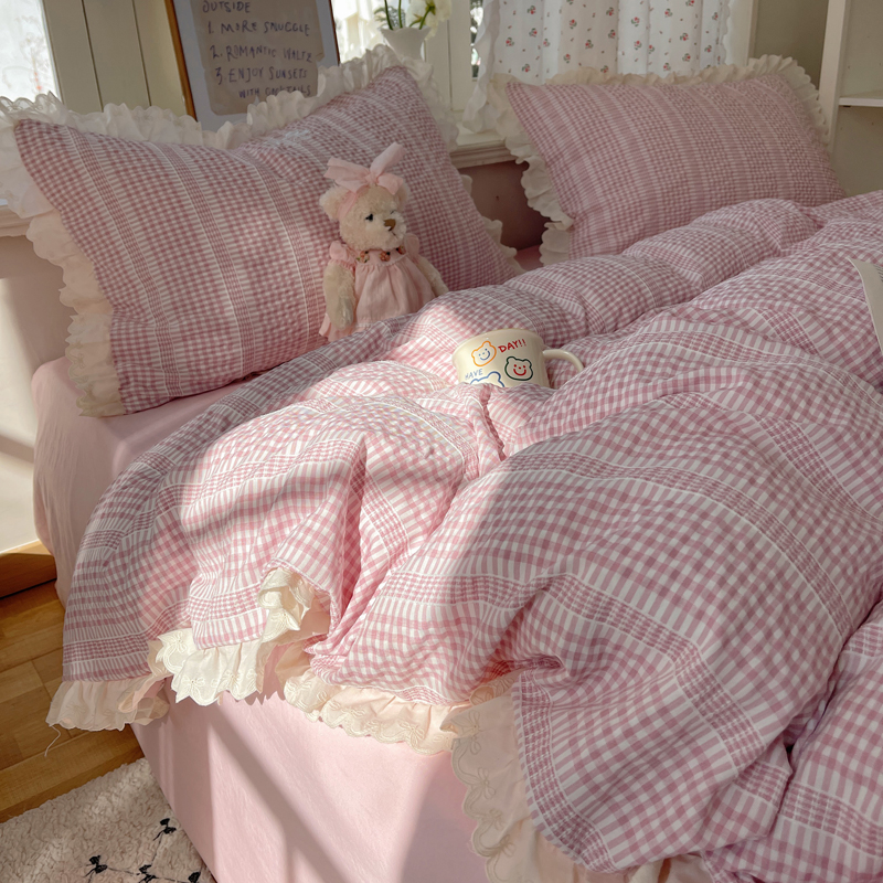 商品名称:轻奢坊 2025新款色织提花格子水洗棉仙仙花边安妮四件套 花边安妮-粉