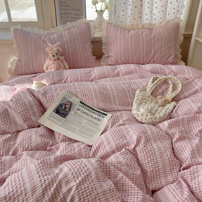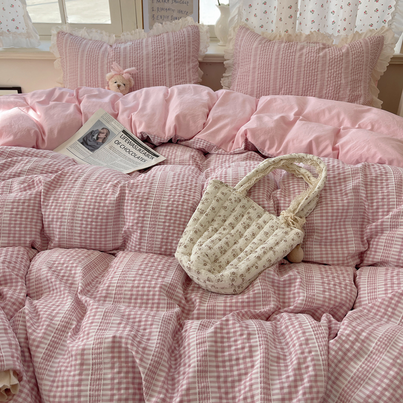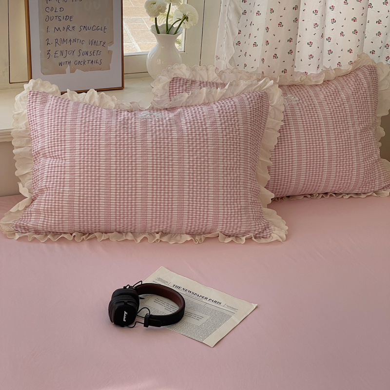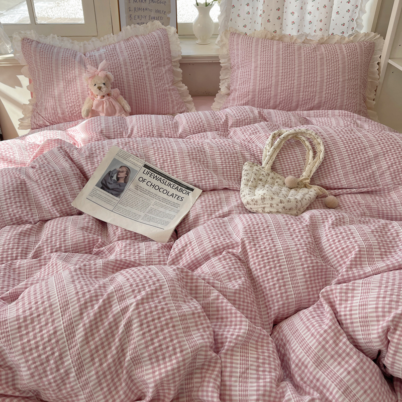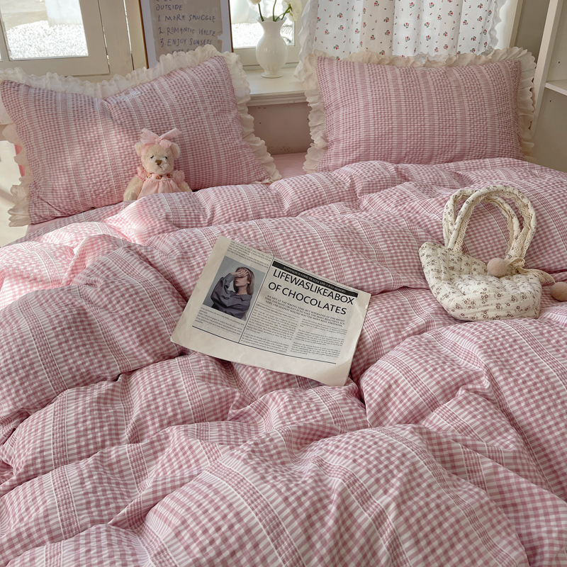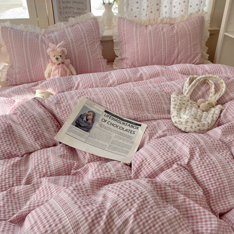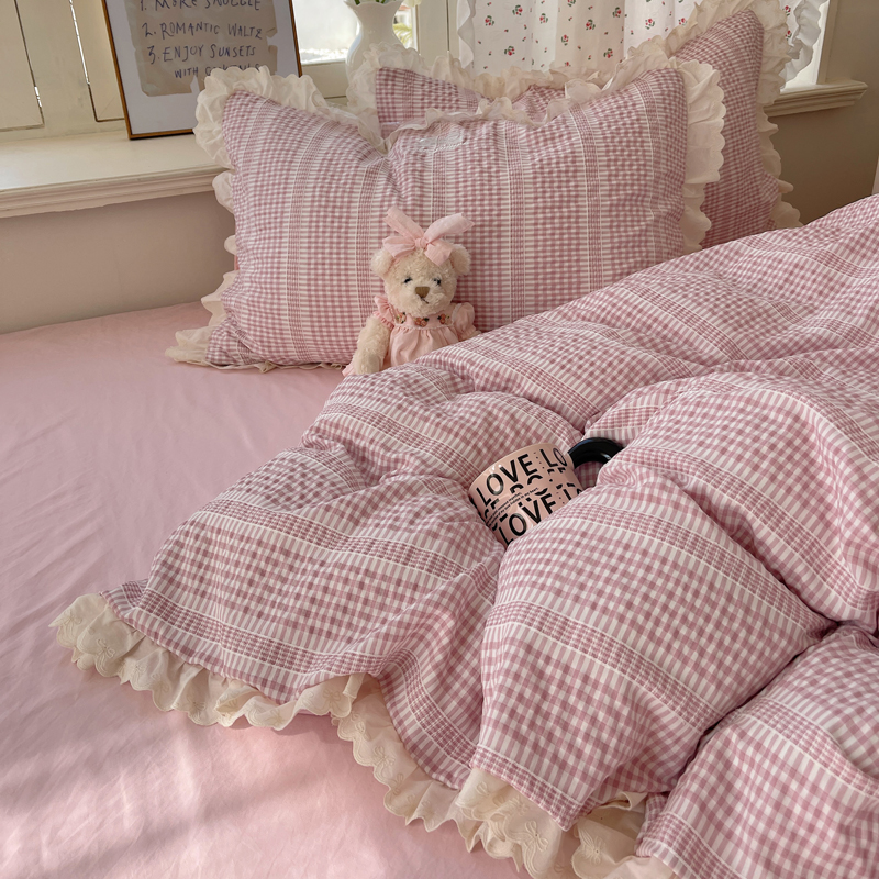 轻奢坊 2025新款色织提花格子水洗棉仙仙花边安妮四件套 花边安妮-粉