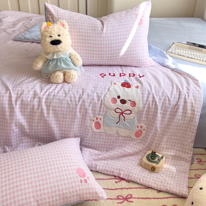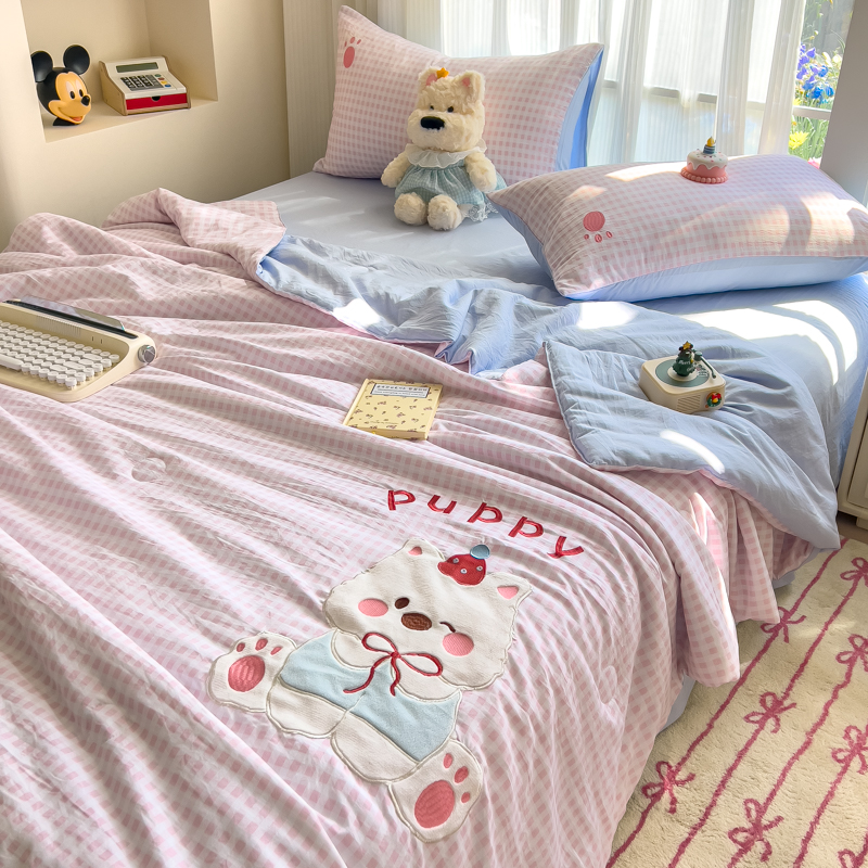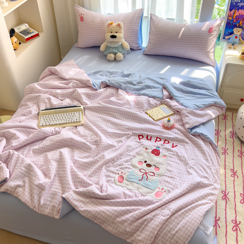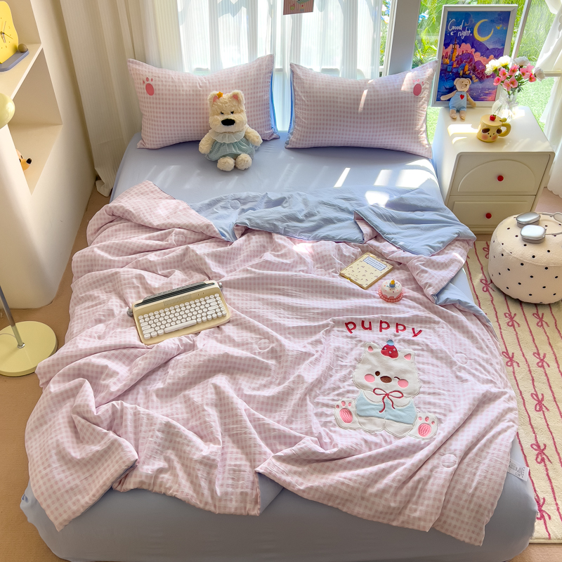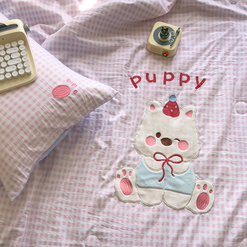 商品名称:N先生+V 13814689556 发大图/买家秀 2025新款超柔水洗棉贴布绣夏被夏凉被空调被-微笑狗狗系列 微笑狗狗夏被-粉格