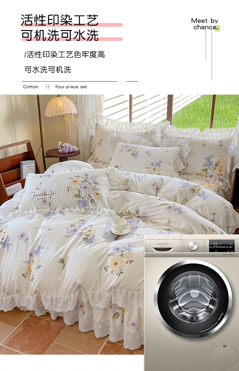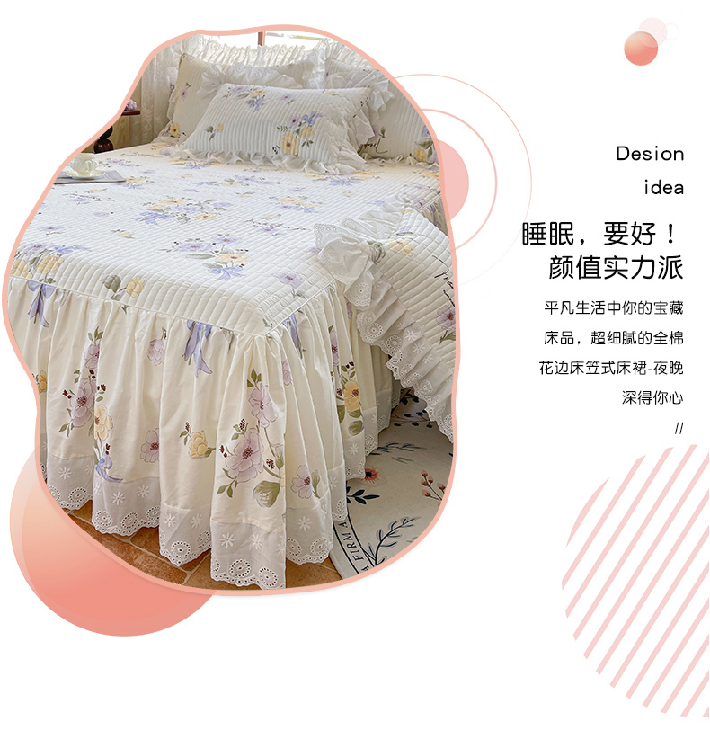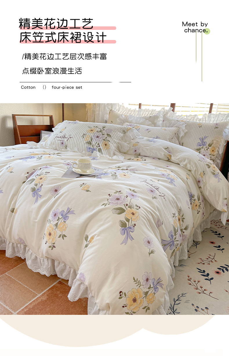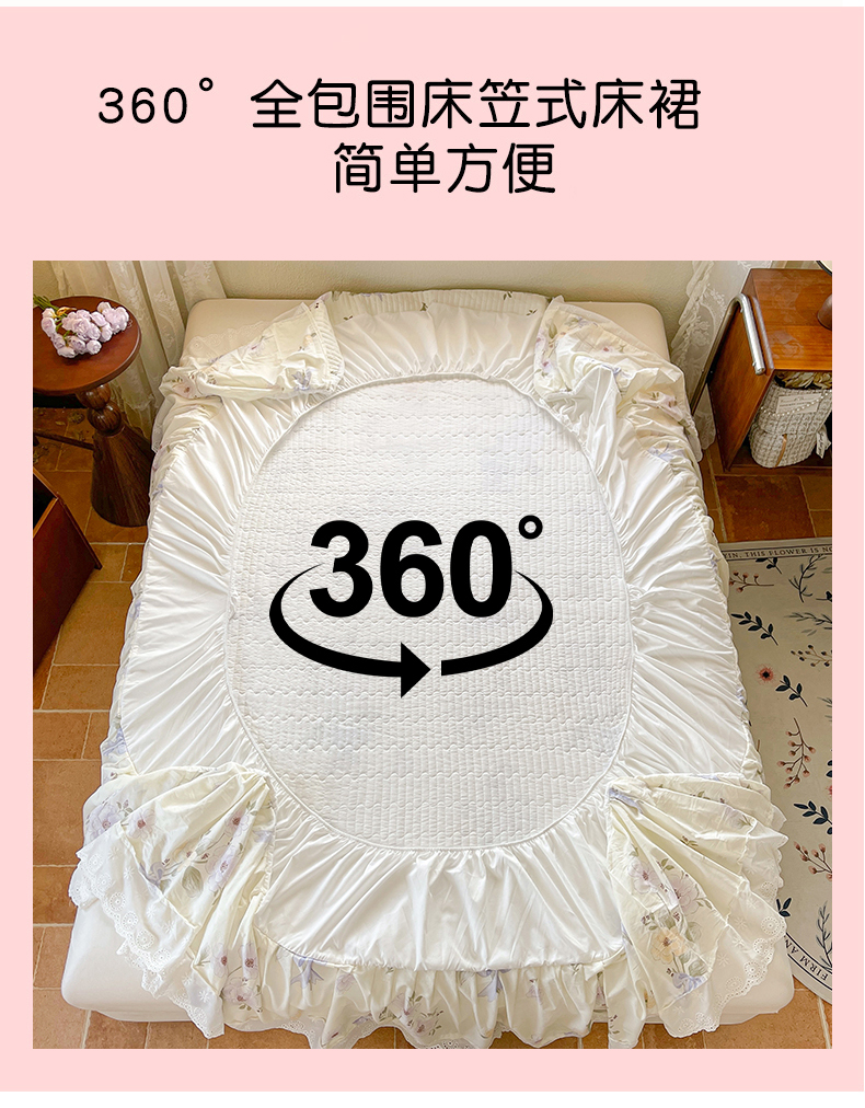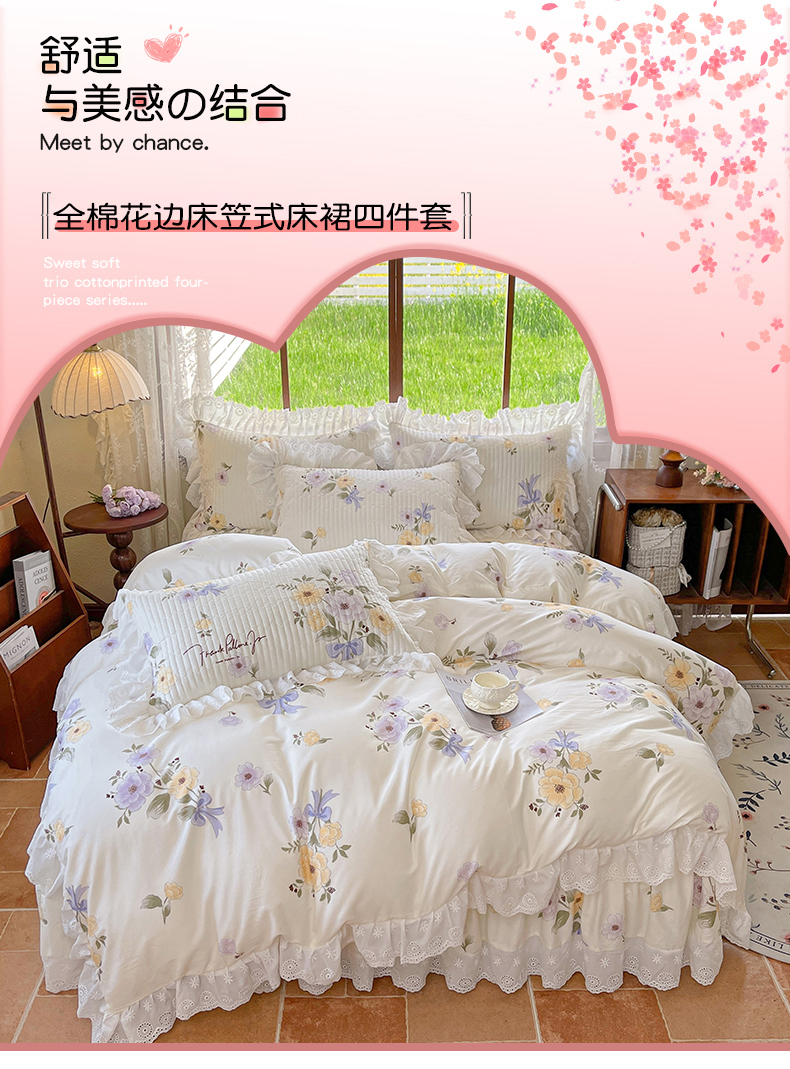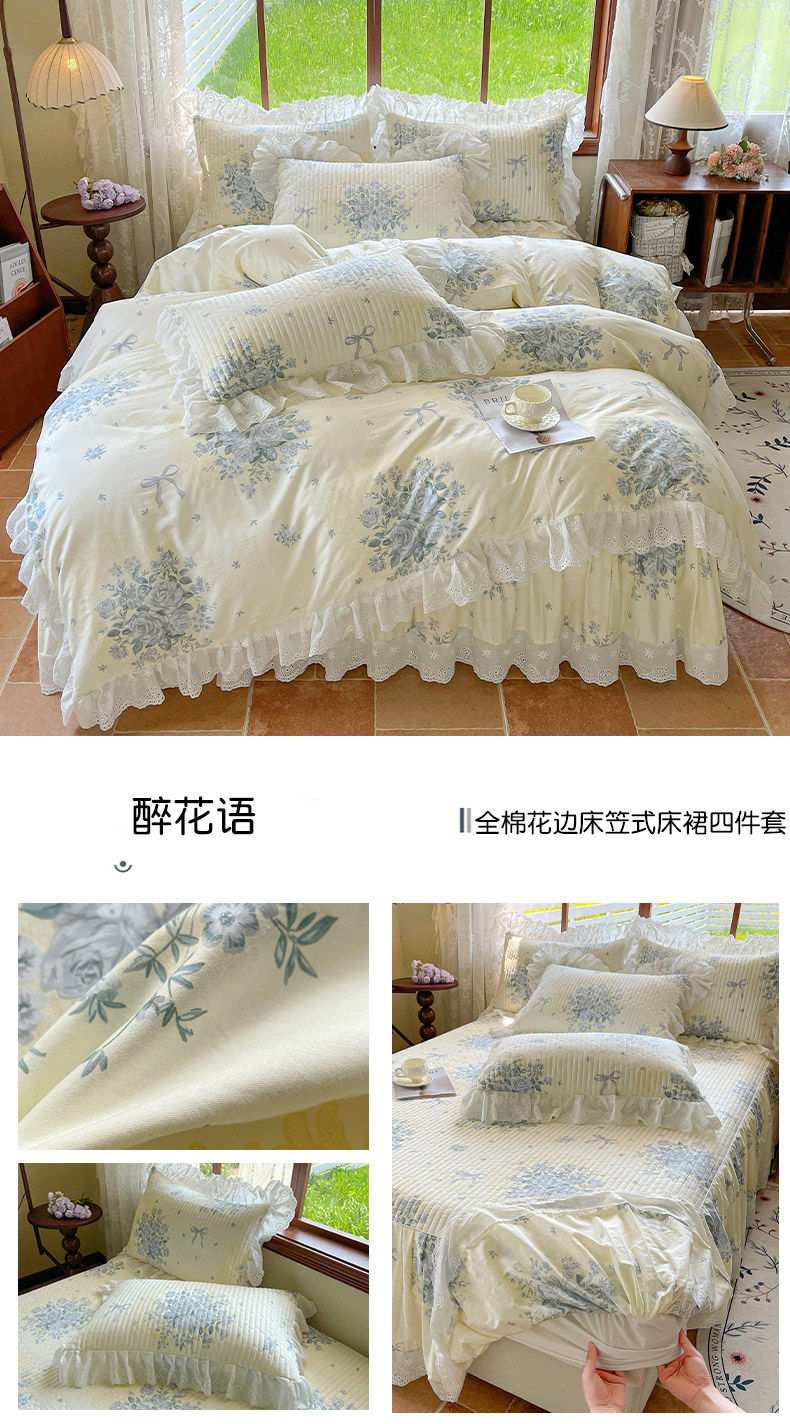 当前位置: 91家纺网 > 商品网购 > 床品套件 > 四件套 > 全棉普通四件套 > 罗艺轩 2025新款全棉印花床笠式花边床裙四件套 迷雾花漾