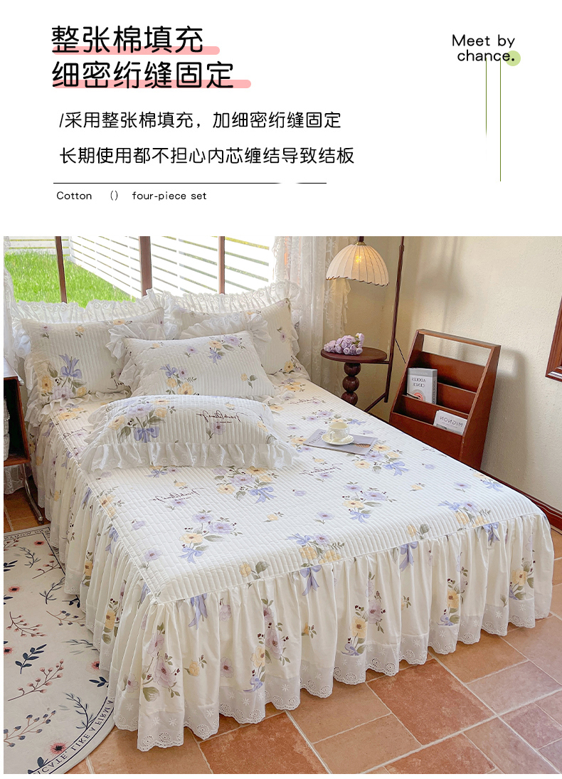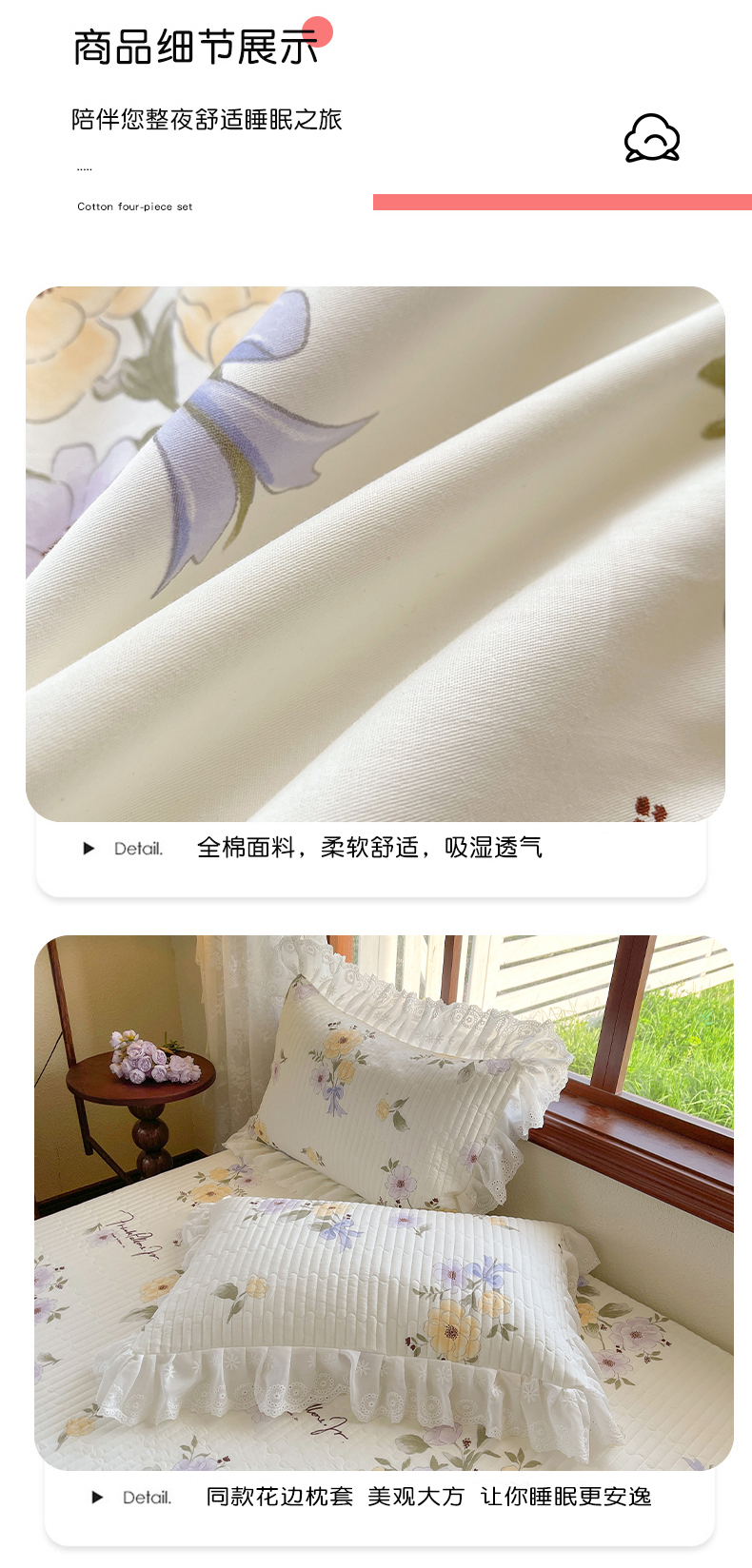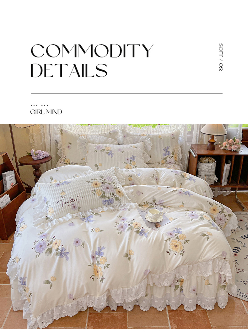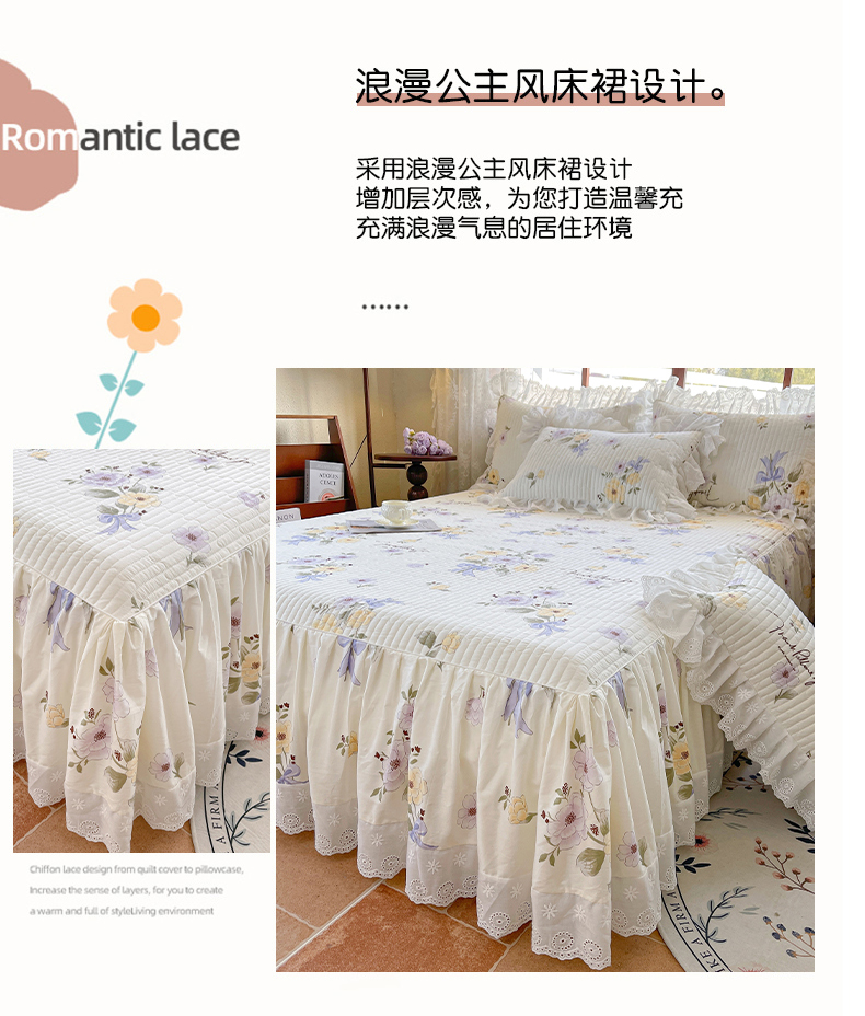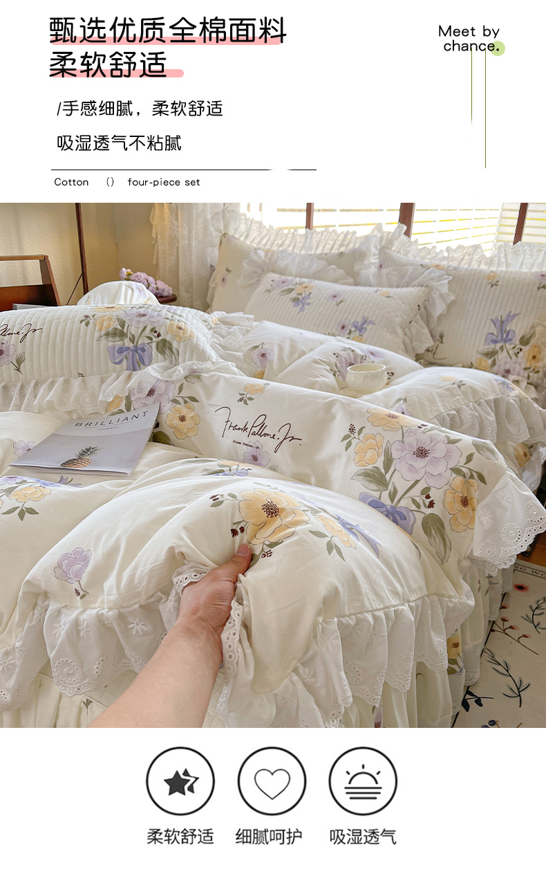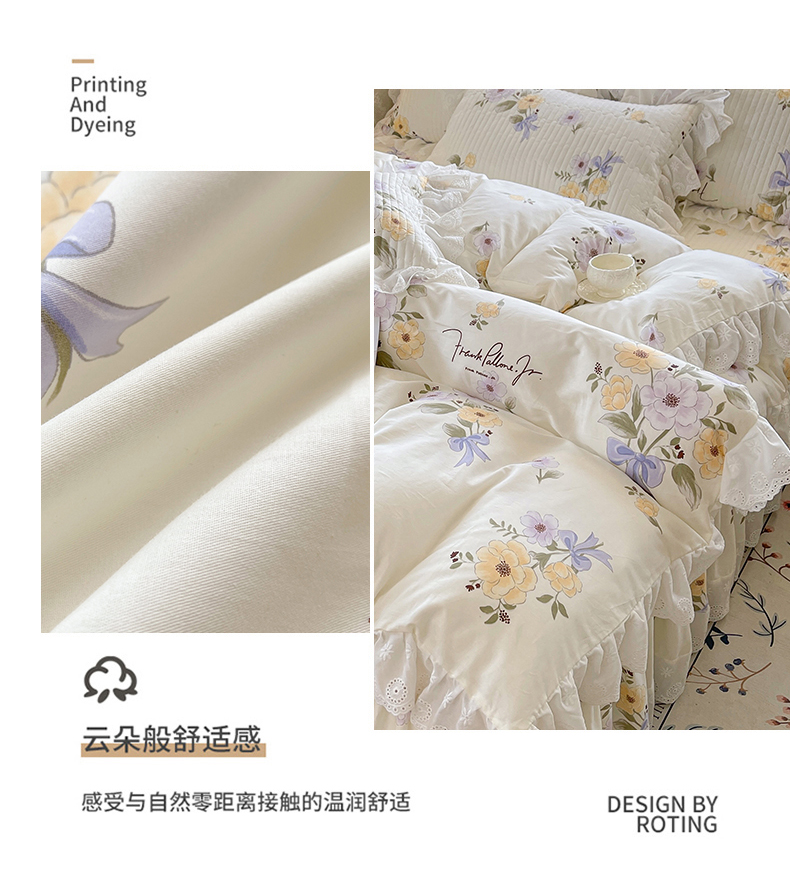 当前位置: 91家纺网 > 商品网购 > 床品套件 > 四件套 > 全棉普通四件套 > 罗艺轩 2025新款全棉印花床笠式花边床裙四件套 迷雾花漾