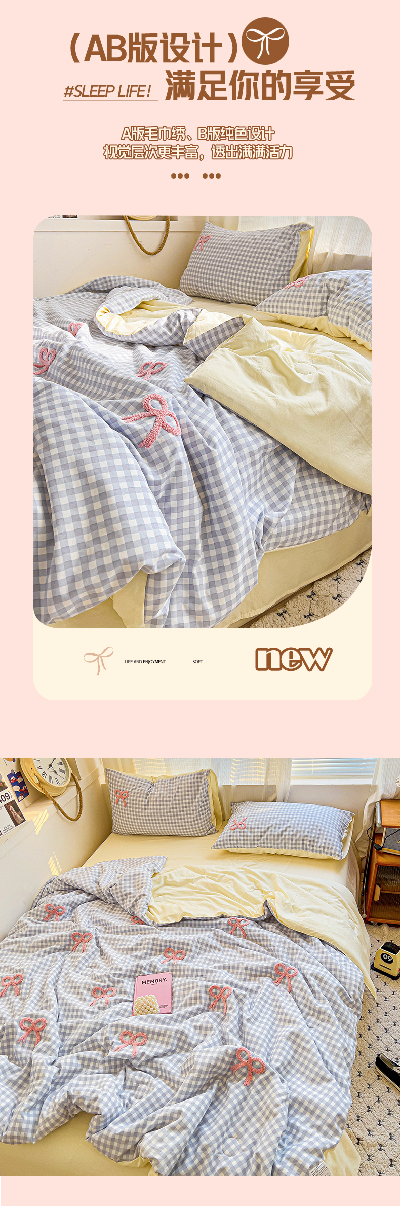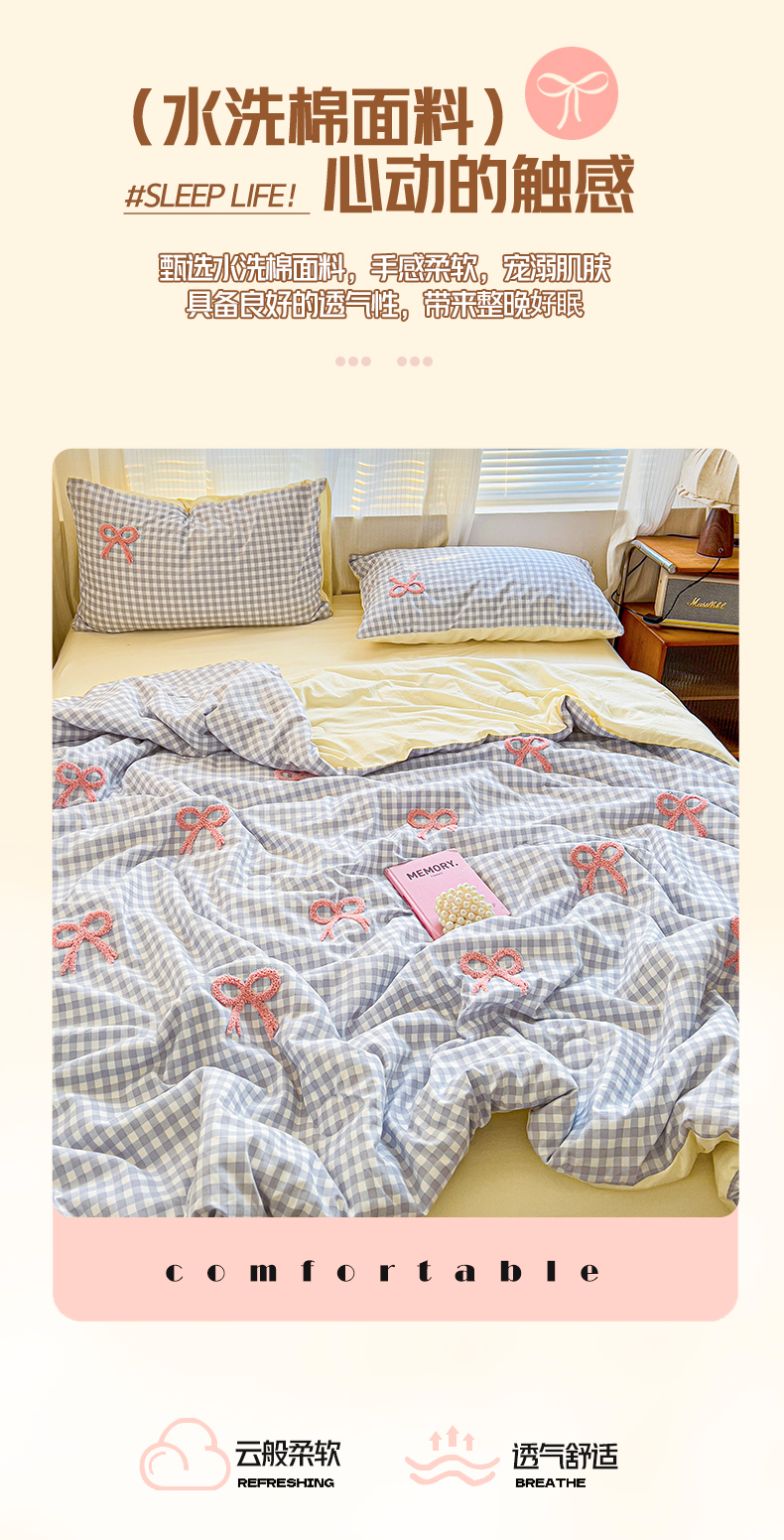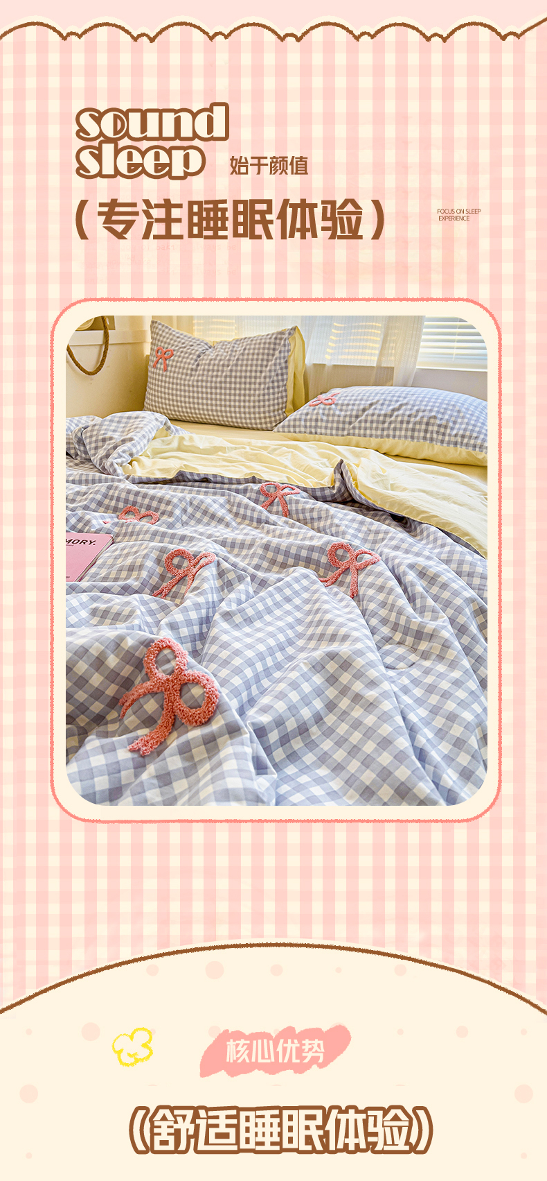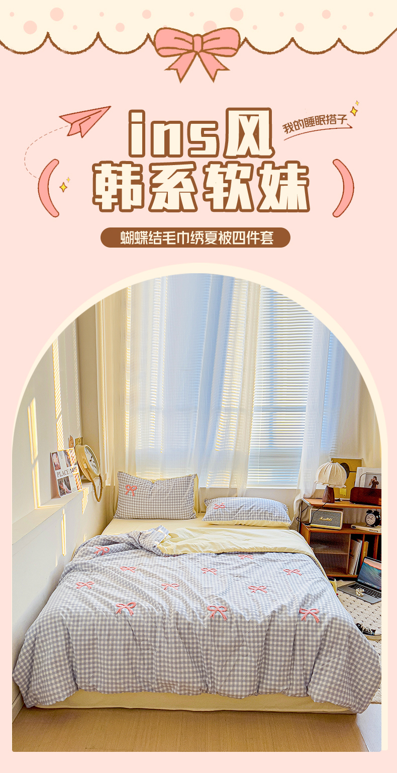 • 91家纺网 家纺一手货源 找家纺 灰鲸 2025新款云朵棉毛巾绣夏被四件套 蝴蝶结-蓝格+奶油黄