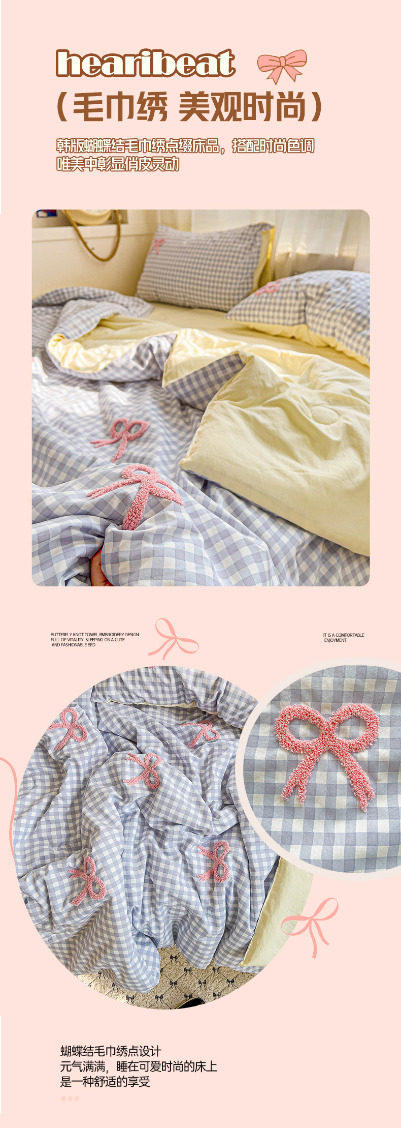 灰鲸 2025新款云朵棉毛巾绣夏被四件套 蝴蝶结-蓝格+奶油黄
