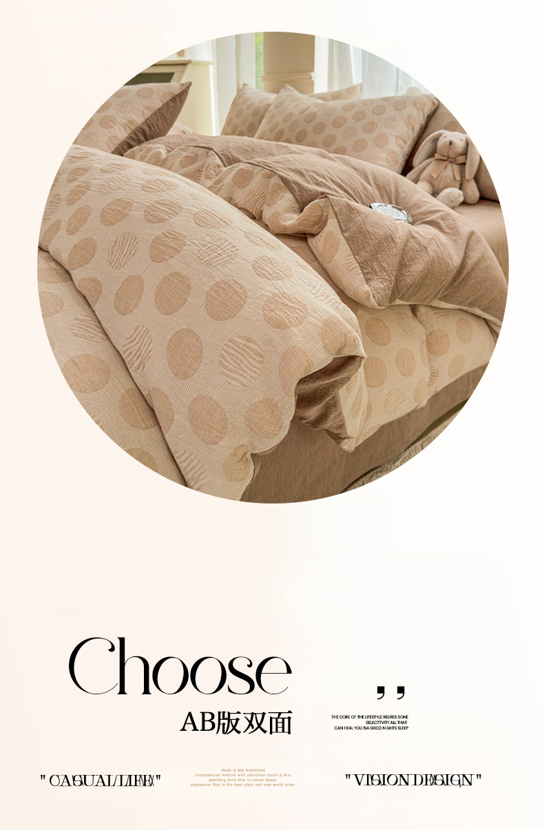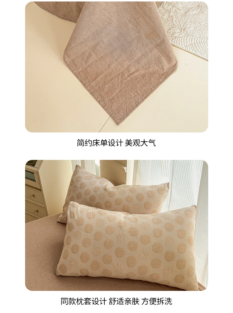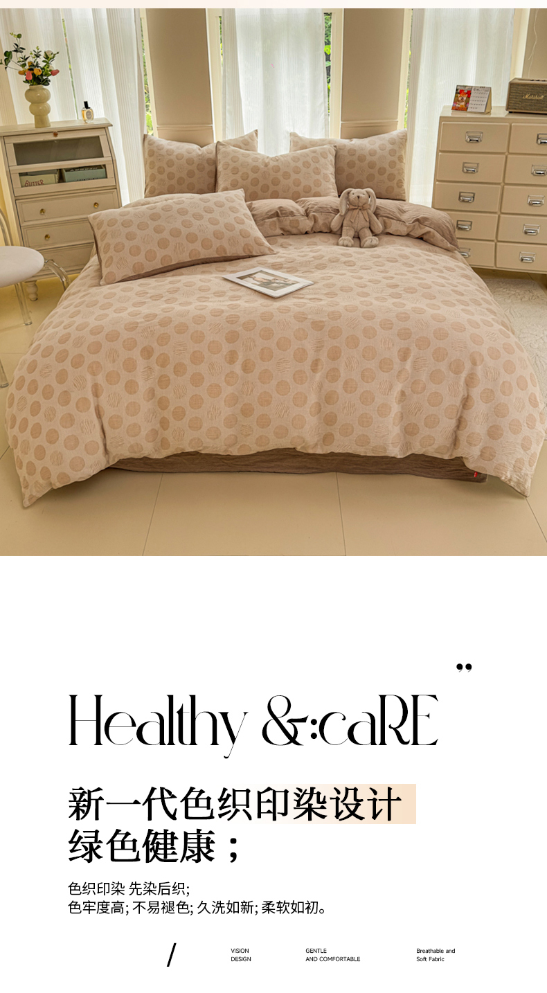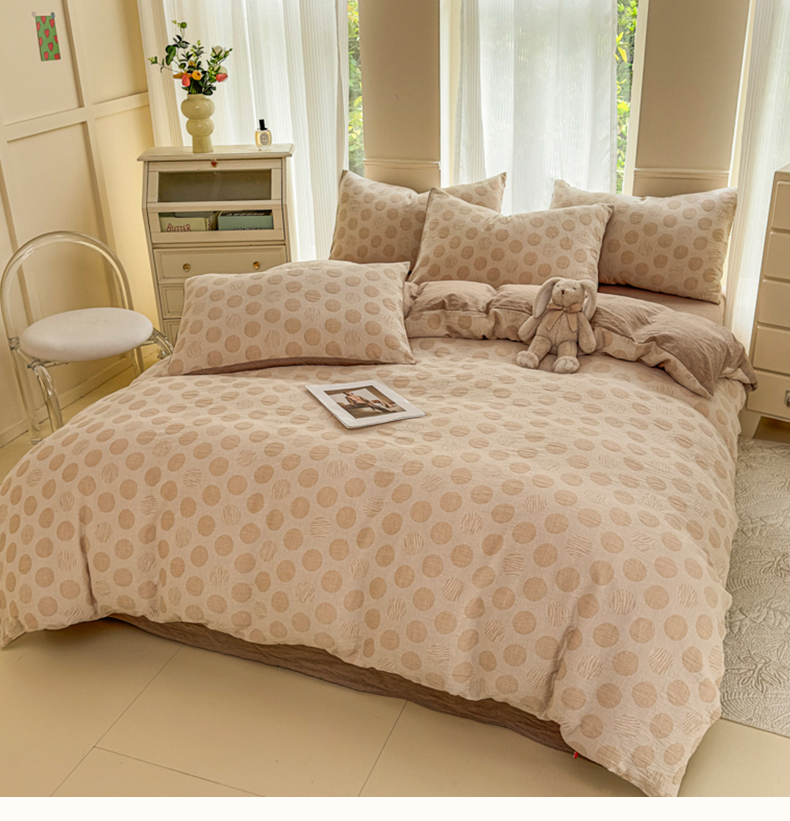 当前位置: 91家纺网 > 商品网购 > 床品套件 > 四件套 > 色织四件套 > 菡宝 2025新款a类母婴级纯棉全棉纯棉色织三层纱提花系列四件套 波点-卡其