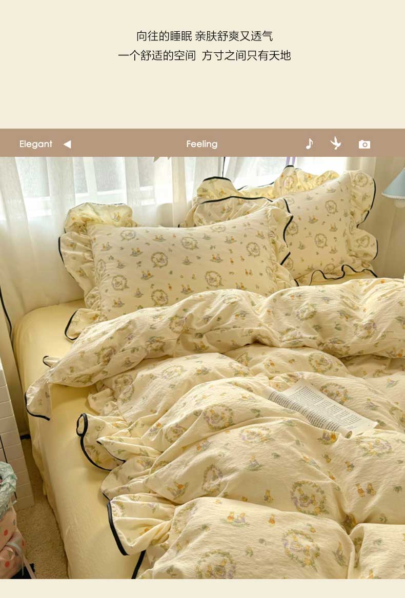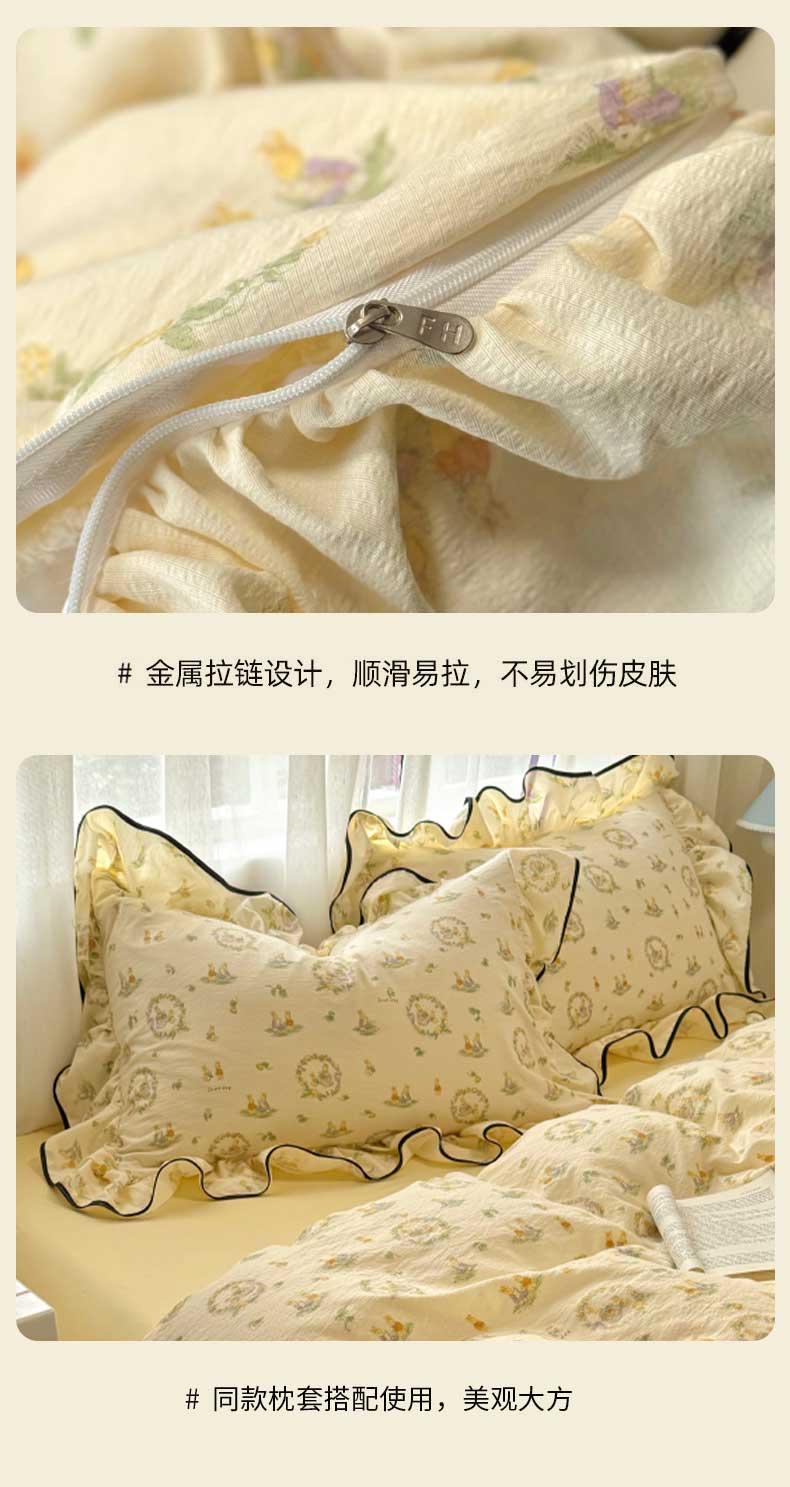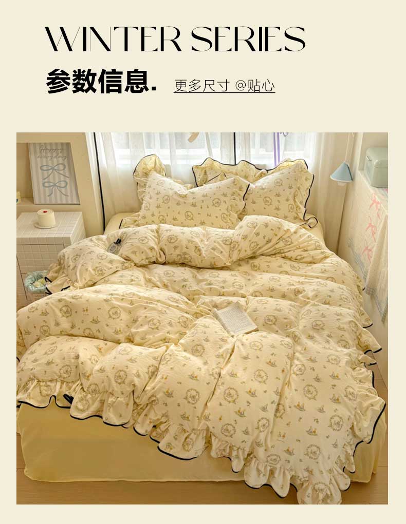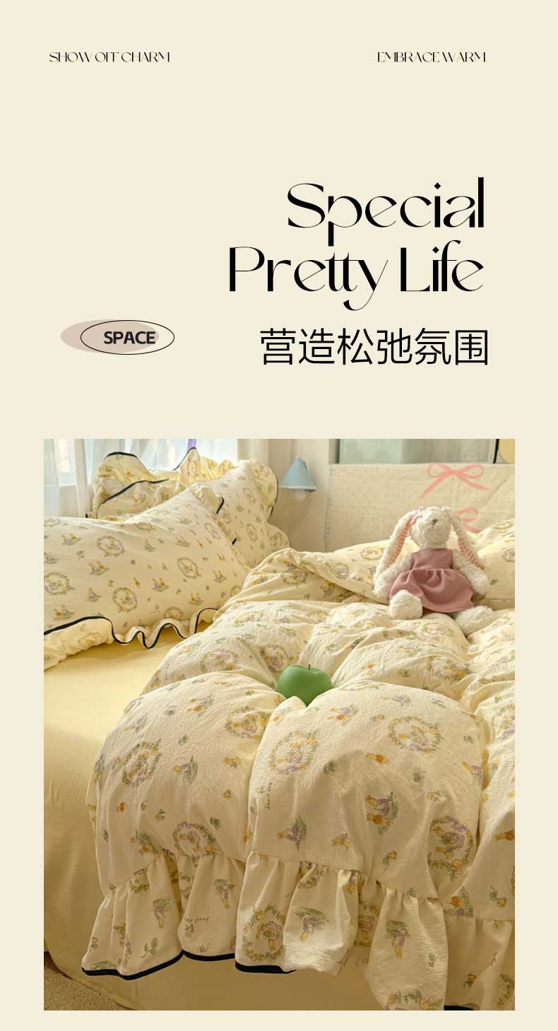 当前位置: 91家纺网 > 商品网购 > 床品套件 > 四件套 > 水洗棉四件套 > 繁花家居 2025春夏新款学生季韩式云感针织棉大花边木耳边四件套 花环小兔