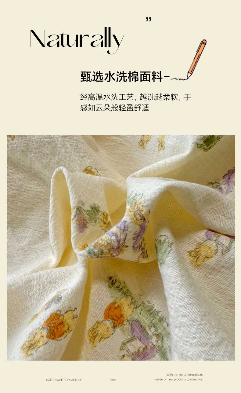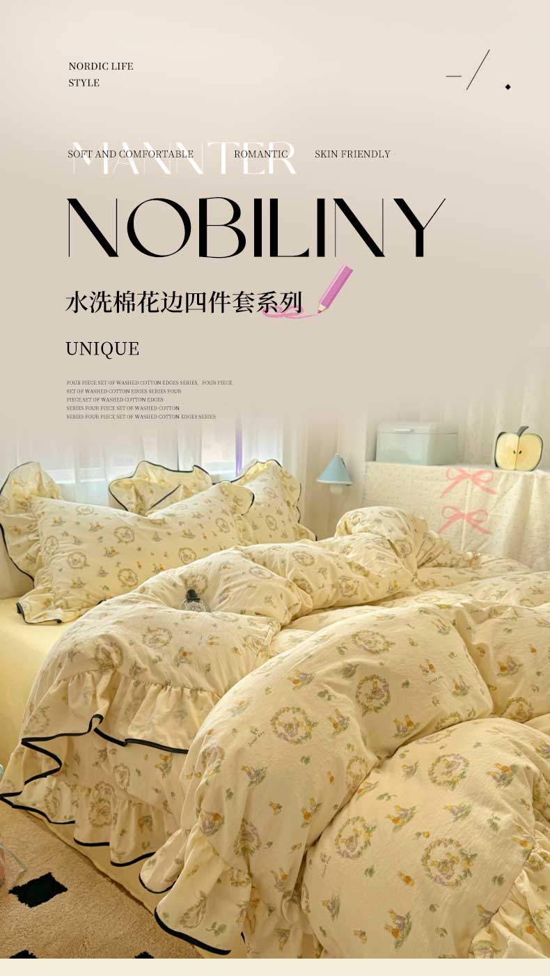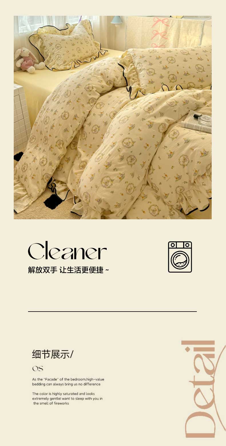 当前位置: 91家纺网 > 商品网购 > 床品套件 > 四件套 > 水洗棉四件套 > 繁花家居 2025春夏新款学生季韩式云感针织棉大花边木耳边四件套 花环小兔