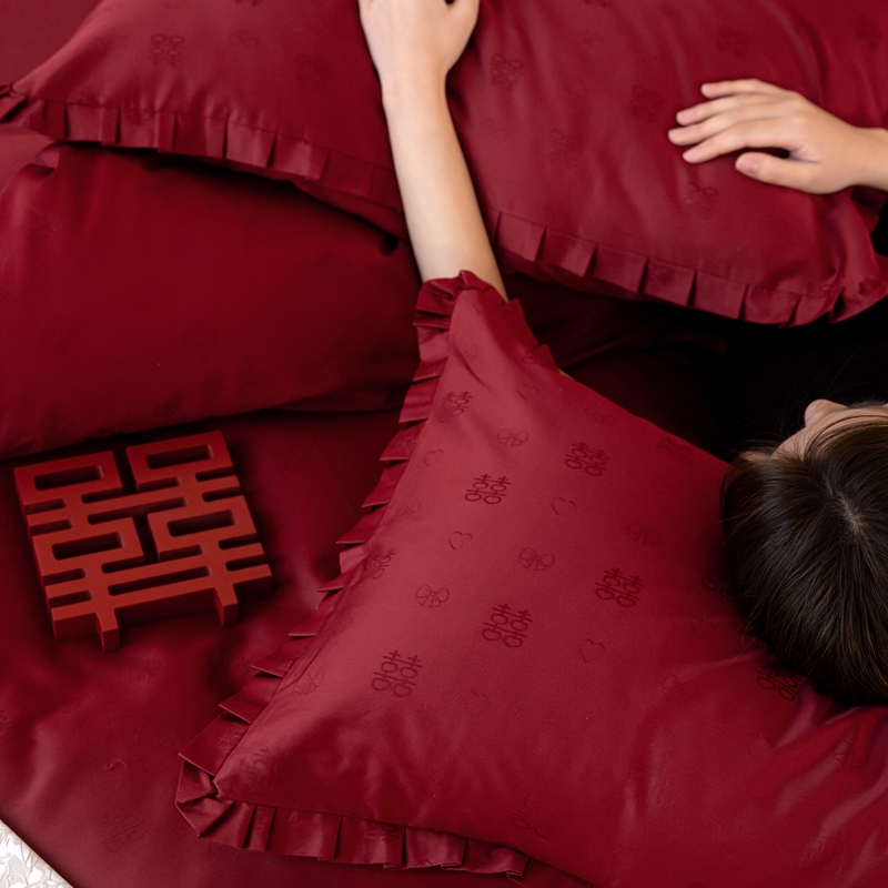 (总)优然居家纺 2025春夏新款木耳边喜字蝴蝶结小爱心复古红四件套-小欢喜,小欢喜