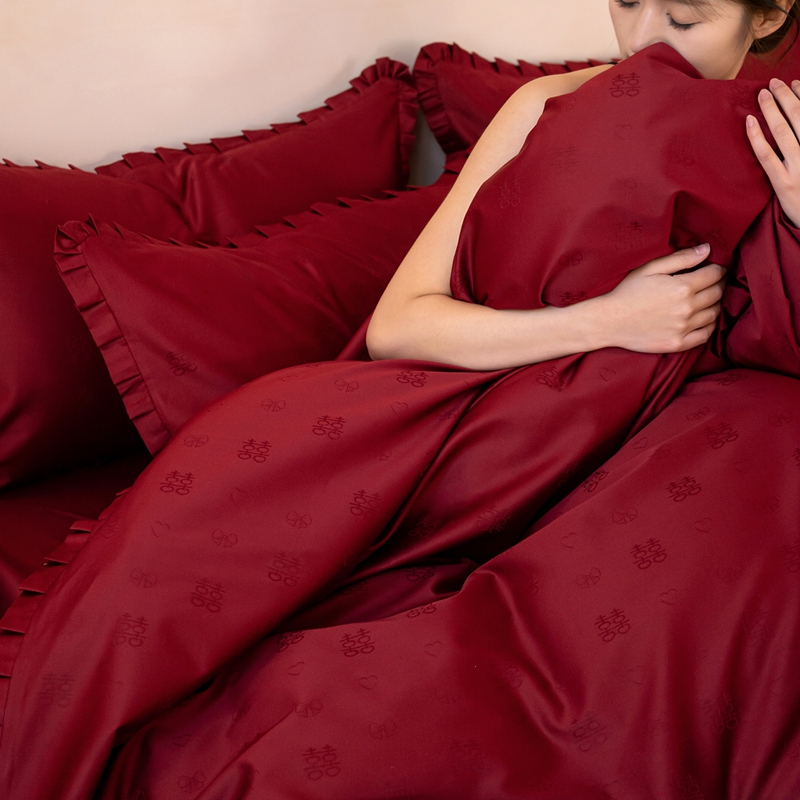 (总)优然居家纺 2025春夏新款木耳边喜字蝴蝶结小爱心复古红四件套-小欢喜