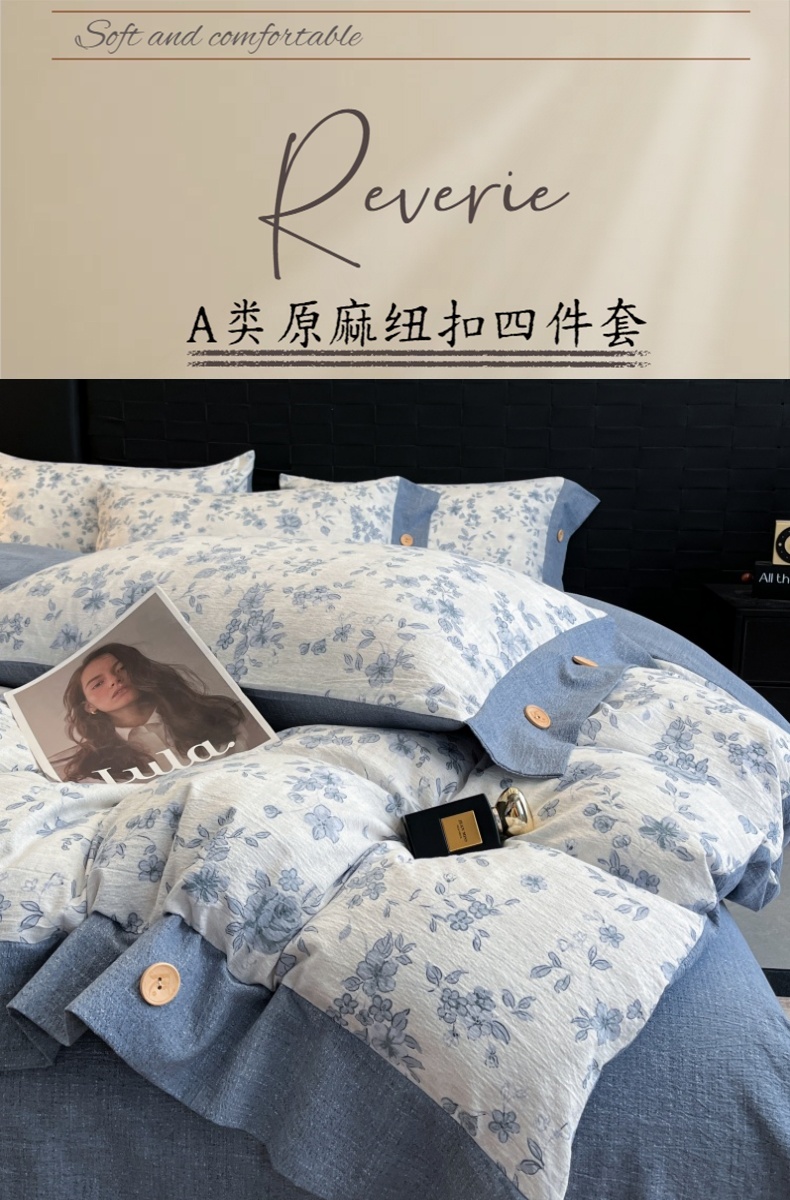 商品名称:圣比熊 2025新款原麻纽扣四件套加厚被套床单宿舍双人床仿亚麻套件 南阳旧梦