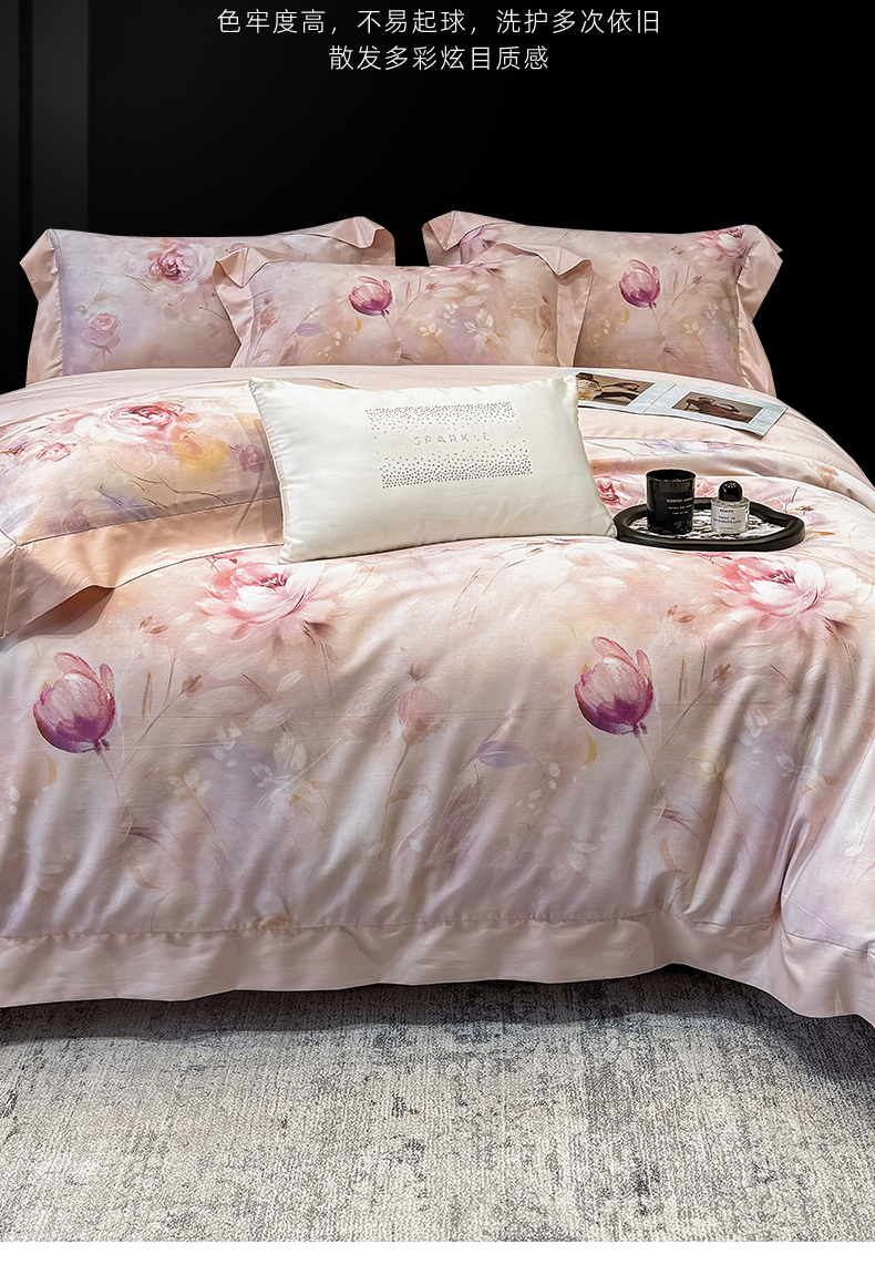 绒棉世家 2025新款80S贡缎长绒棉拼角工艺数码印花四件套 含羞待放-緑