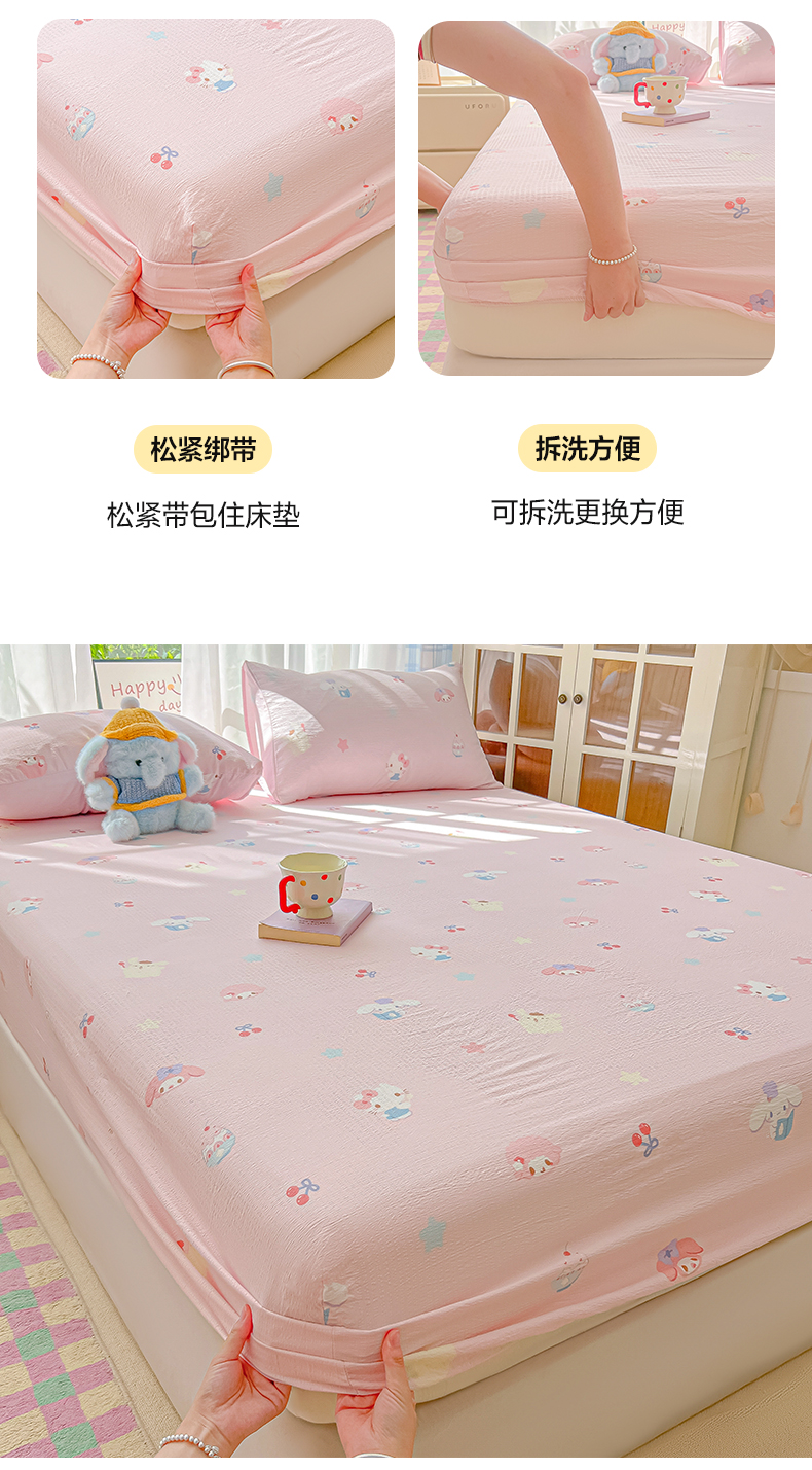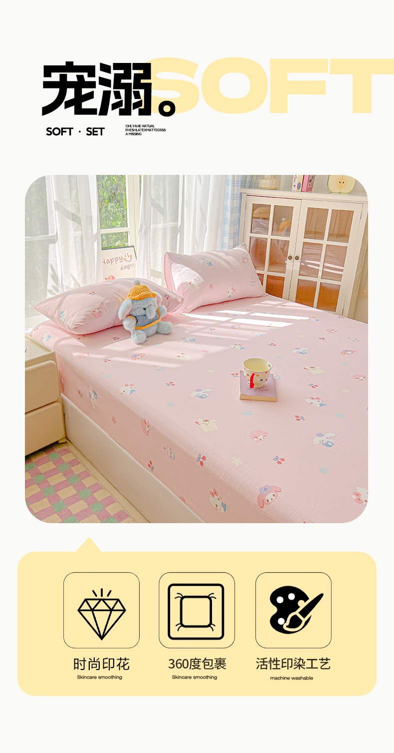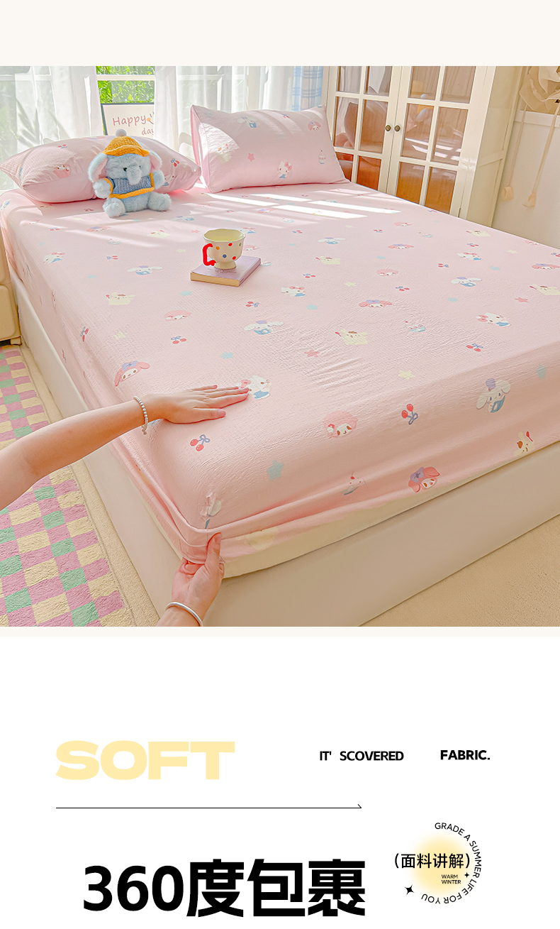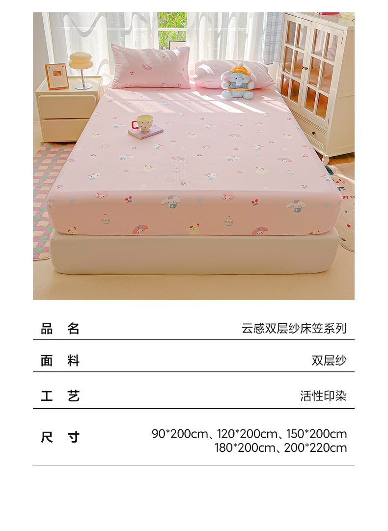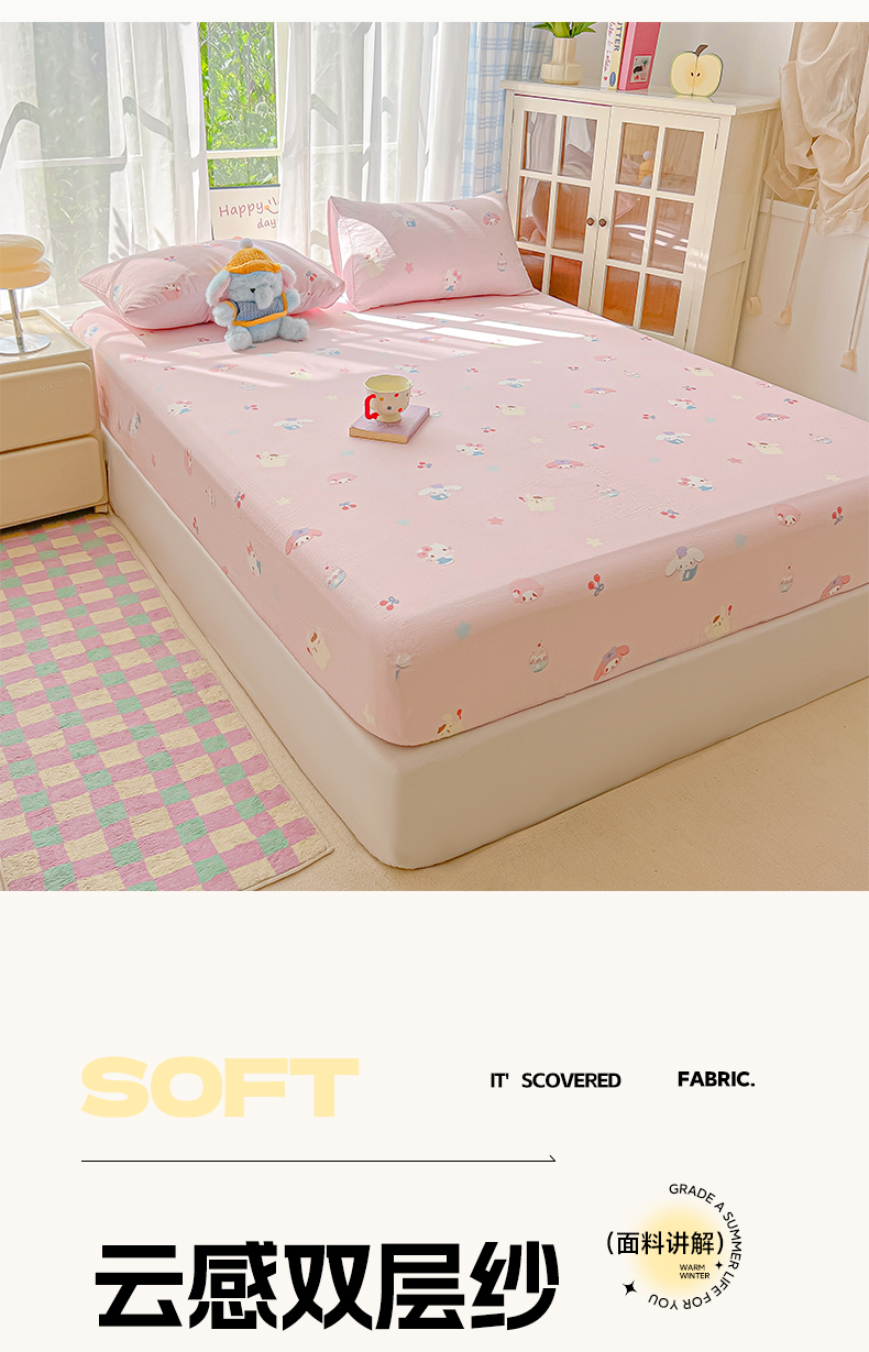 • 91家纺网 家纺一手货源 找家纺 韩巢家纺 2025新款卡通双层纱床笠单品床笠床笠单件热销款防滑床单床套枕套三件套 萌物家族