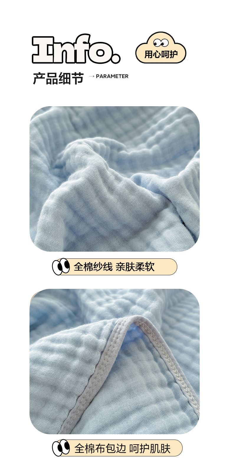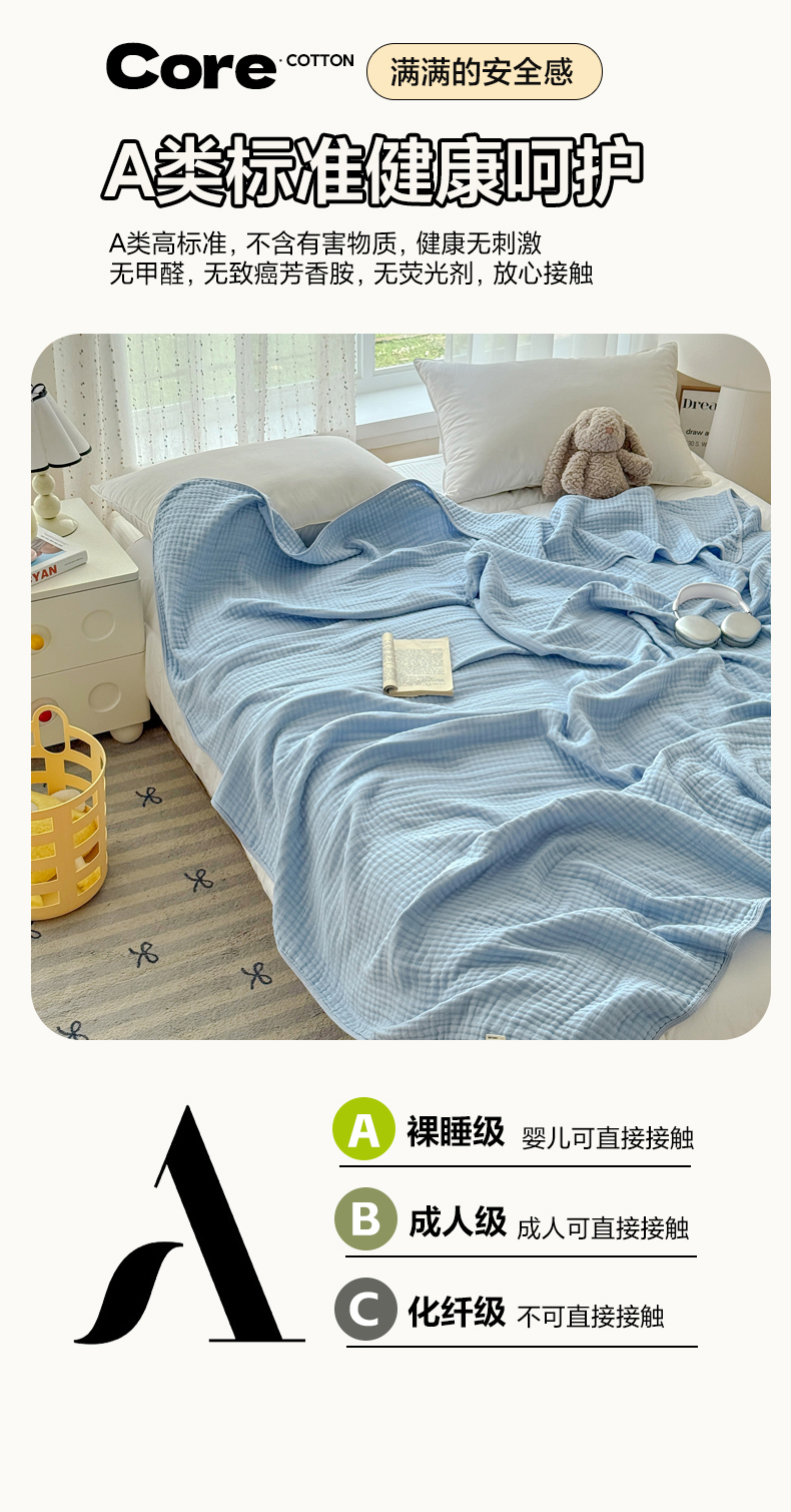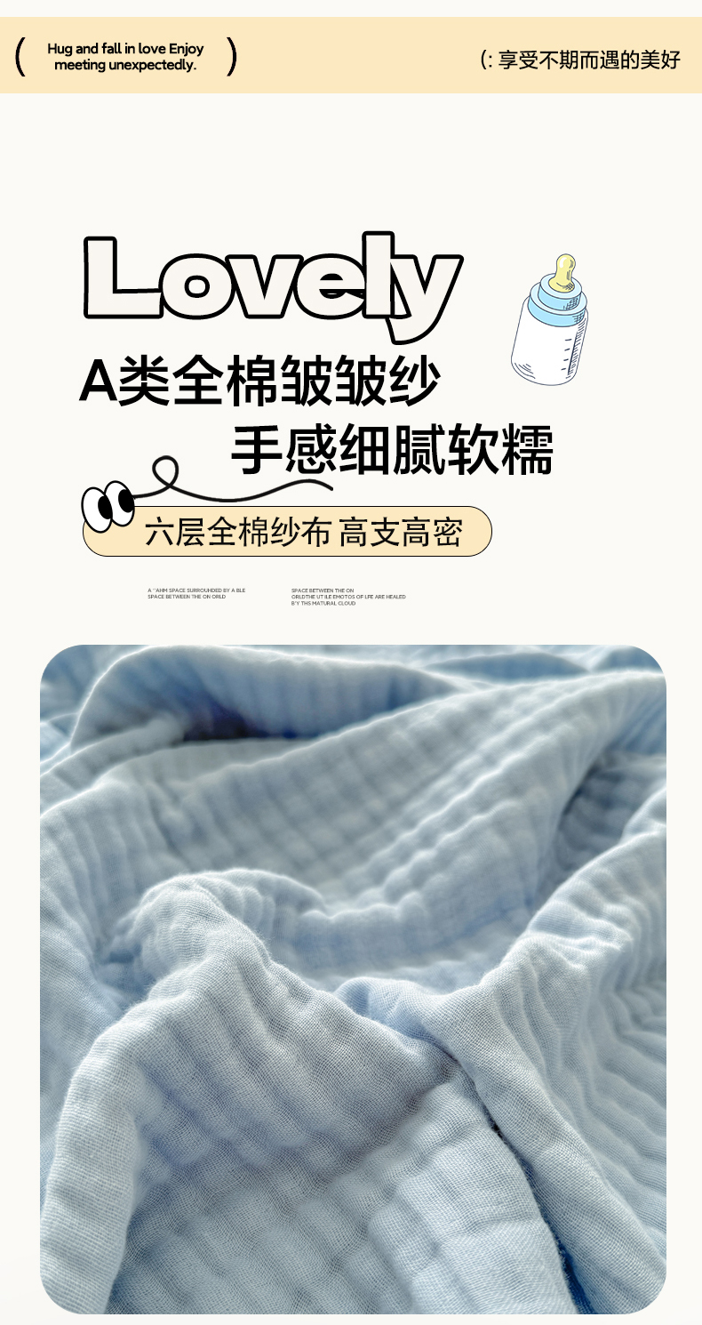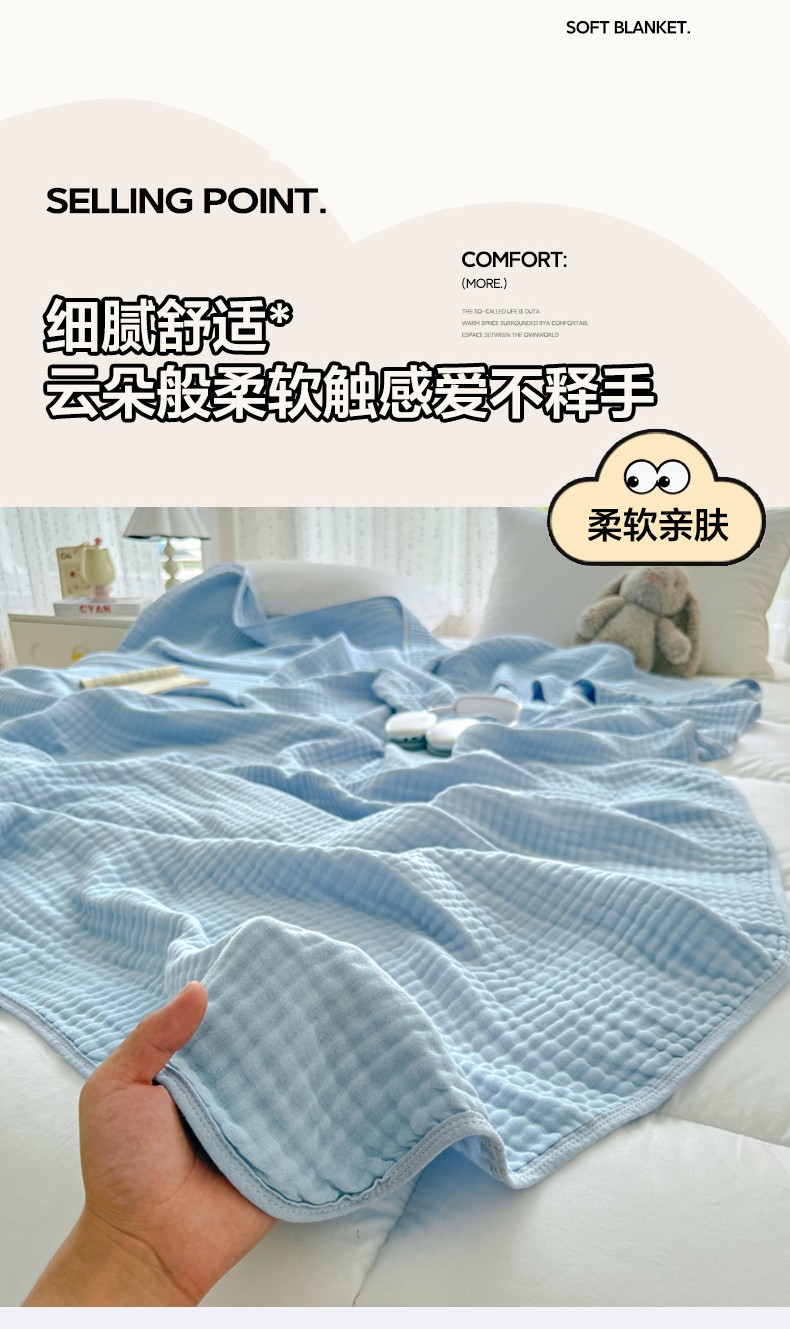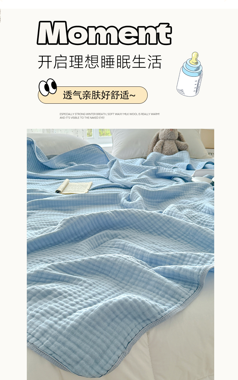 商品名称:棠薇家纺 2025新款A类日韩无印风泡泡纱六层素色纯色盖毯毛巾被夏被皱皱毯婴幼毯浴巾 泡泡纱天蓝