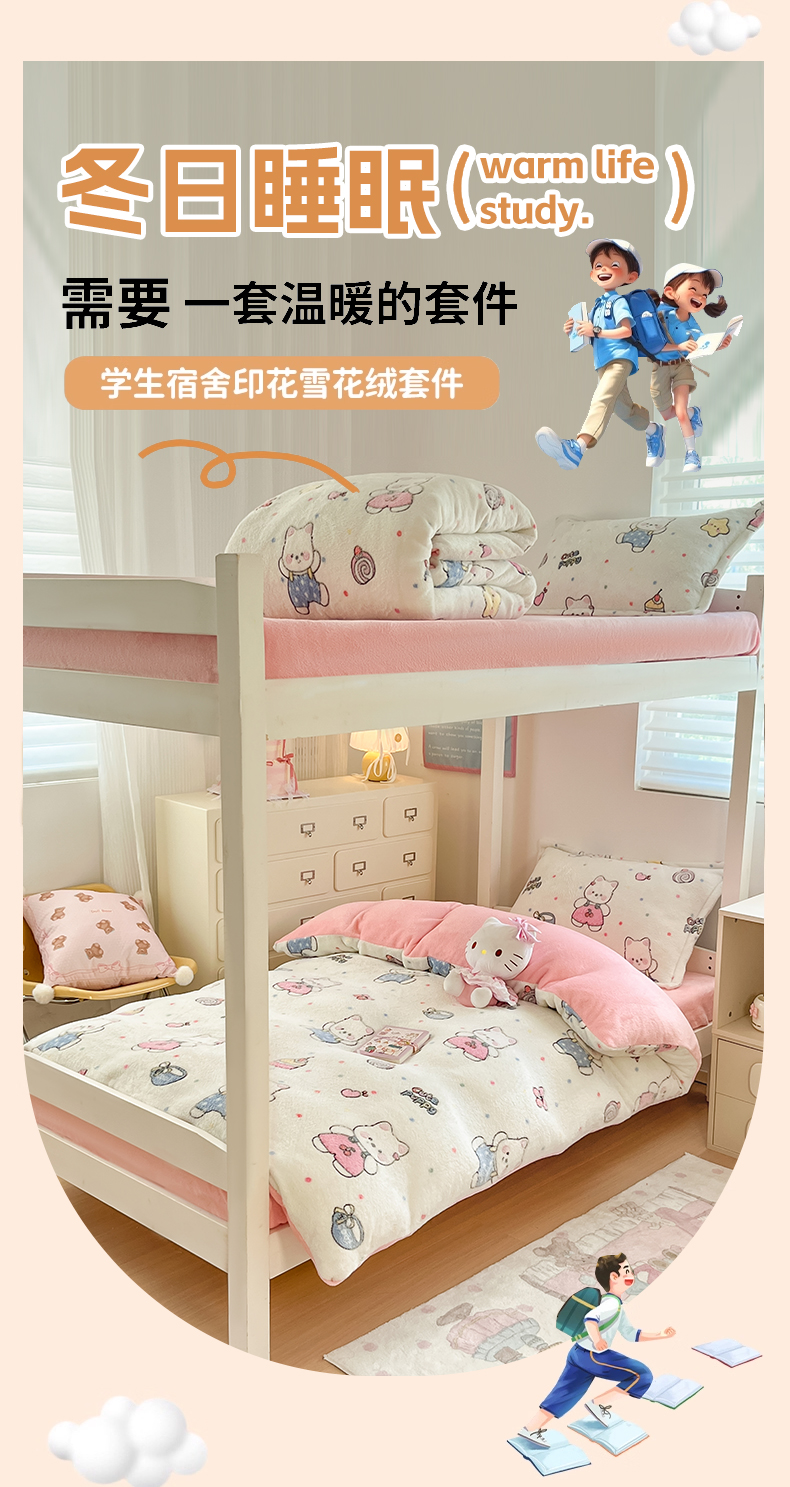 当前位置: 91家纺网 > 商品网购 > 床品套件 > 四件套 > 其它四件套 > 川悦生活 2025新款立体雪花绒印花四件套学生床系列二场景一 派对西高地