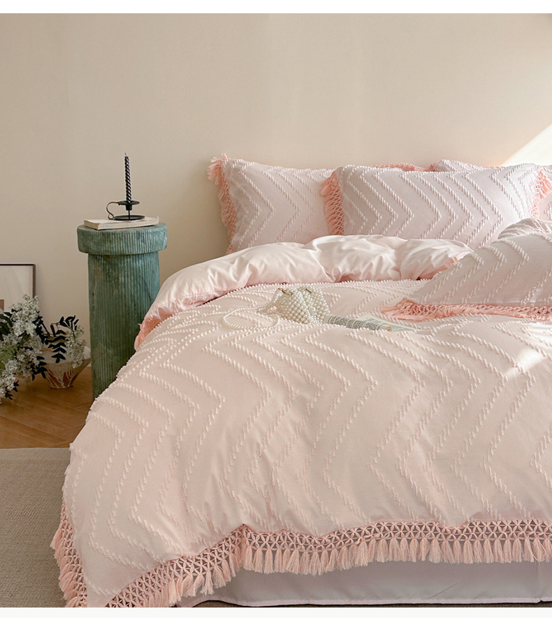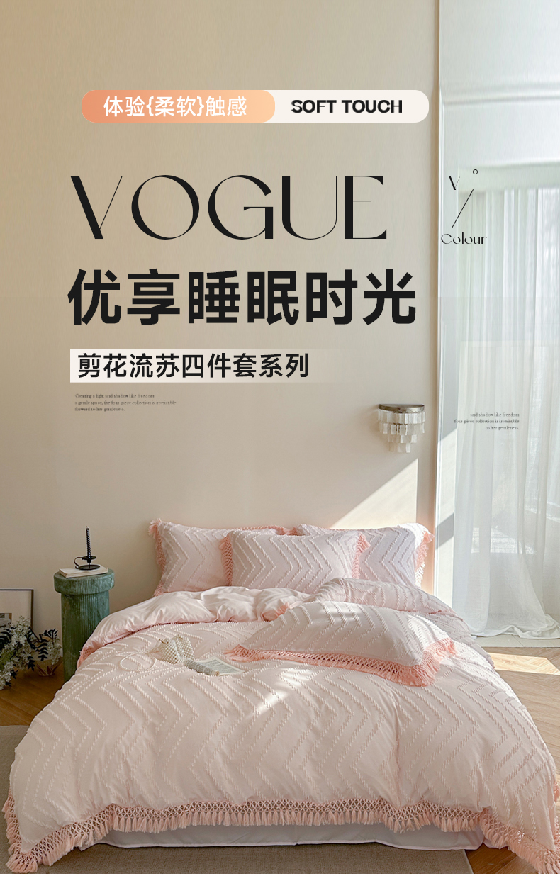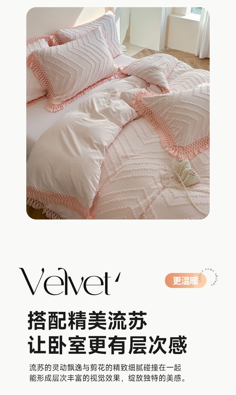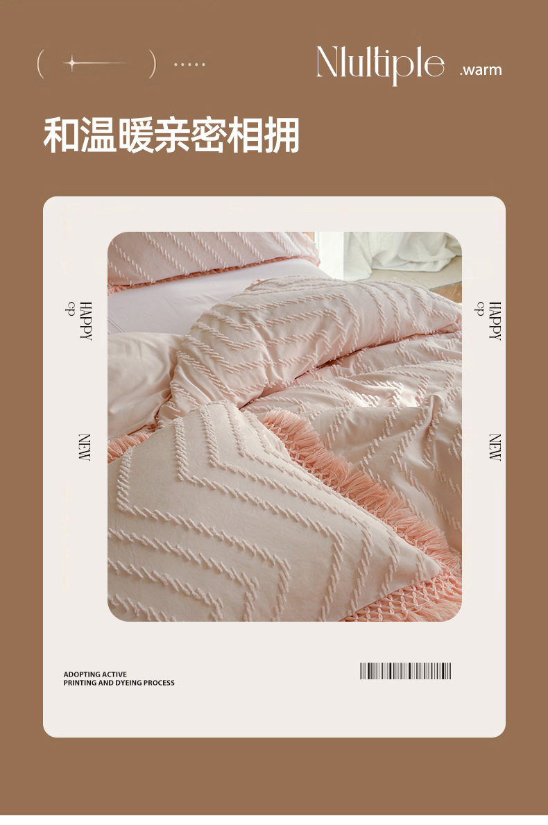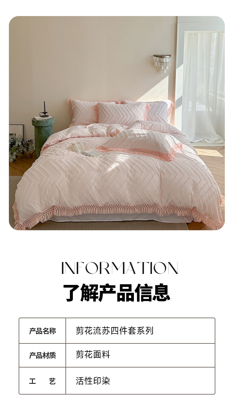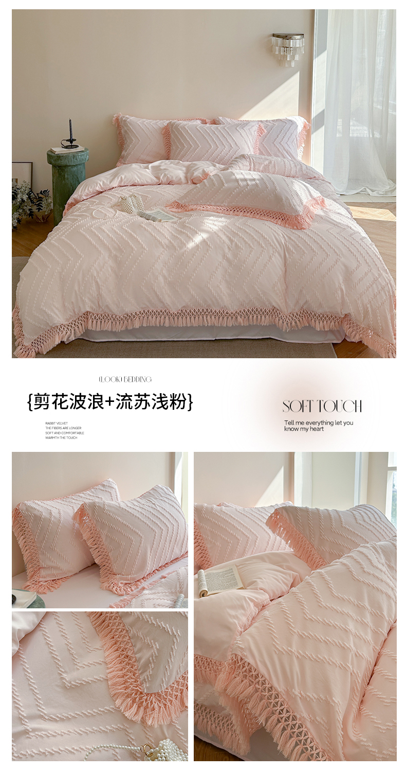 当前位置: 91家纺网 > 商品网购 > 床品套件 > 四件套 > 其它四件套 > 缘生活 2025新款素色简约立体剪花流苏四件套 剪花波浪+流苏浅粉