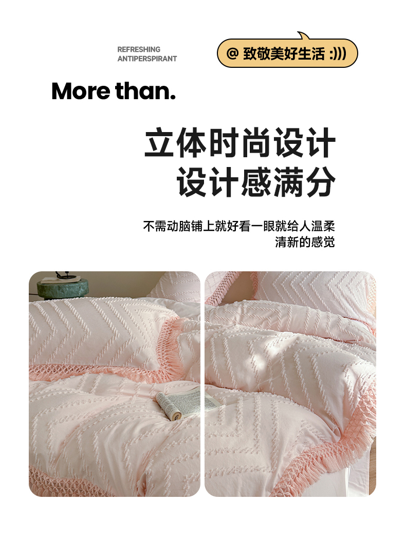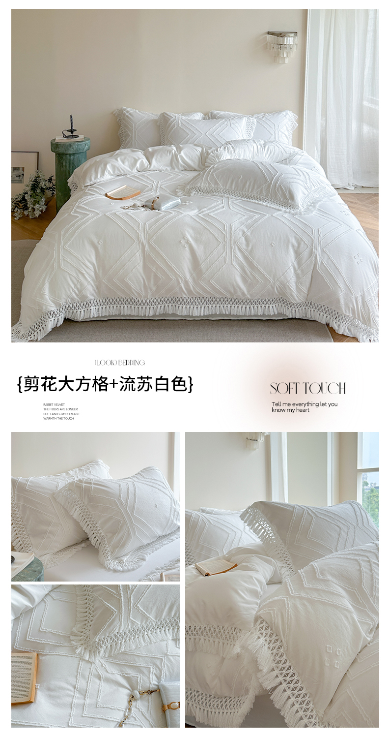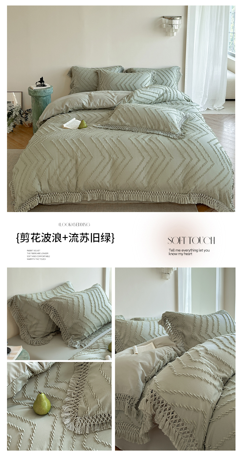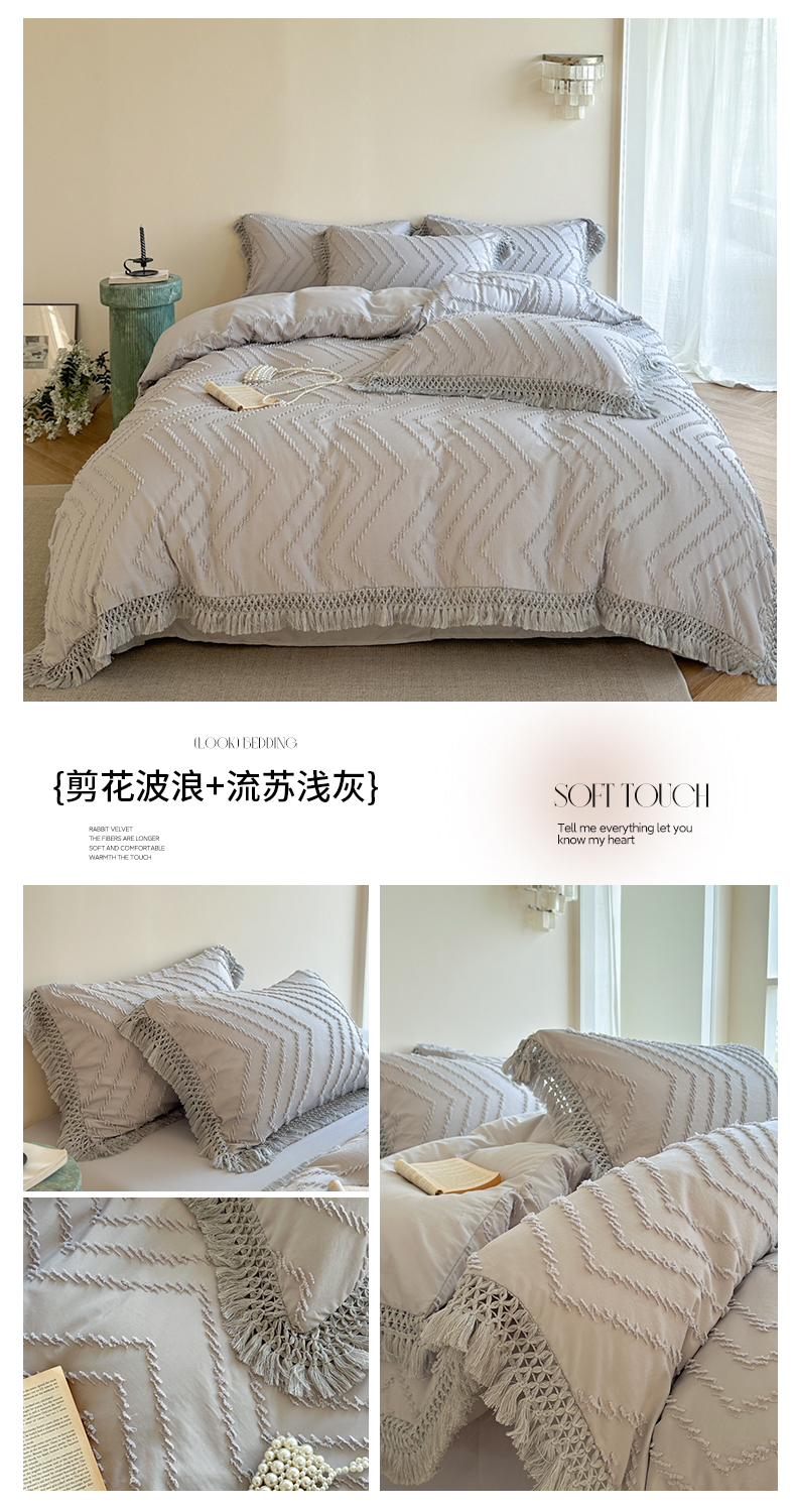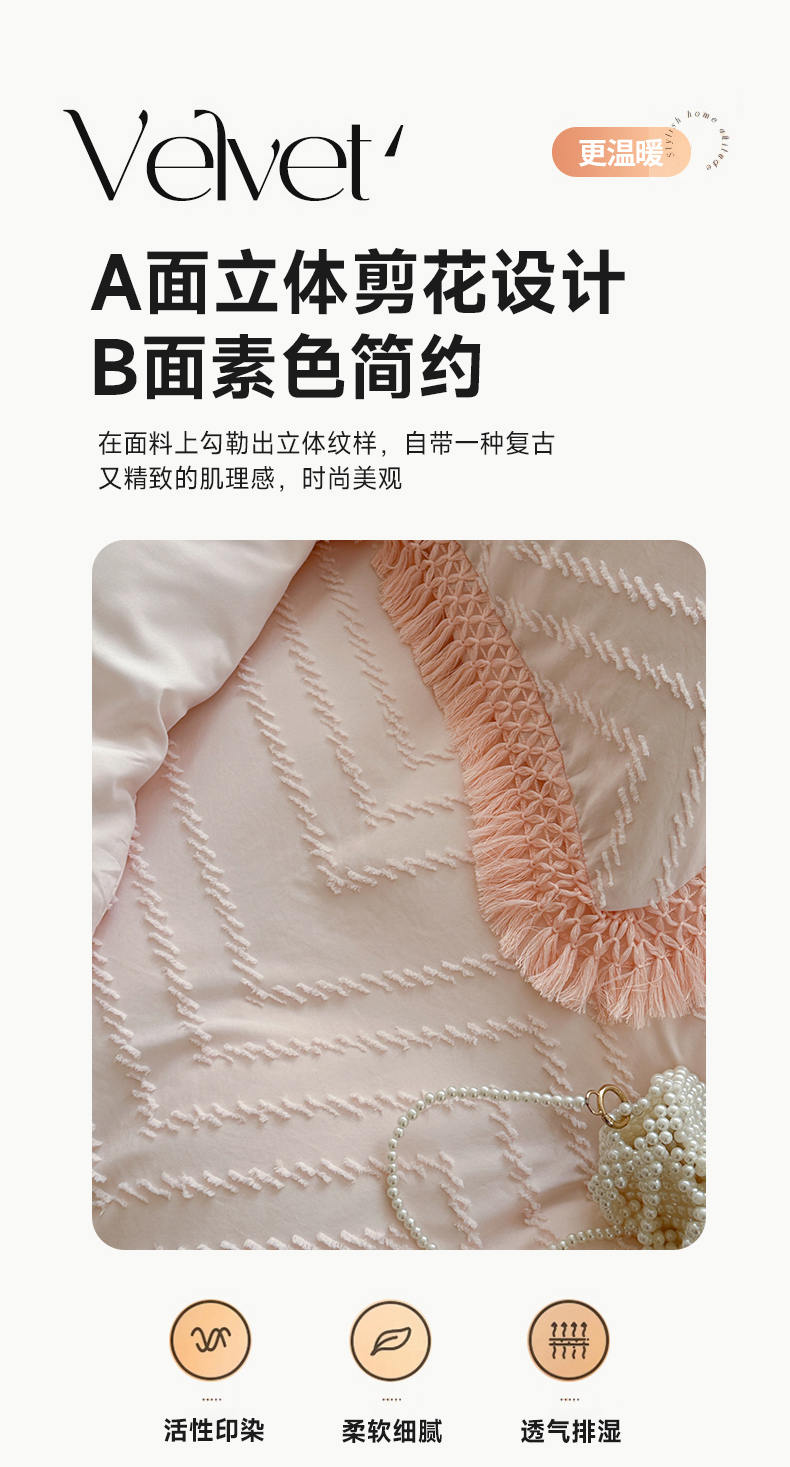当前位置: 91家纺网 > 商品网购 > 床品套件 > 四件套 > 其它四件套 > 缘生活 2025新款素色简约立体剪花流苏四件套 剪花波浪+流苏浅粉