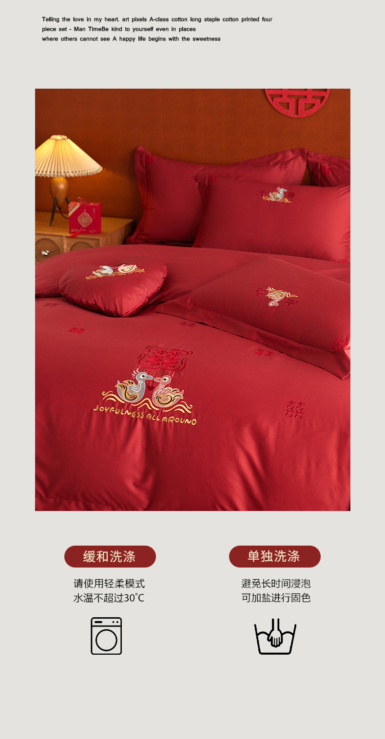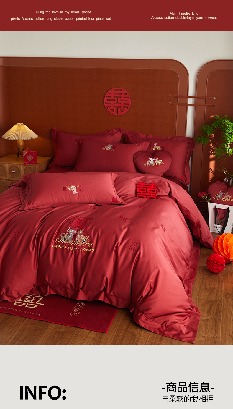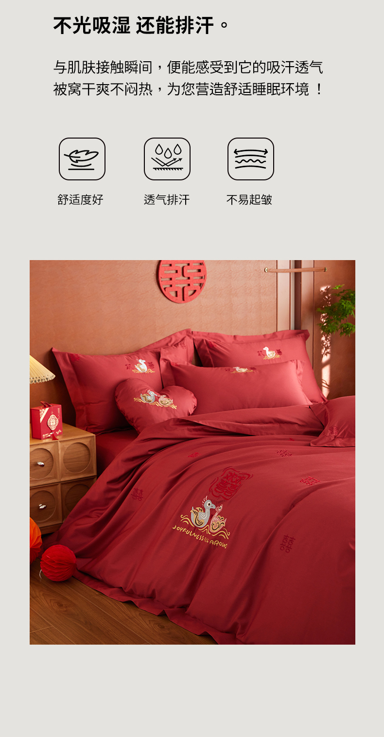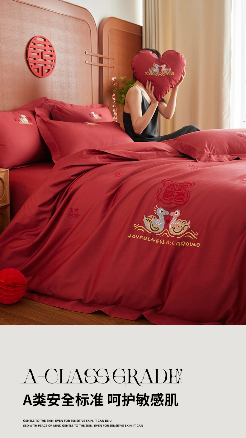 当前位置: 91家纺网 > 商品网购 > 床品套件 > 四件套 > 婚庆四件套 > 风向标家纺 2025新款婚A类100S长绒棉纯棉贡缎婚庆四件套 欢喜鸳鸯