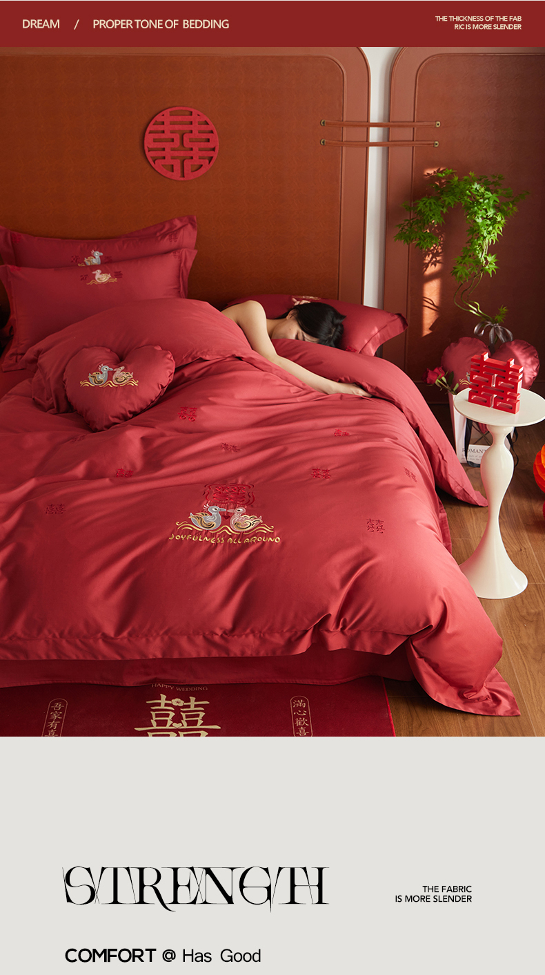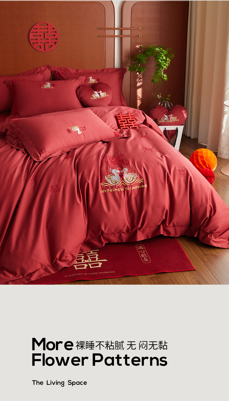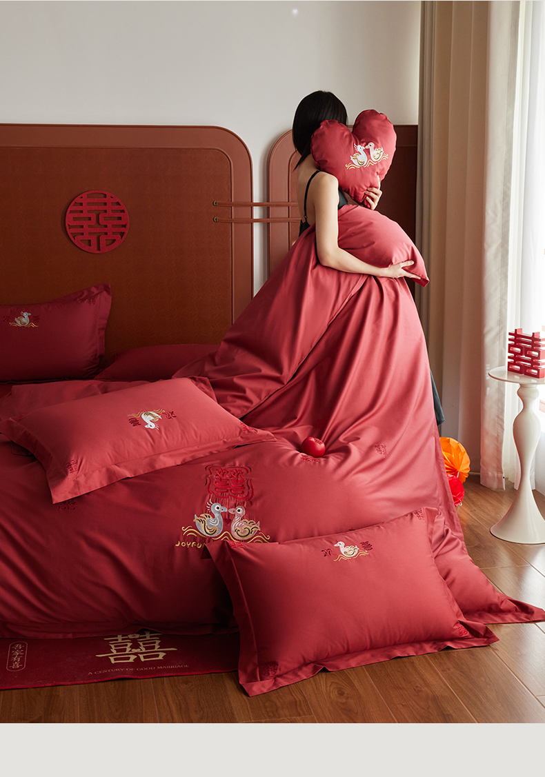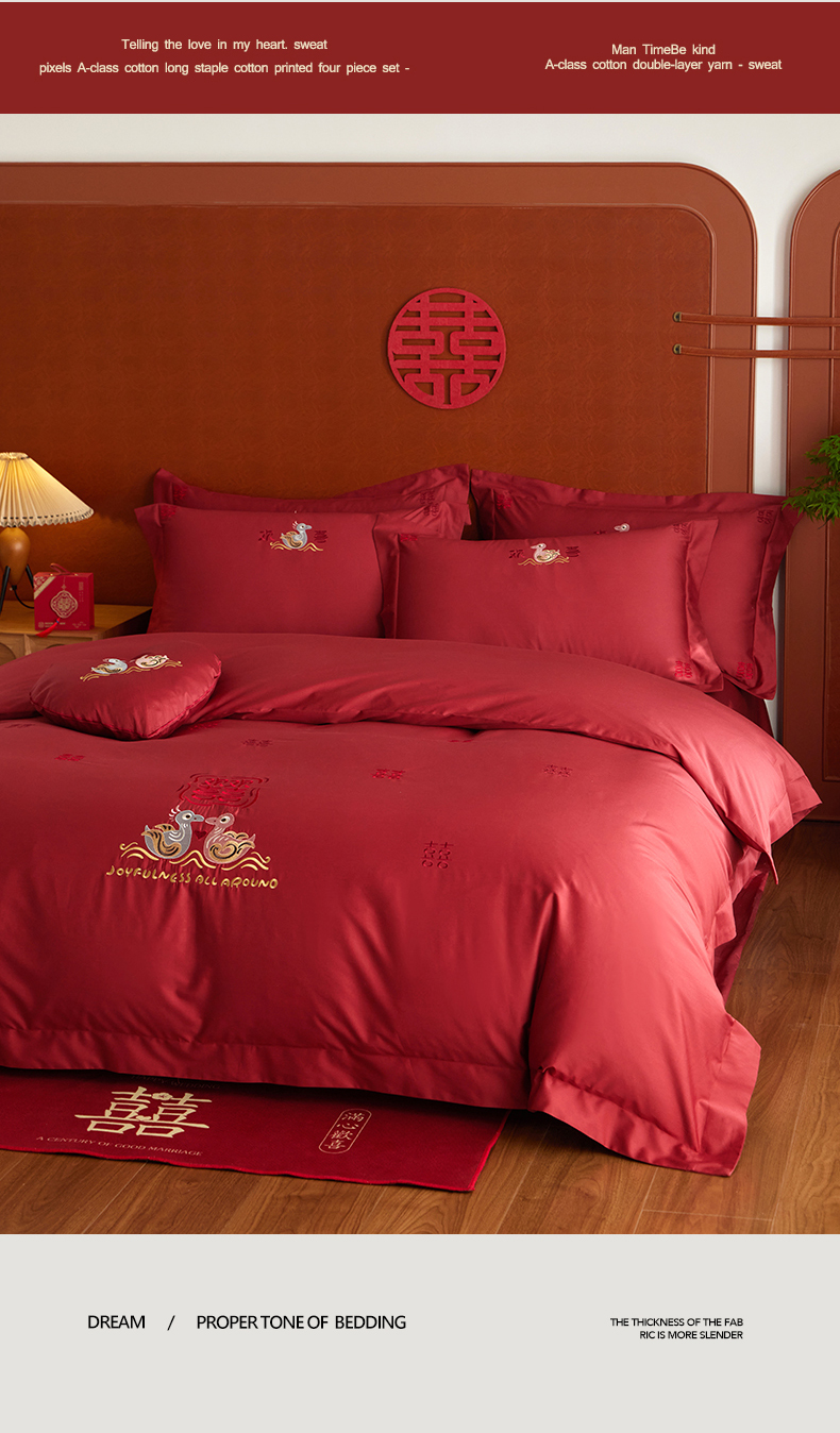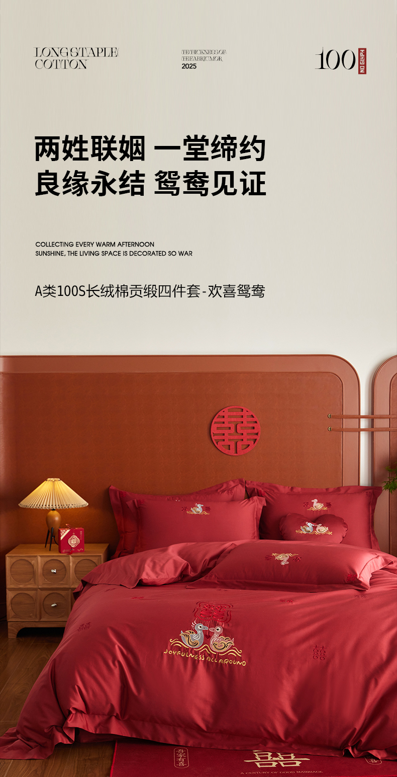 当前位置: 91家纺网 > 商品网购 > 床品套件 > 四件套 > 婚庆四件套 > 风向标家纺 2025新款婚A类100S长绒棉纯棉贡缎婚庆四件套 欢喜鸳鸯