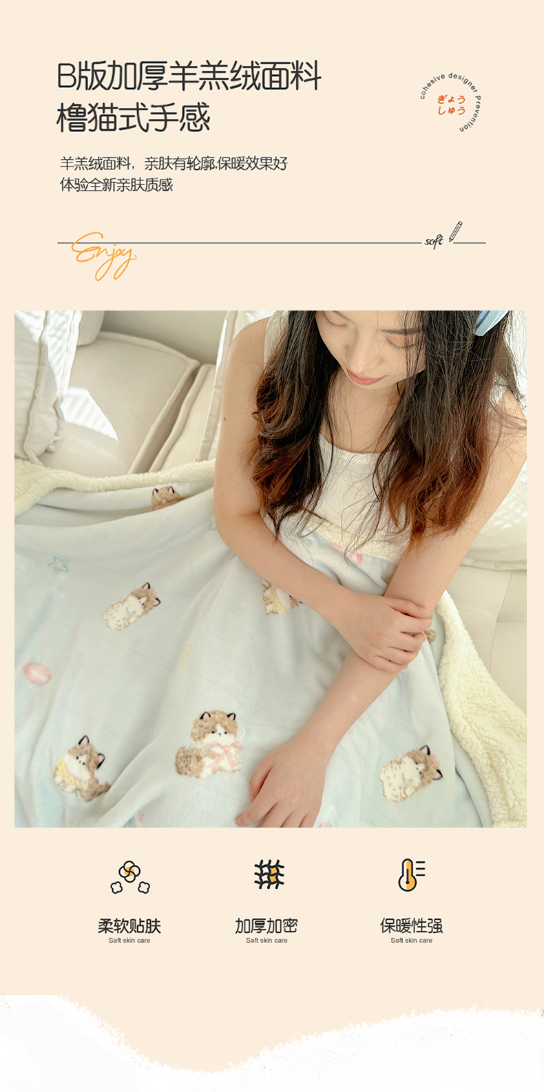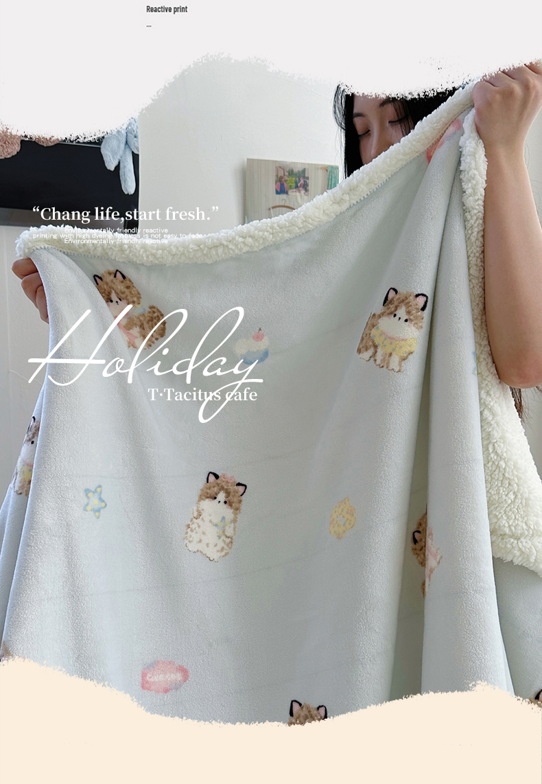 萝莉家纺 2025新款小清新多功能牛奶绒羊羔绒毛毯毯子午睡毯 软萌猫蓝