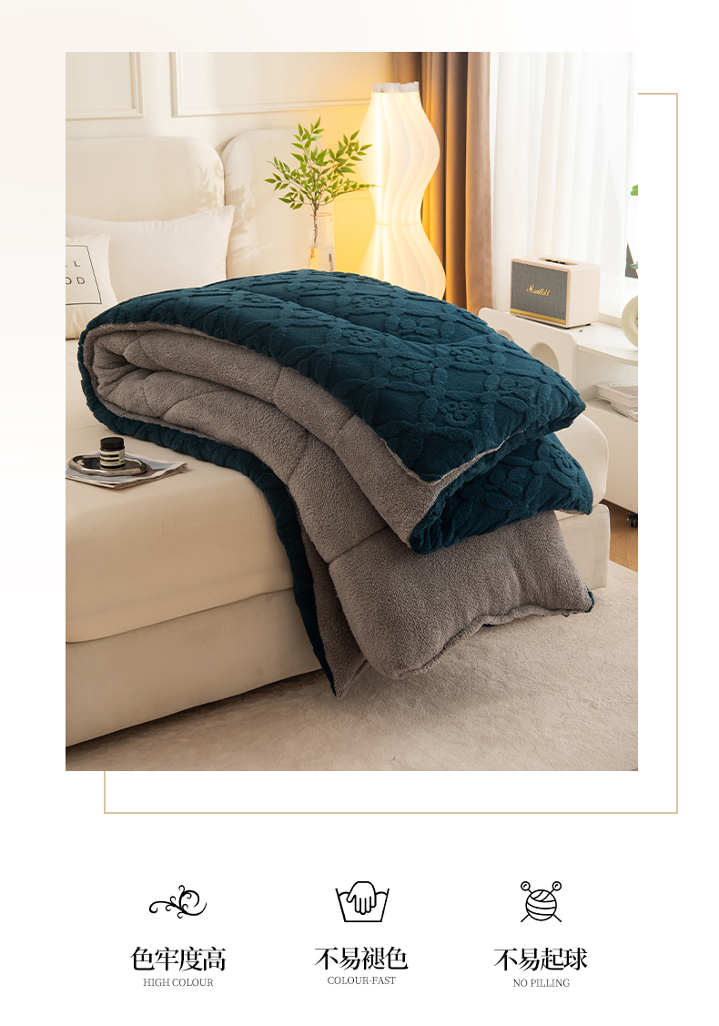 商品名称:畅销被业 2025新款跨境外贸塔芙绒羊羔绒提花系列冬被子被芯 三叶草墨绿