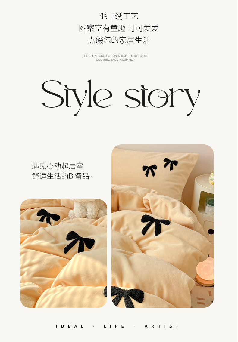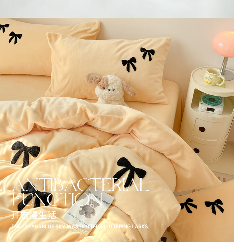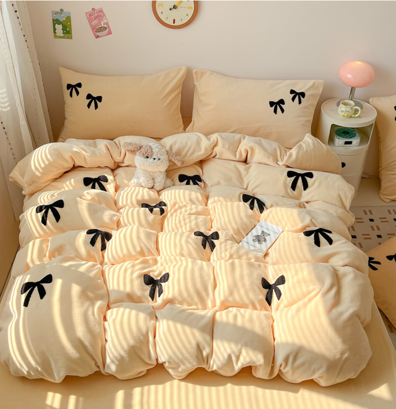 喜梦缘家纺 2025新款牛奶绒毛巾绣四件套 蝴蝶结-麦黄