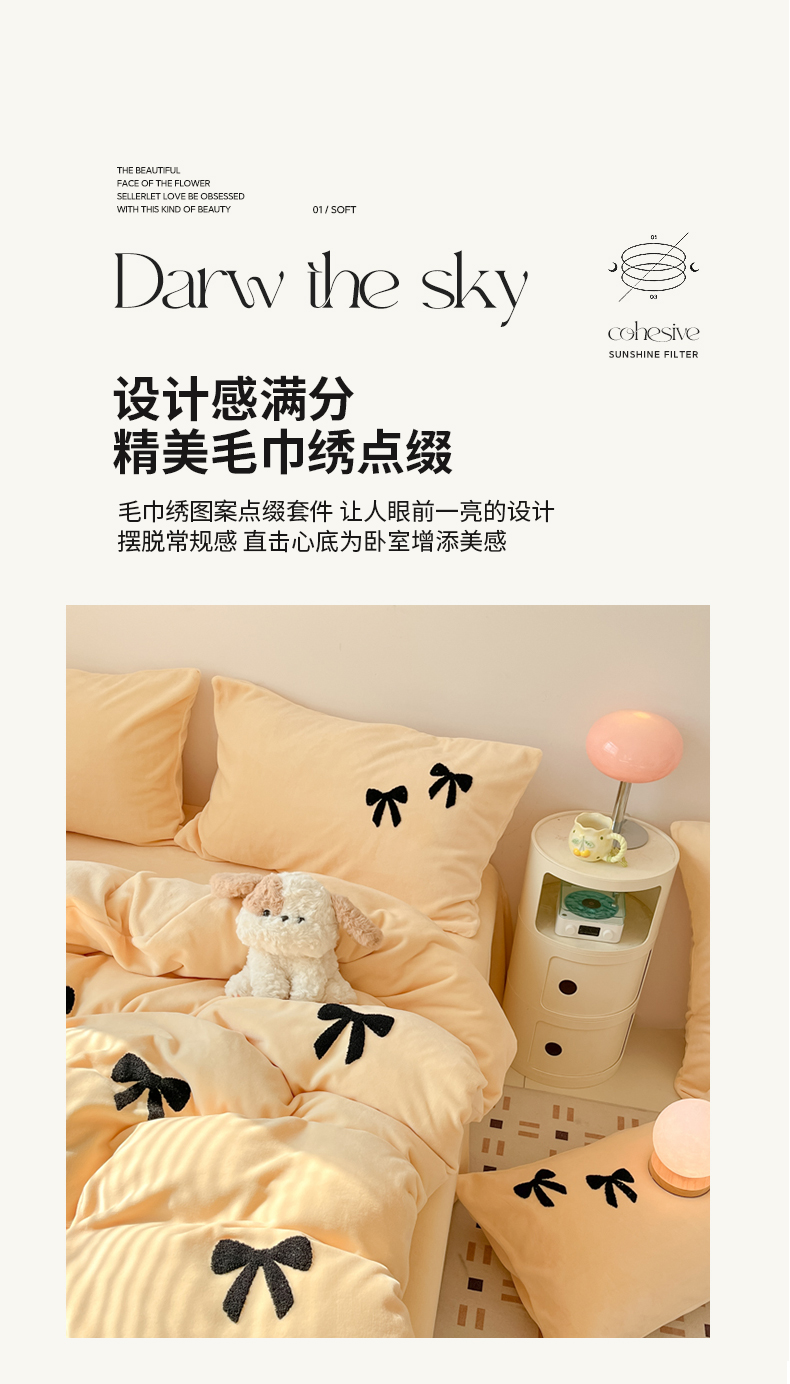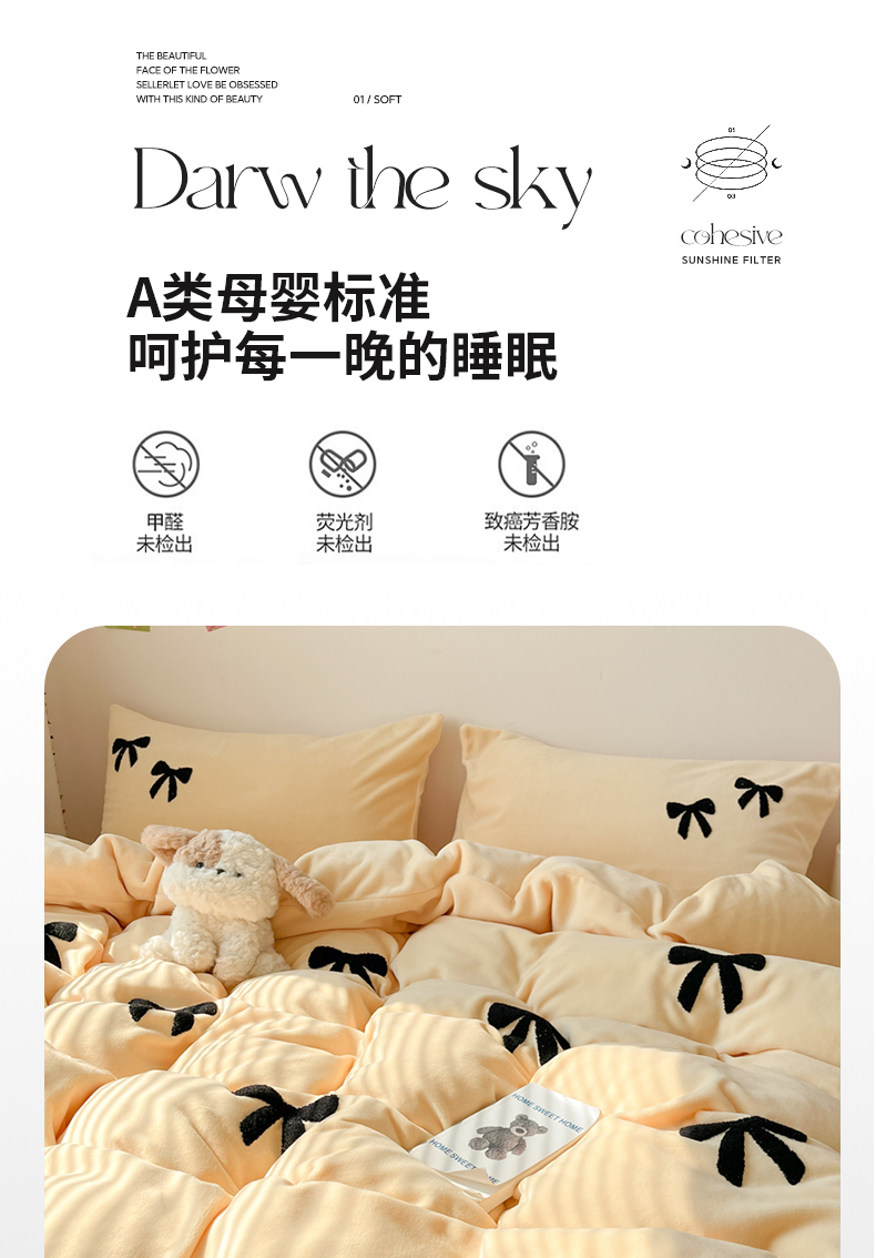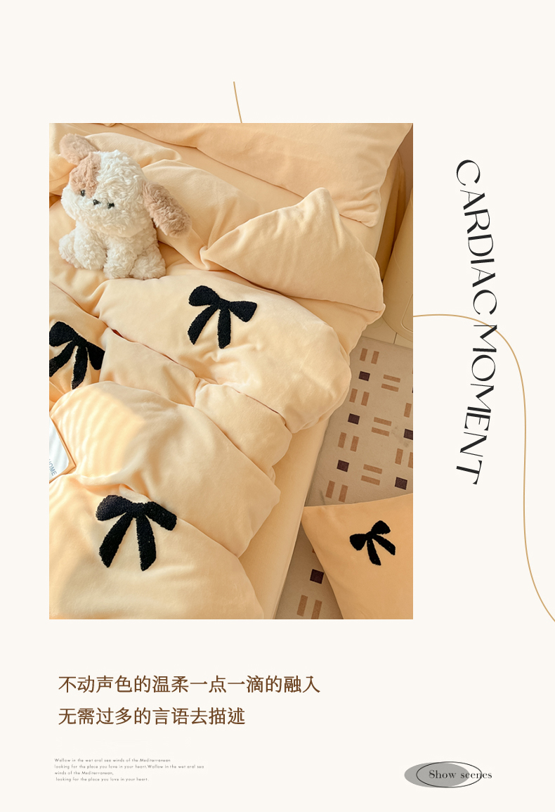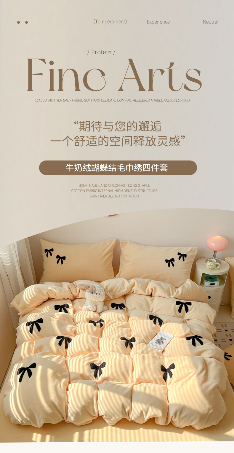 商品名称:喜梦缘家纺 2025新款牛奶绒毛巾绣四件套 蝴蝶结-麦黄