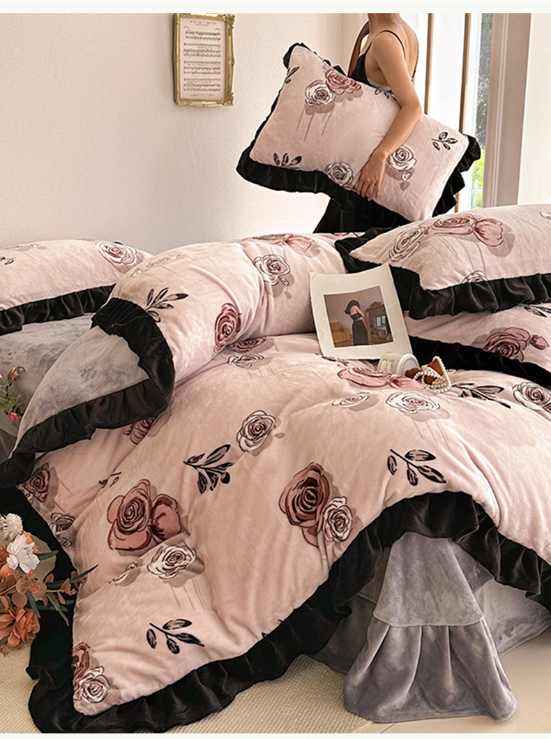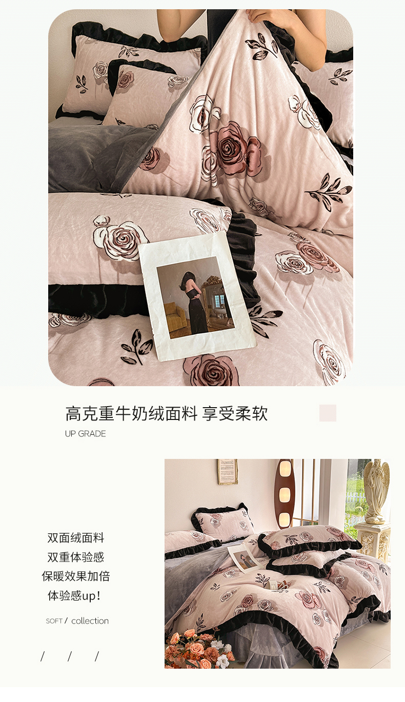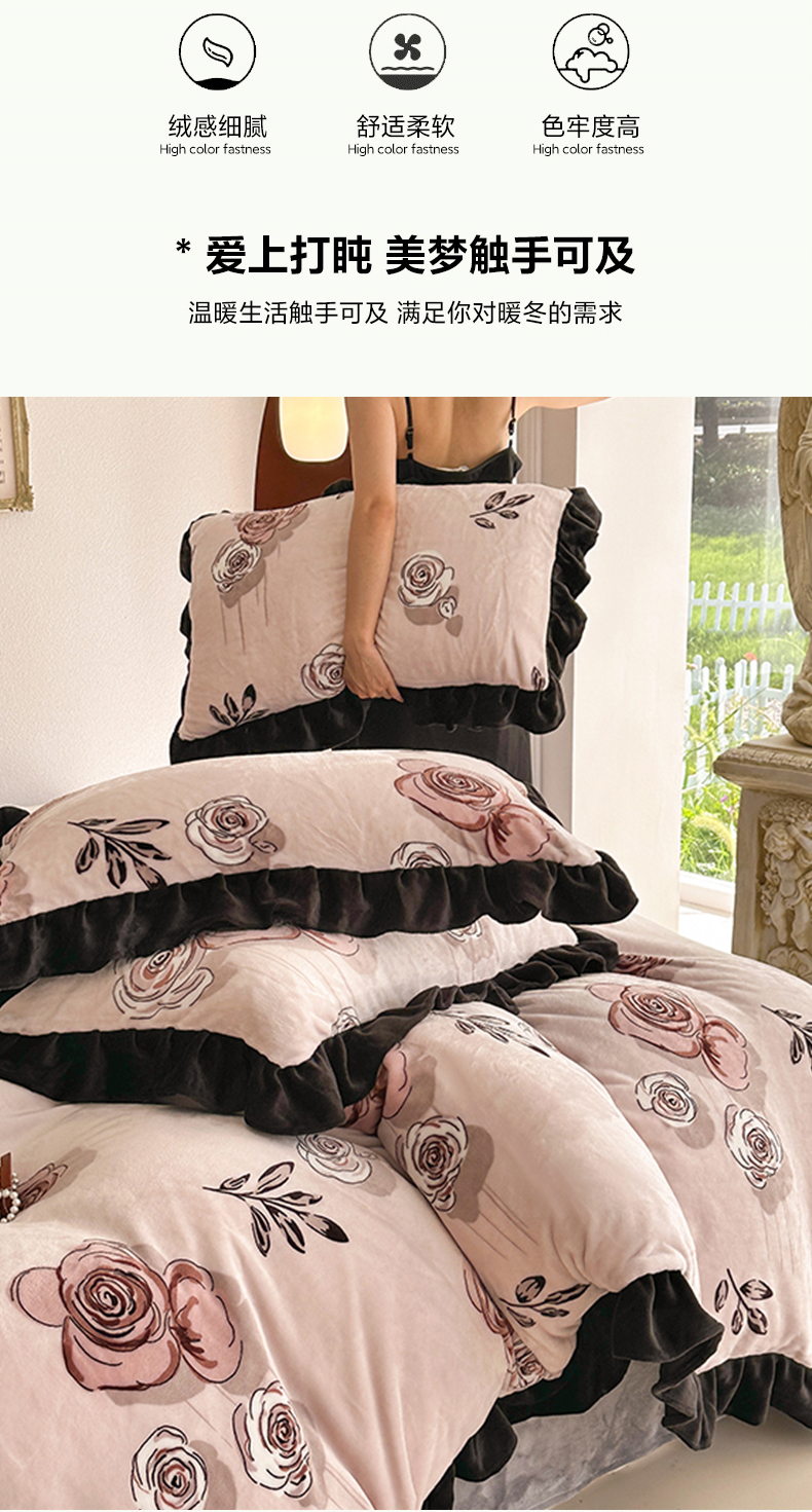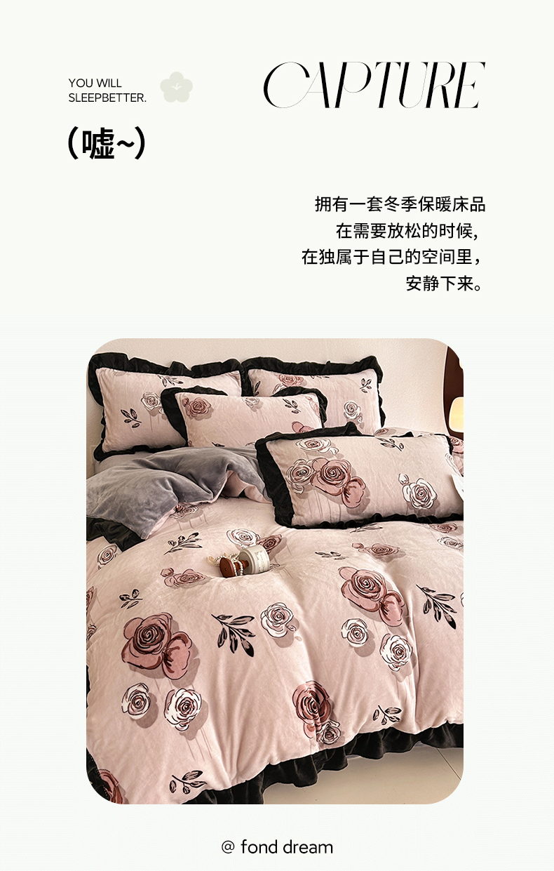 佳一 2025新款高克重8-9斤 印花牛奶绒四件套 玫瑰之吻,玫瑰之吻