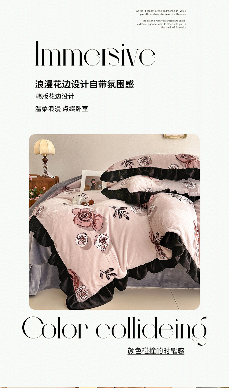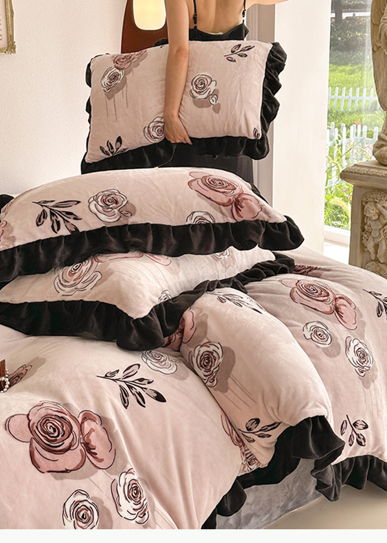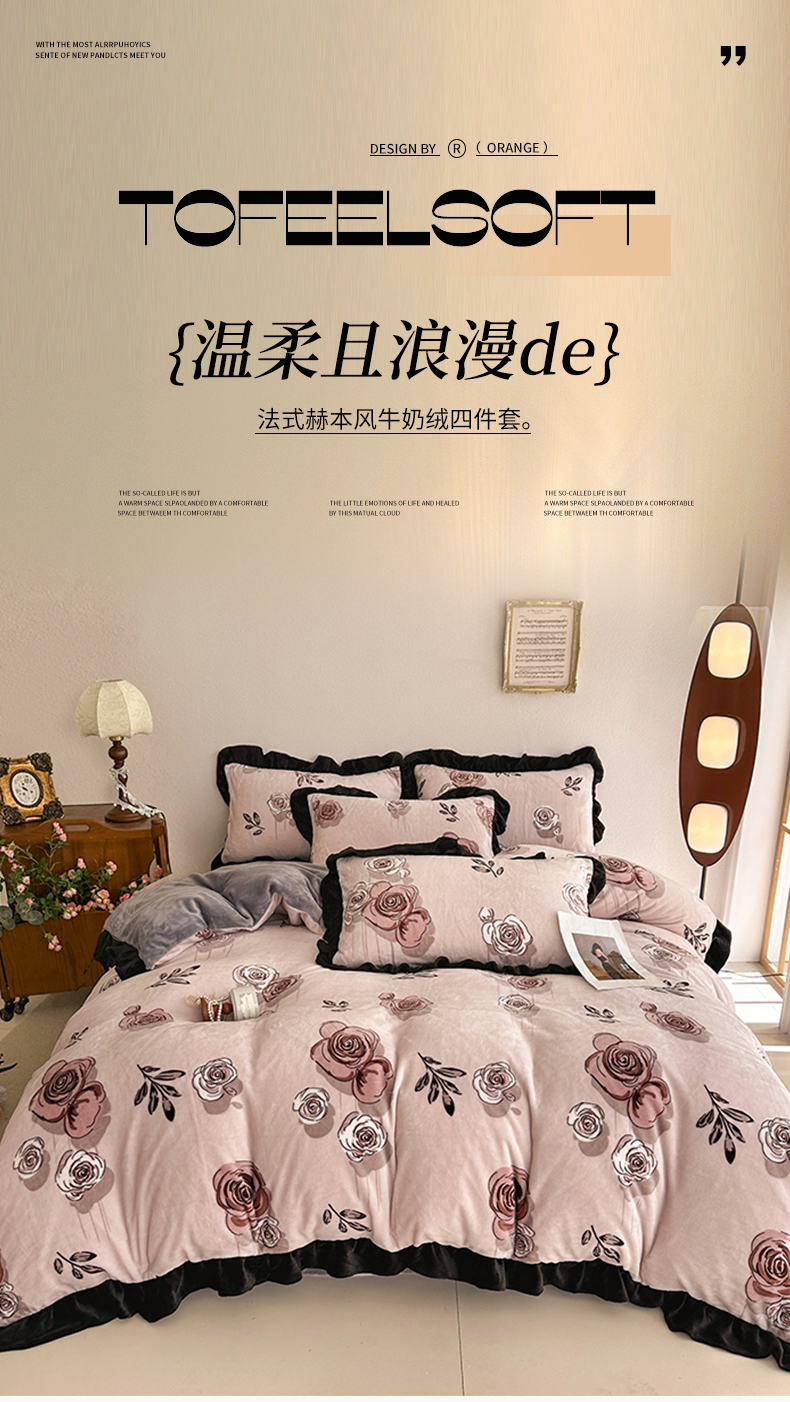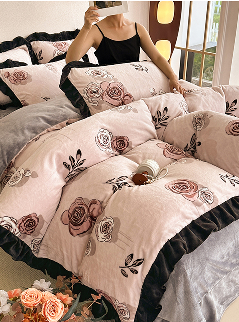 佳一 2025新款高克重8-9斤 印花牛奶绒四件套 玫瑰之吻,玫瑰之吻