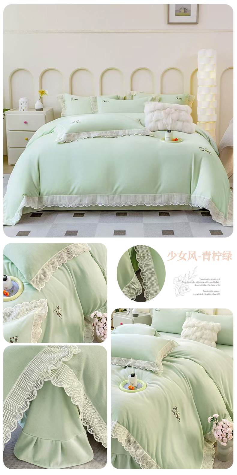 商品名称:席之家 2025新款公主风蕾丝花边刺绣牛奶绒四件套 少女风-青柠绿