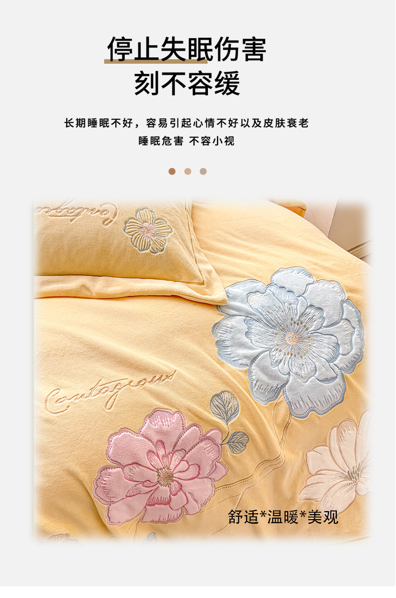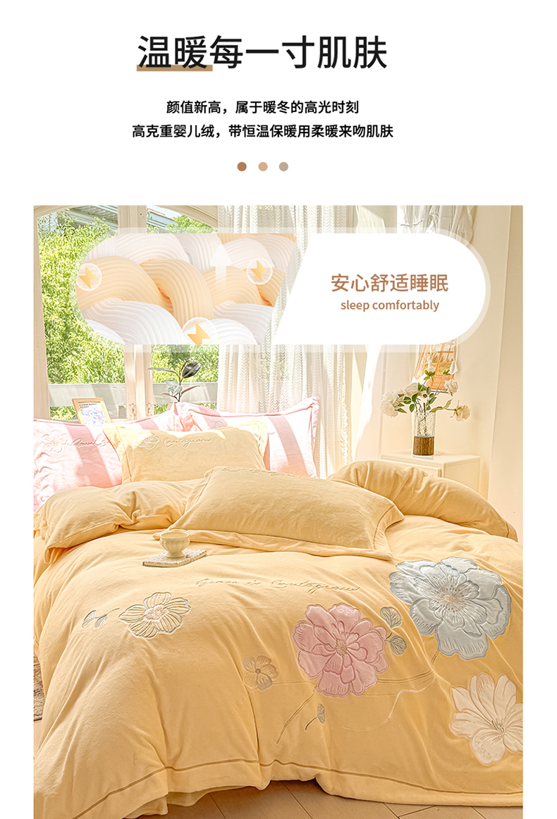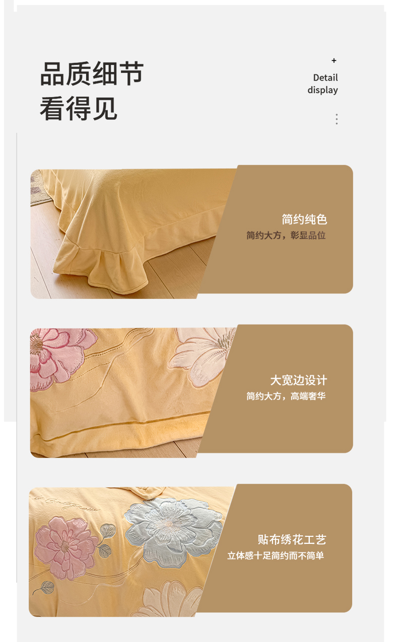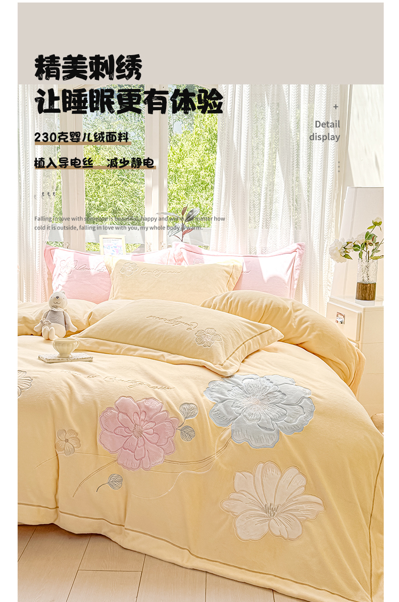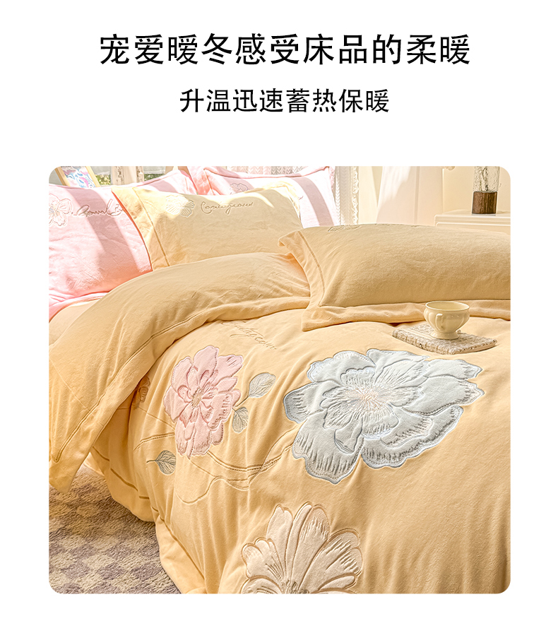 商品名称:悦织湾家纺 2025新款9斤重牛奶绒四件套纯色贴布绣人件富贵系列240克重高密保暖轻奢时尚床上用品4件套 黛西-鹅黄