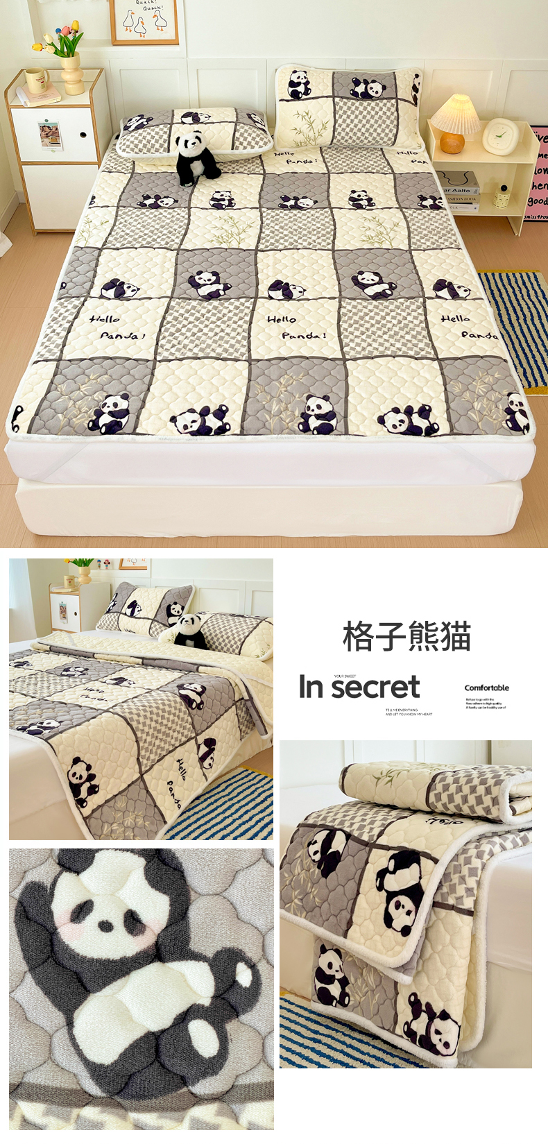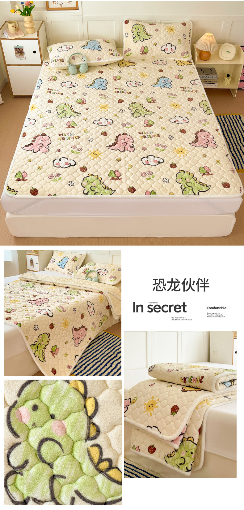 (总)富馨莱 2025新款牛奶绒夹棉床垫床盖支持一件定制,飞行太空,格子熊猫,孔雀蓝,恐龙伙伴,抹茶绿,七彩草莓,轻奢白,轻奢灰,小精灵,小柯基,樱桃兔,脏脏熊,组合图