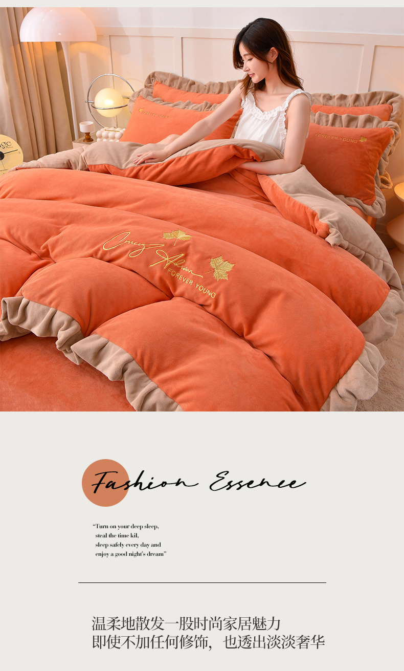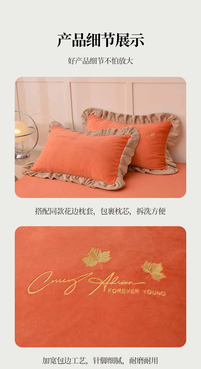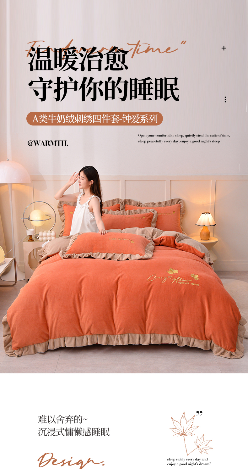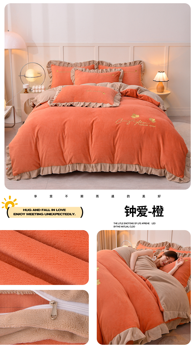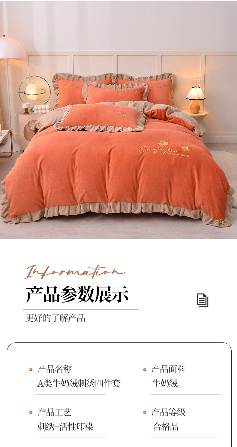 当前位置: 91家纺网 > 商品网购 > 床品套件 > 四件套 > 牛奶绒四件套 > 氧家 2025新款高克重牛奶绒拼角刺绣床单床笠床盖款四件套-钟爱 钟爱-橙