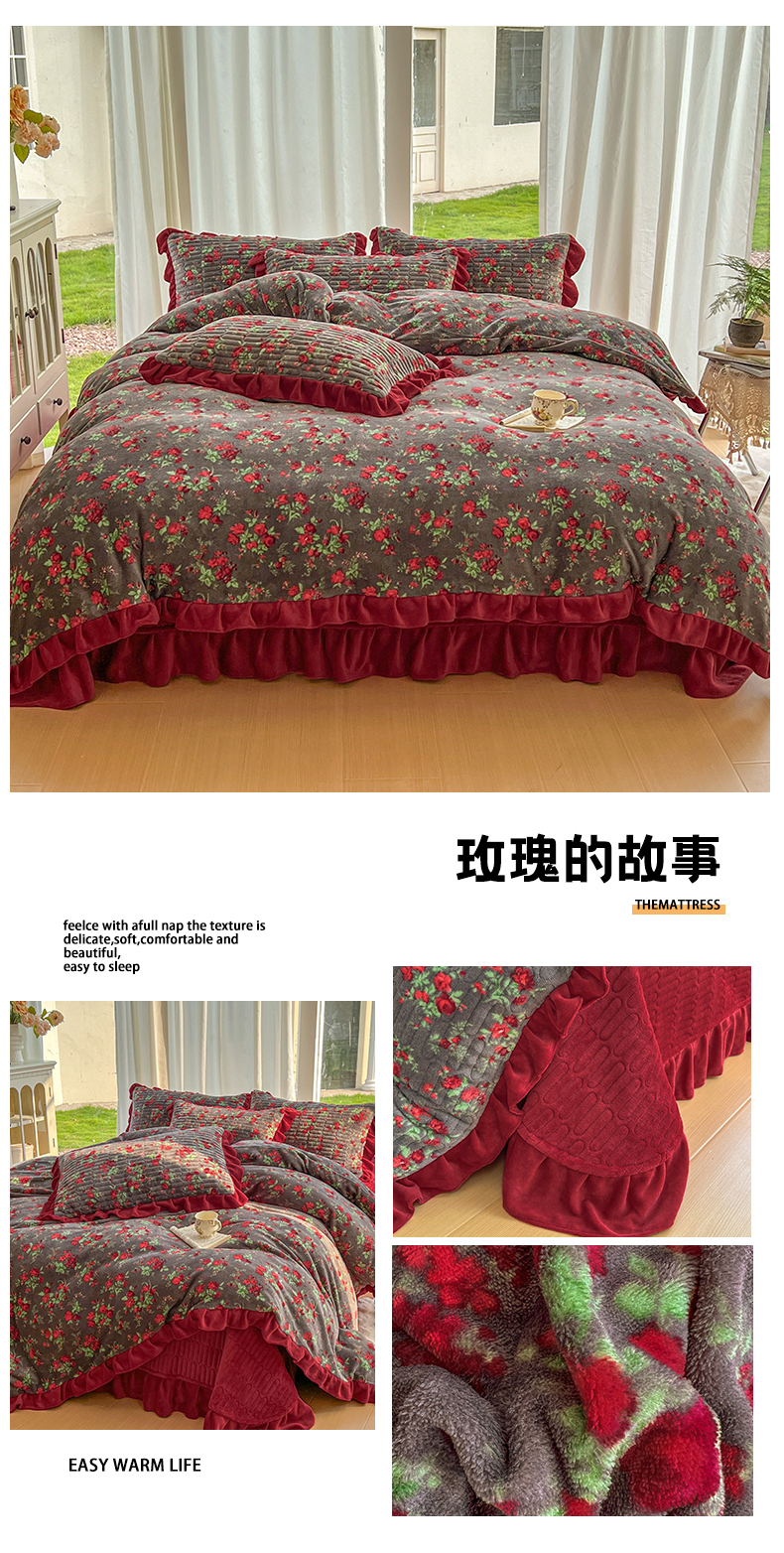 (总)美梦家纺 2025新款花边牛奶绒床盖四件套,向阳玫瑰-红,彩虹条-紫,粉蝴蝶结,横条蝴蝶结-灰,灰蓝格-红心,凯蒂猫-蓝,可爱猫咪-红,玫瑰的故事,梦回花田粉,蘑菇小兔-粉