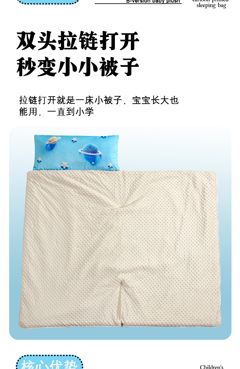 (总)沁童儿童用品店 2025新款儿童3D立体印花A版宝宝绒+B版豆豆绒儿童睡袋,太空宝宝,彩虹马,彩色小熊,可爱猫咪,可爱小熊,蘑菇娃娃,企鹅宝宝,水果娃娃,云朵汽车,太空宝宝,企鹅宝宝,云朵汽车