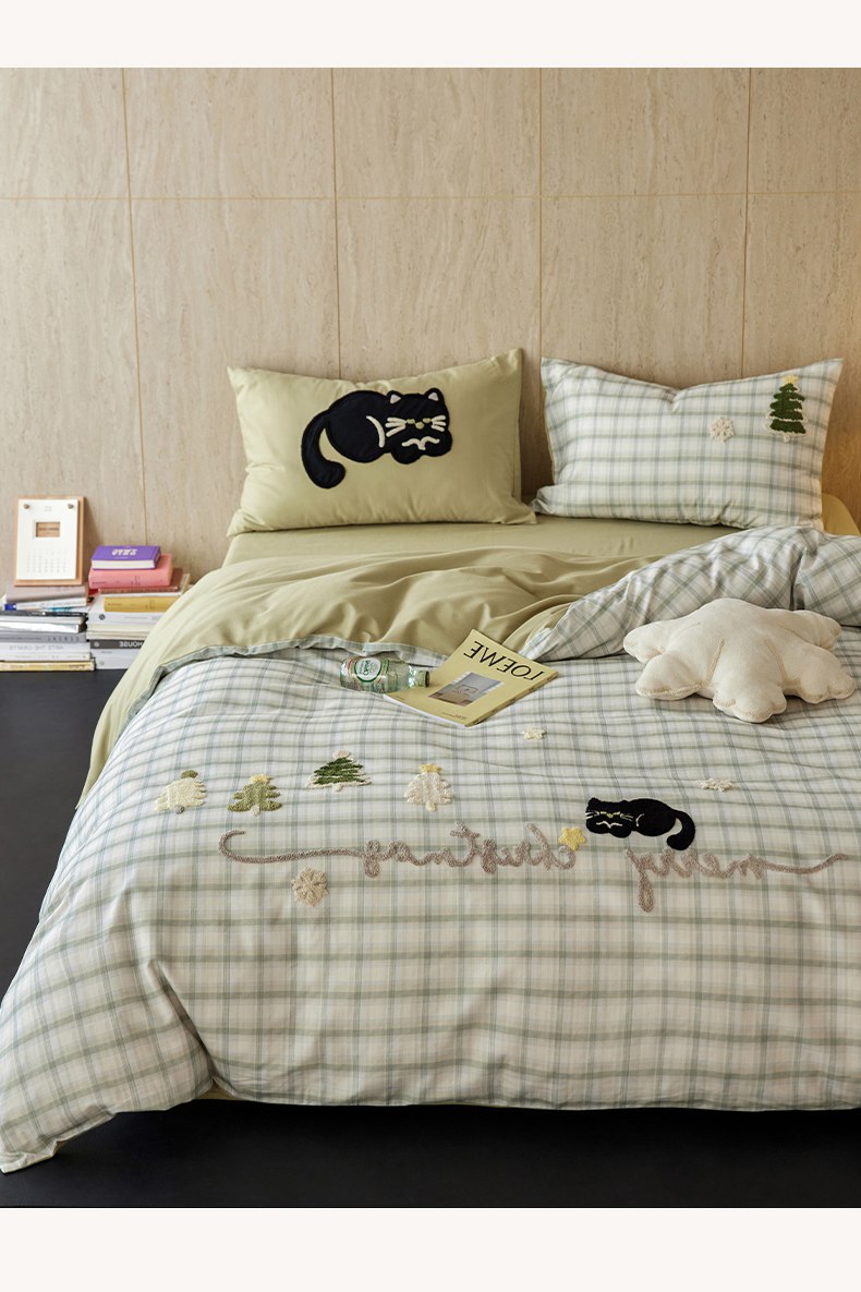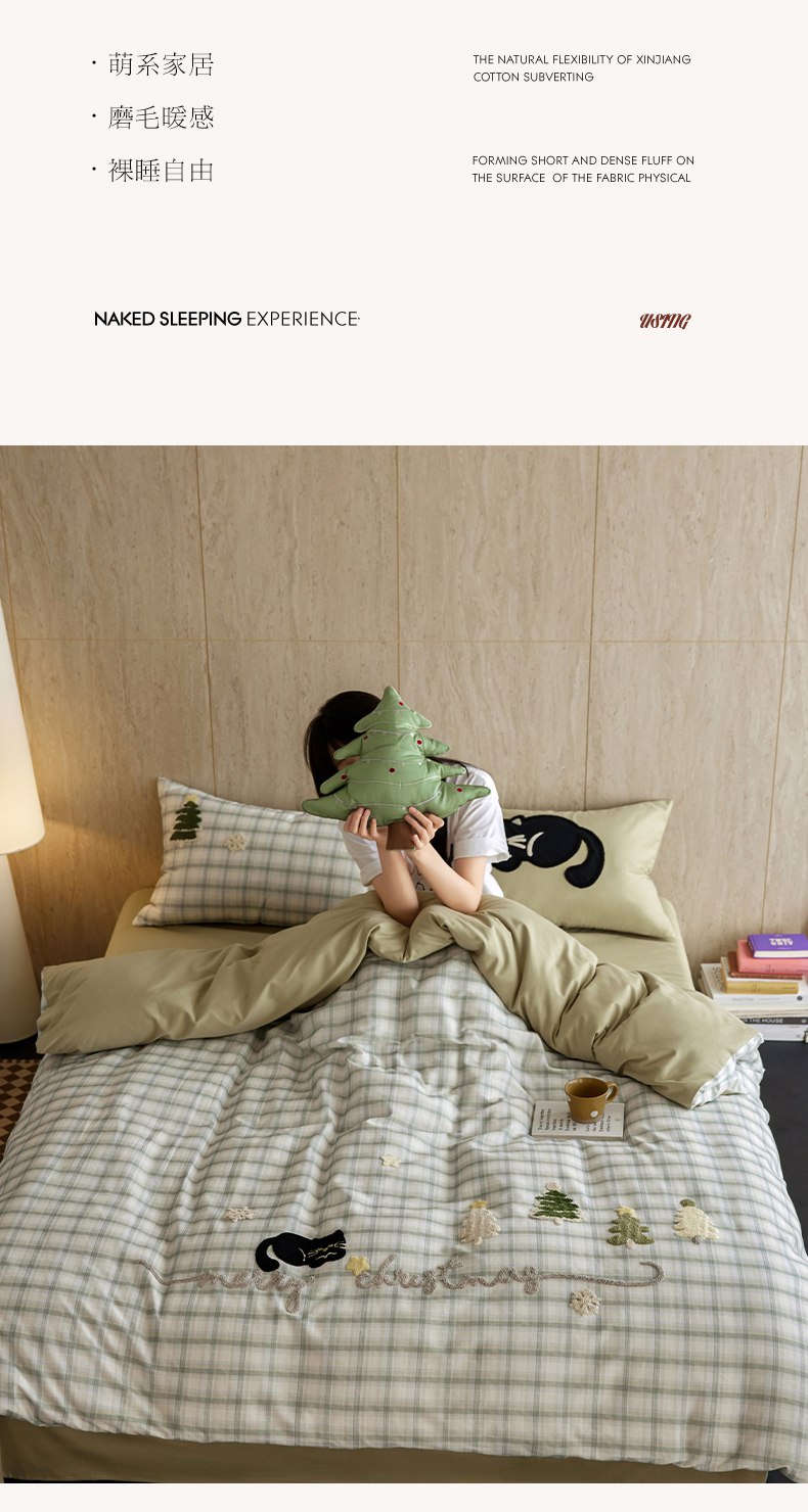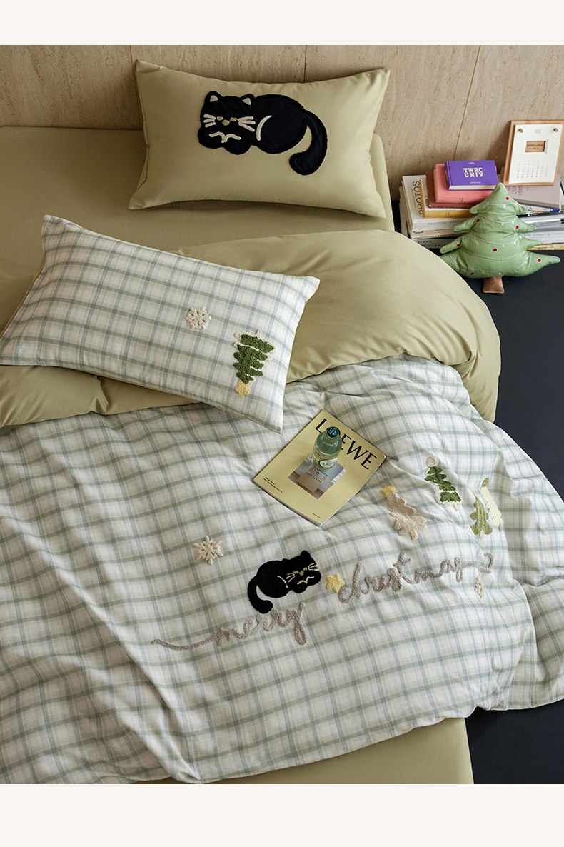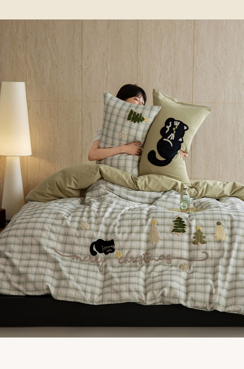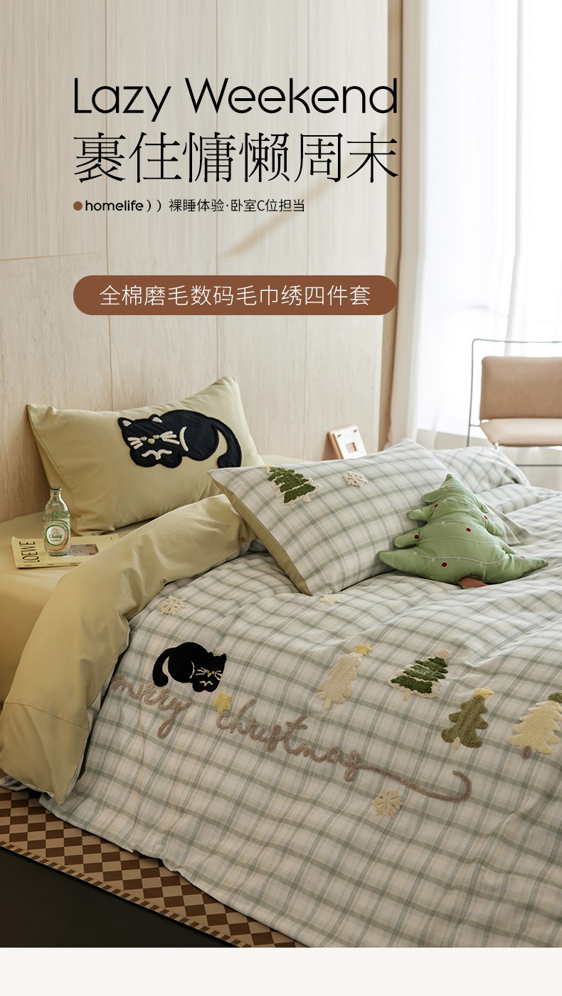 当前位置: 91家纺网 > 商品网购 > 床品套件 > 四件套 > 全棉普通四件套 > 风向标家纺 2025新款全棉50s磨毛数码印花毛巾绣四件套-风格一 绿色圣诞猫
