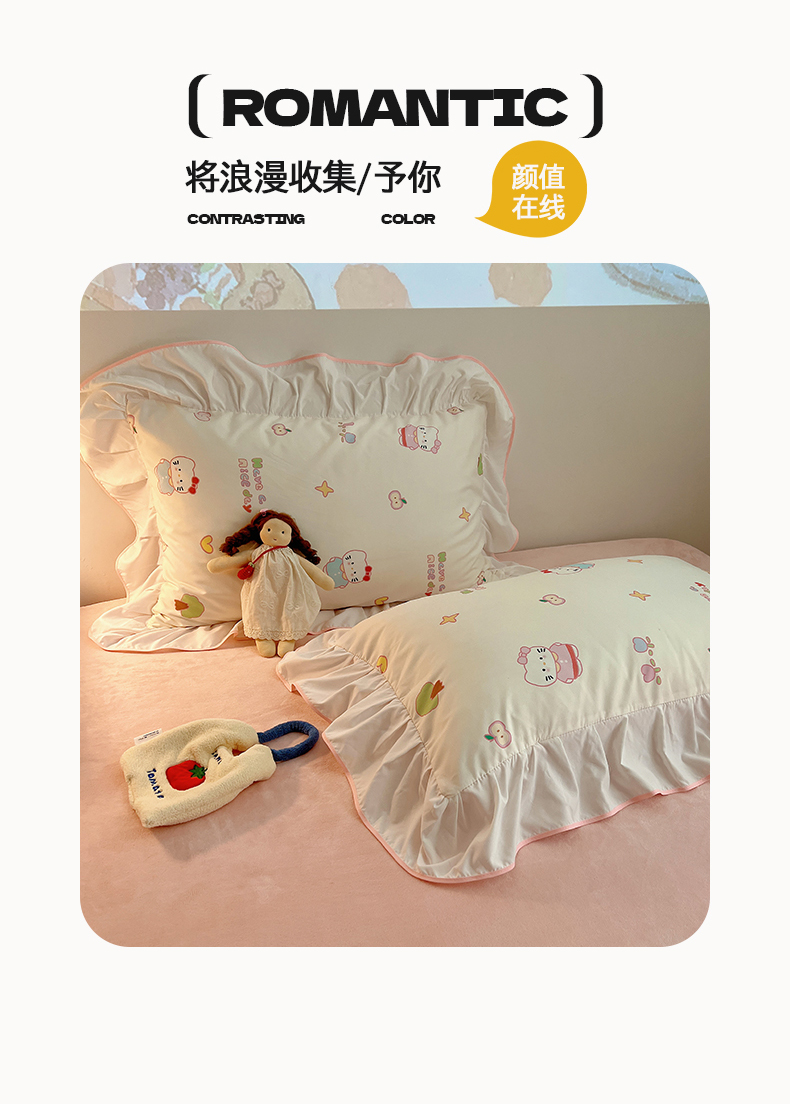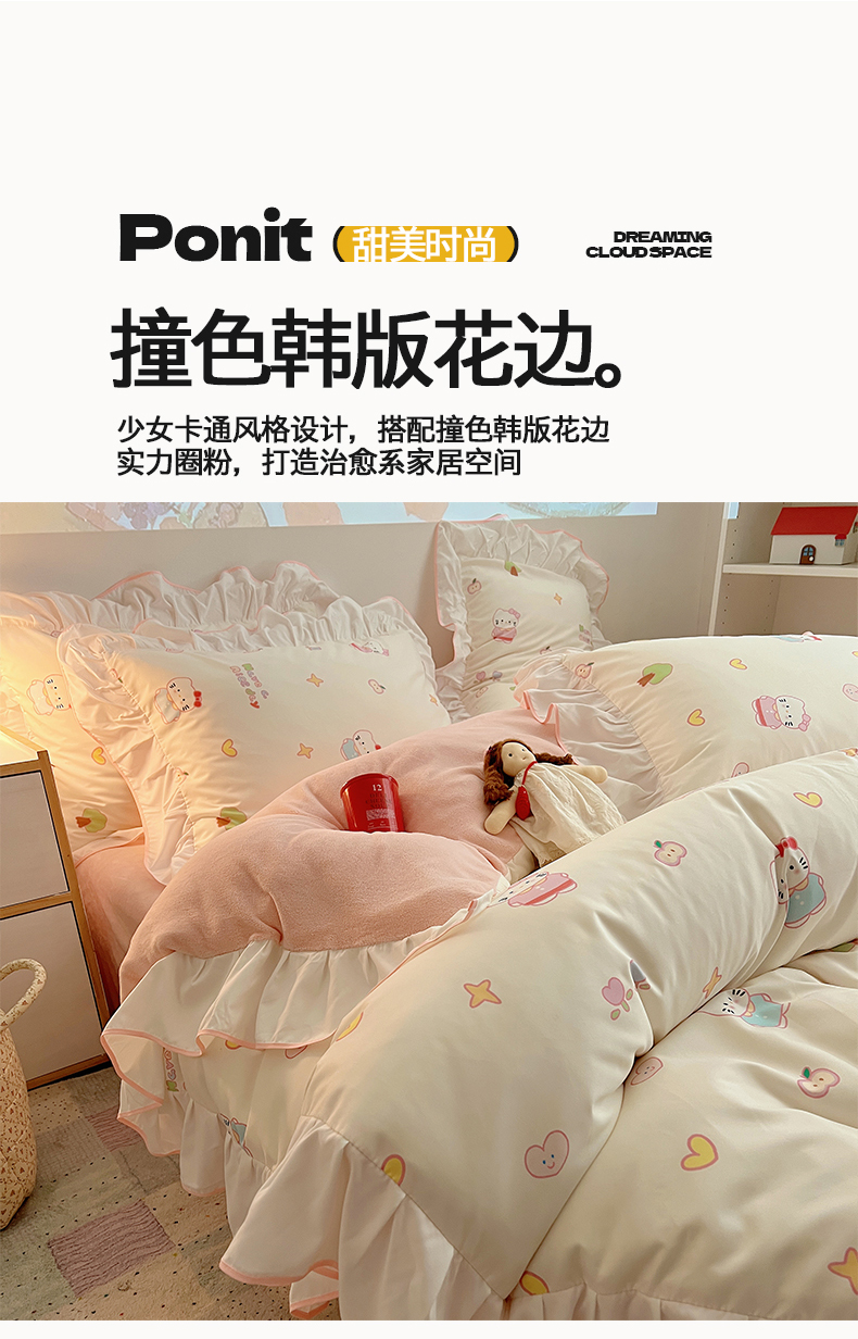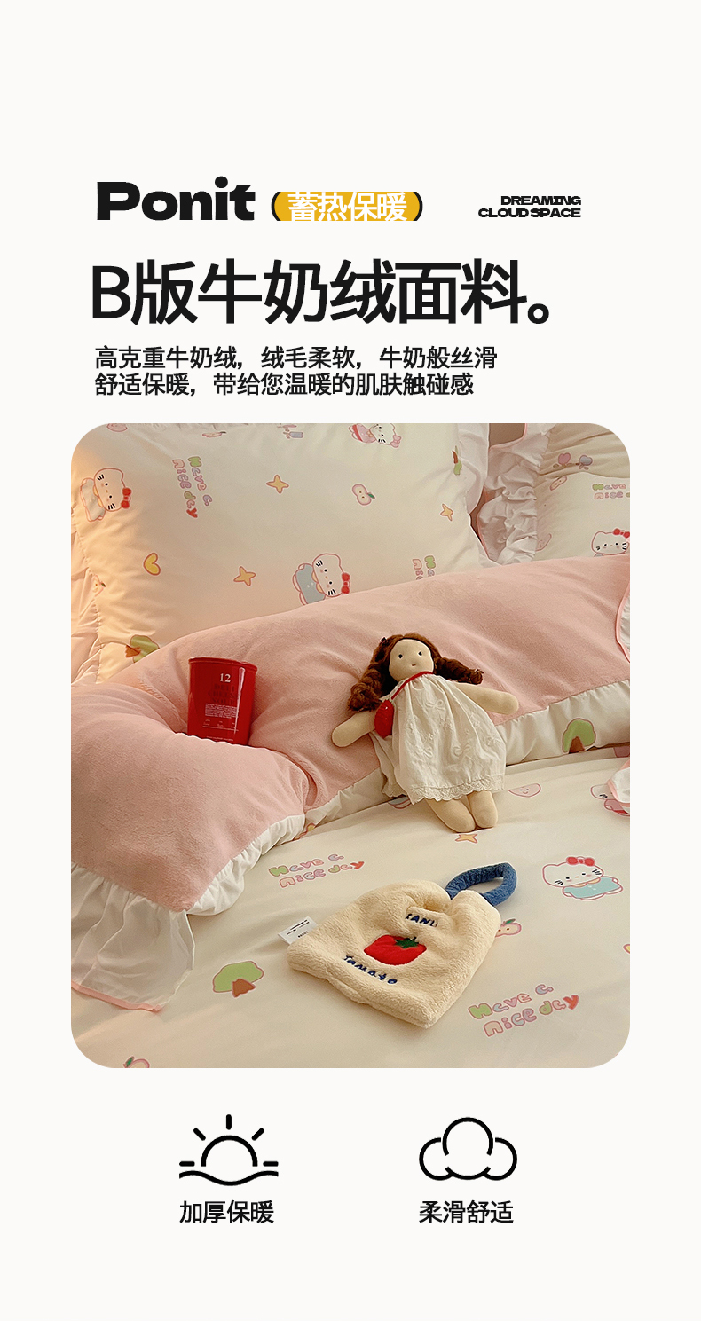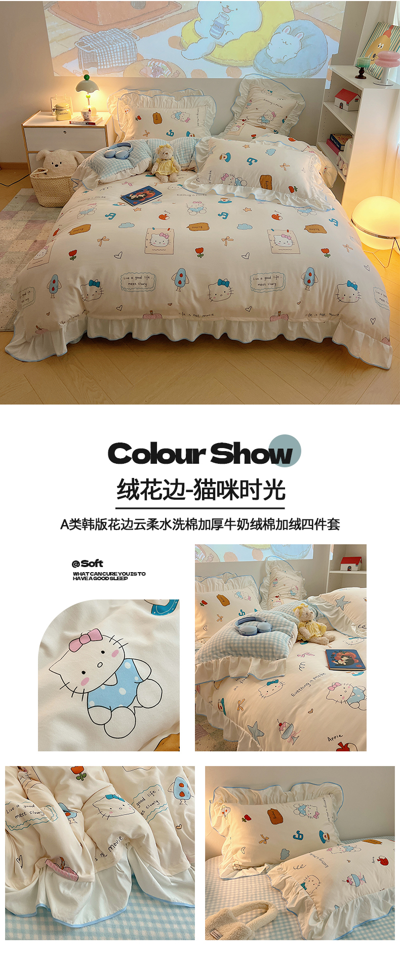 当前位置: 91家纺网 > 商品网购 > 床品套件 > 四件套 > 牛奶绒四件套 > 桃心家居 2025新款A类韩版花边撞色云柔水洗棉加厚牛奶绒少女猫咪棉绒四件套系列 绒花边-奶油猫猫