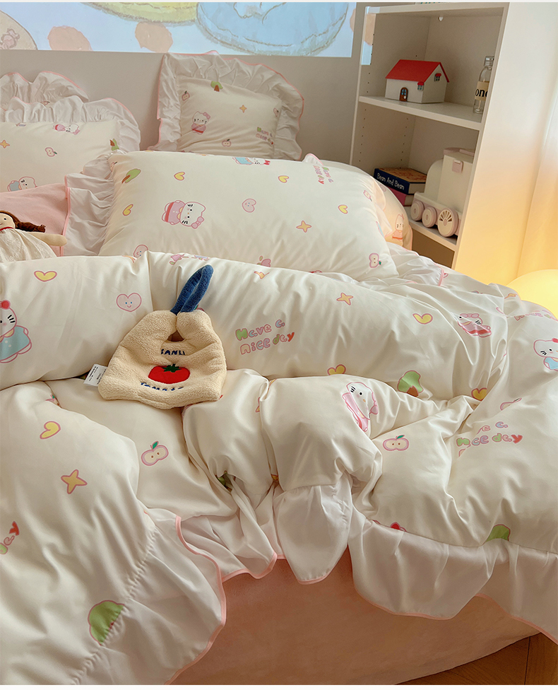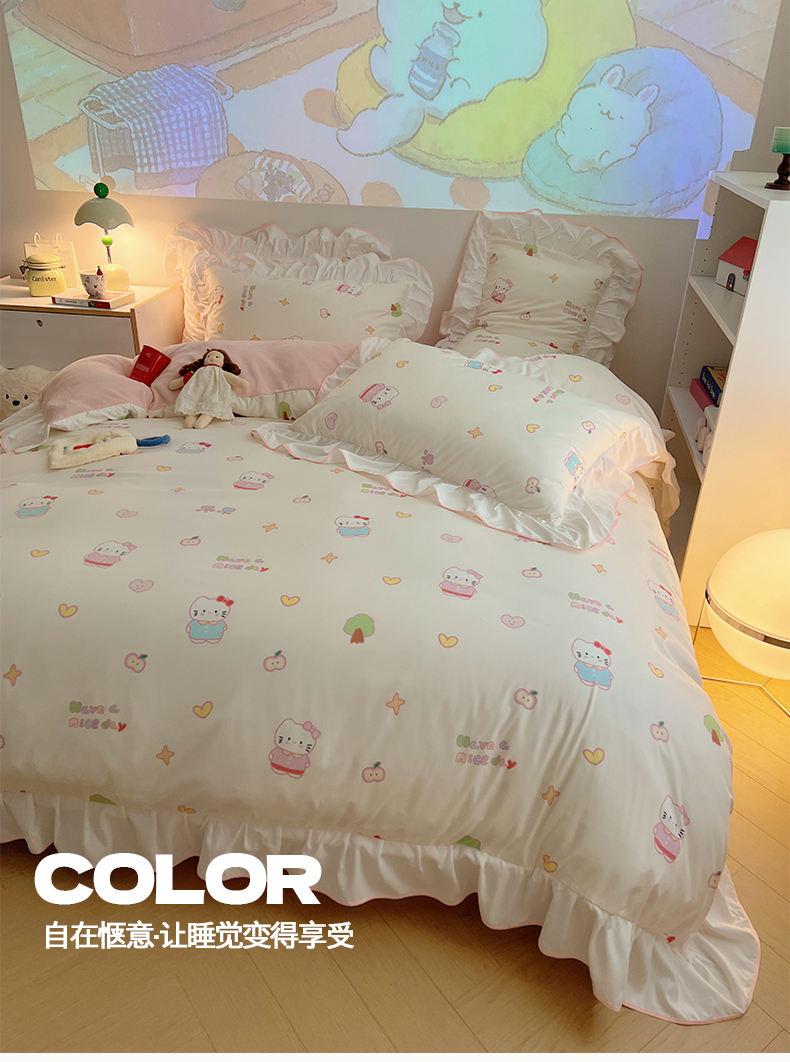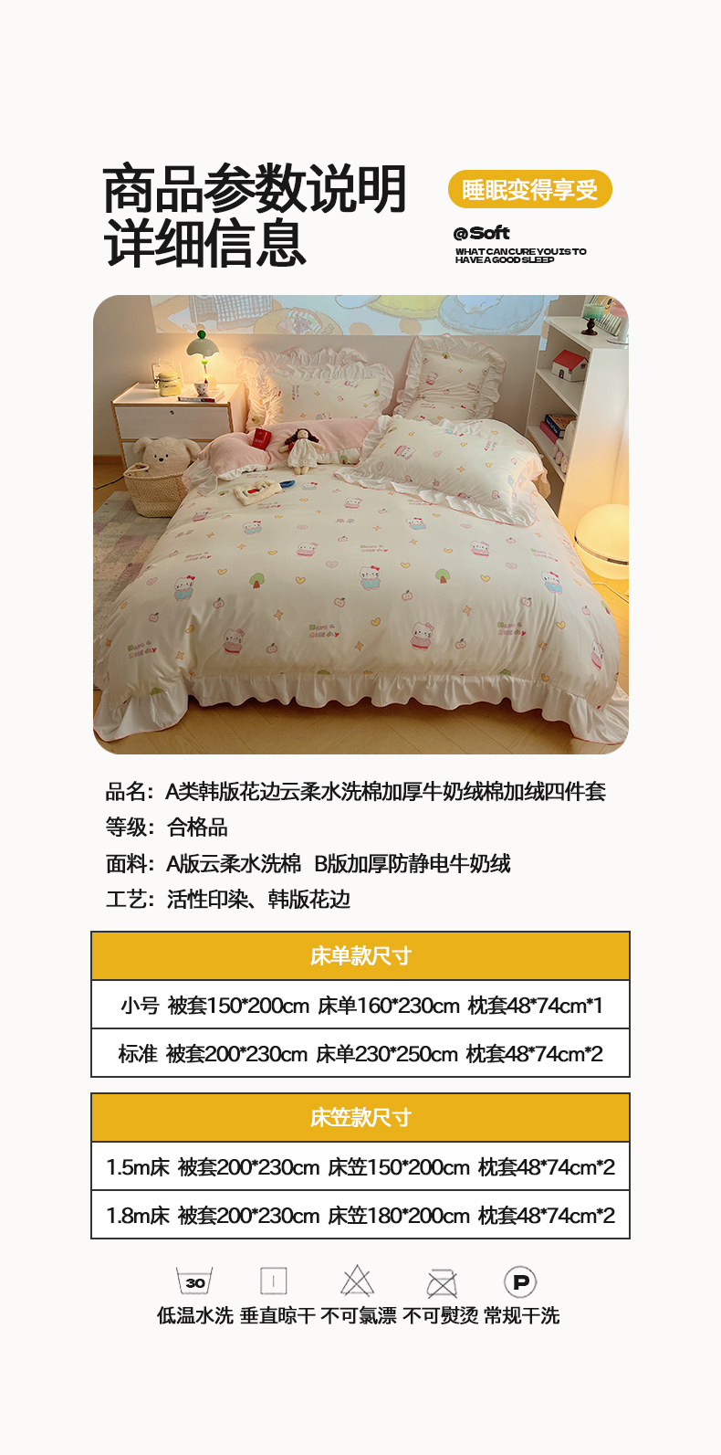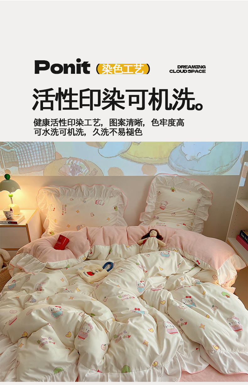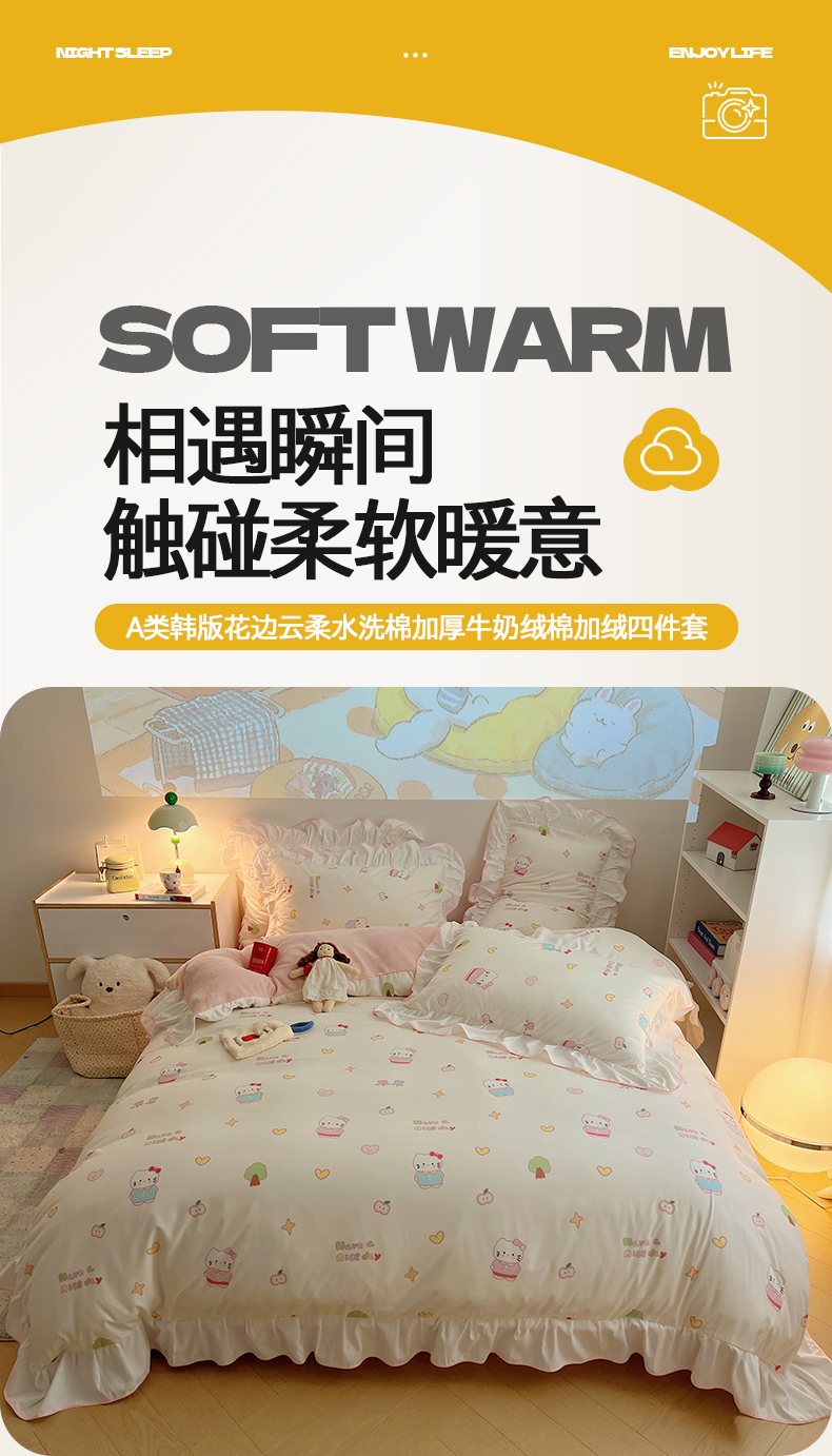 当前位置: 91家纺网 > 商品网购 > 床品套件 > 四件套 > 牛奶绒四件套 > 桃心家居 2025新款A类韩版花边撞色云柔水洗棉加厚牛奶绒少女猫咪棉绒四件套系列 绒花边-奶油猫猫