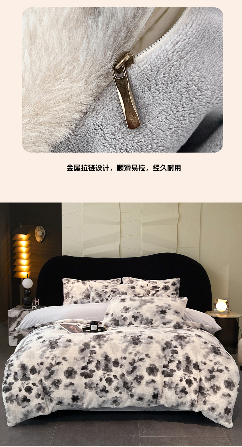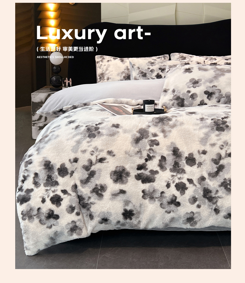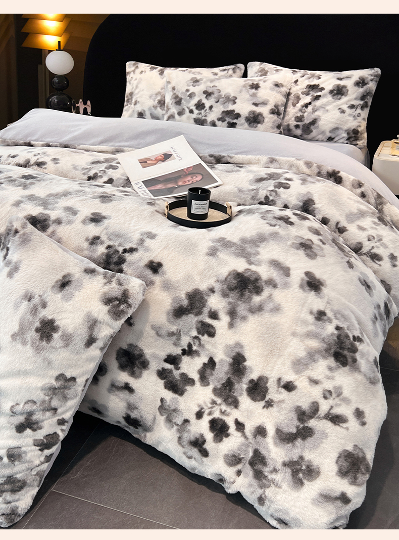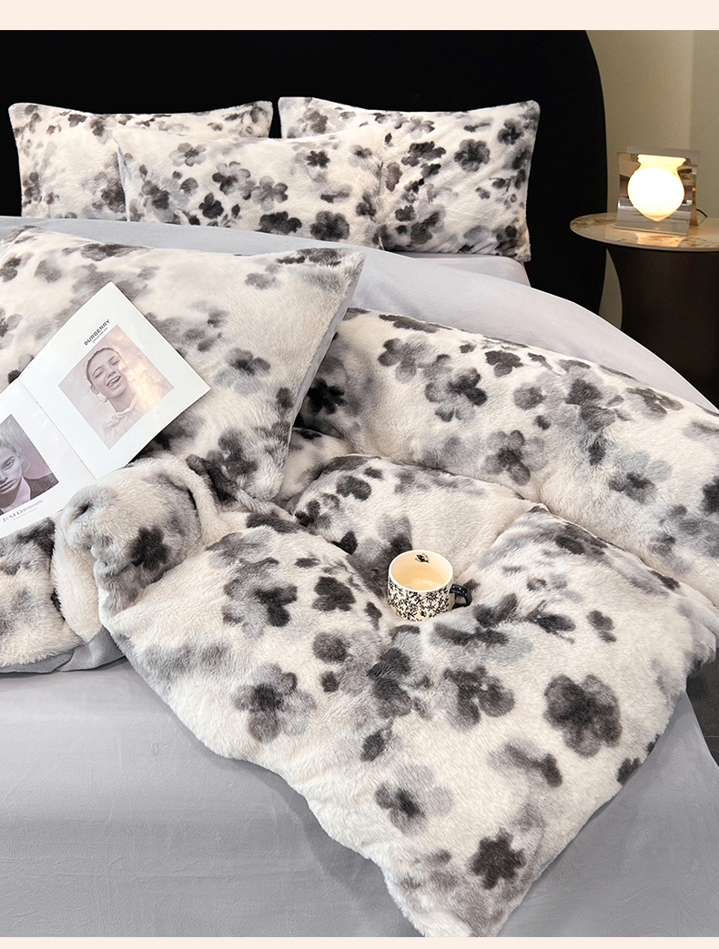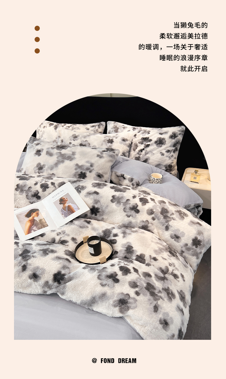 商品名称:悦织语 2025新款高克重加厚轻奢獭兔毛美拉德风四件套 兔毛-墨花