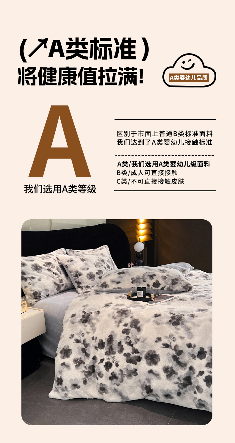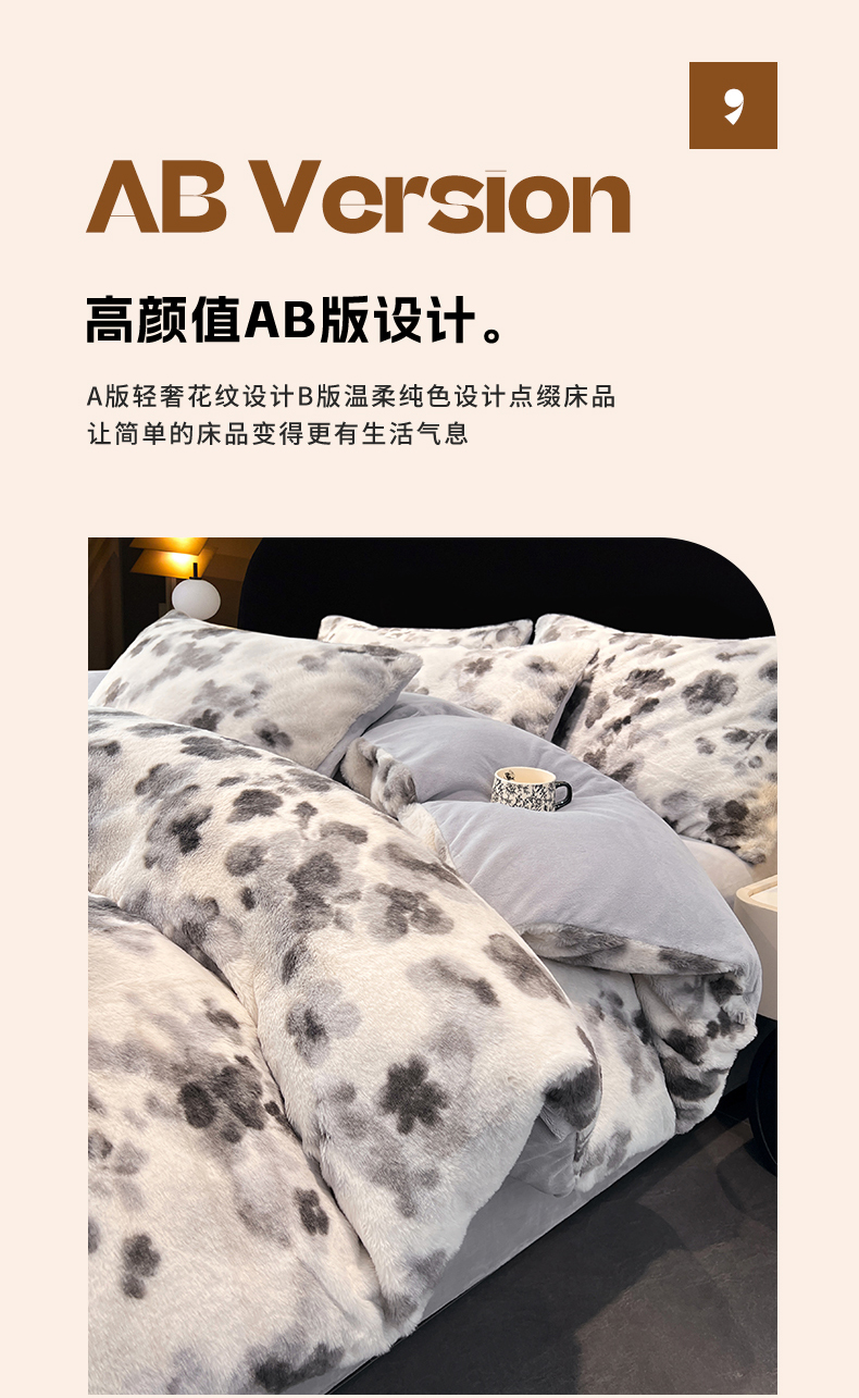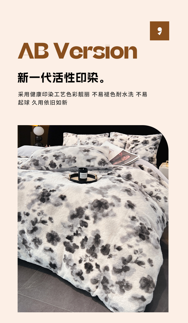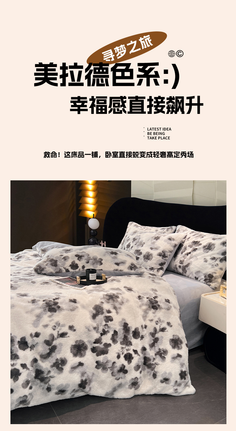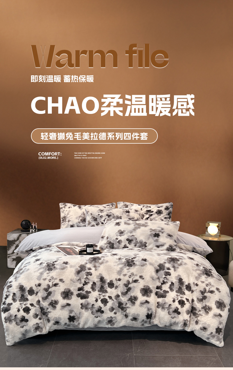 商品名称:悦织语 2025新款高克重加厚轻奢獭兔毛美拉德风四件套 兔毛-墨花