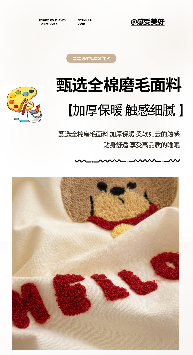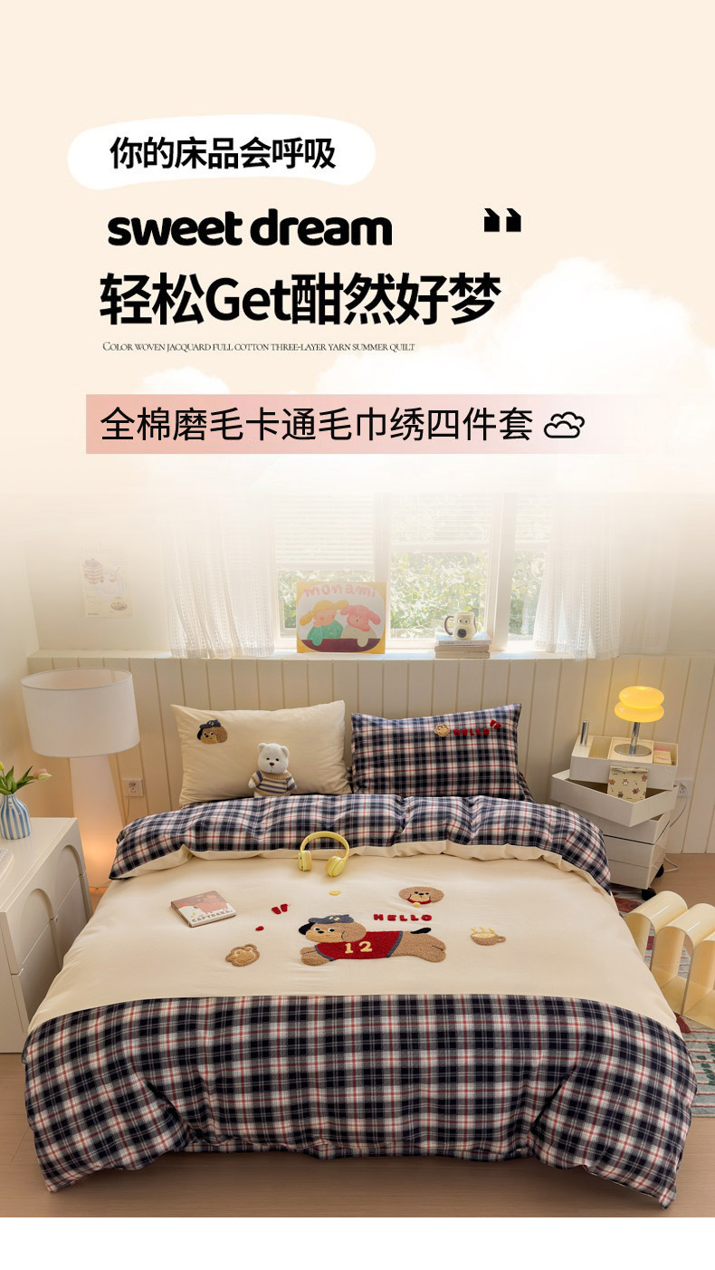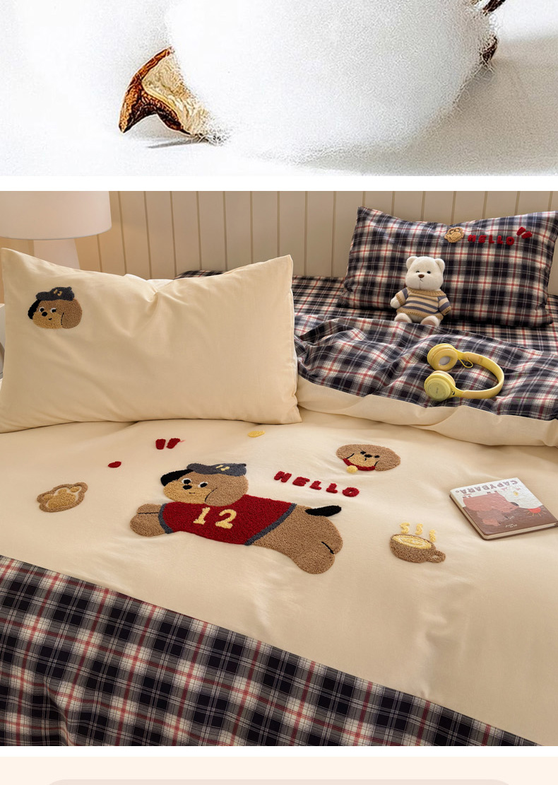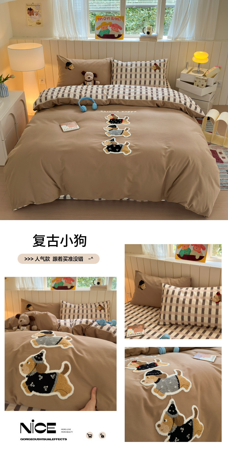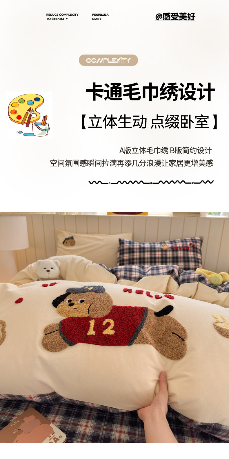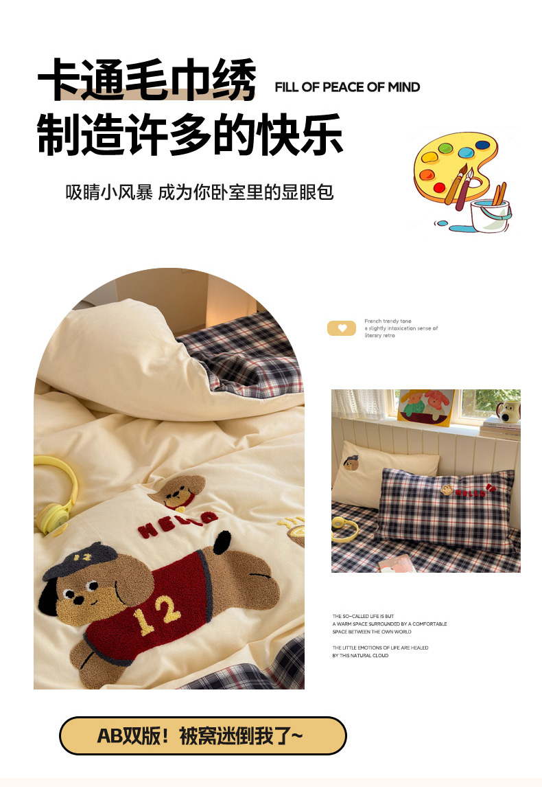 当前位置: 91家纺网 > 商品网购 > 床品套件 > 四件套 > 毛巾绣四件套 > 如意朵 2025新款全棉磨毛卡通毛巾绣四件套(专版花型)-场景二 运动小狗