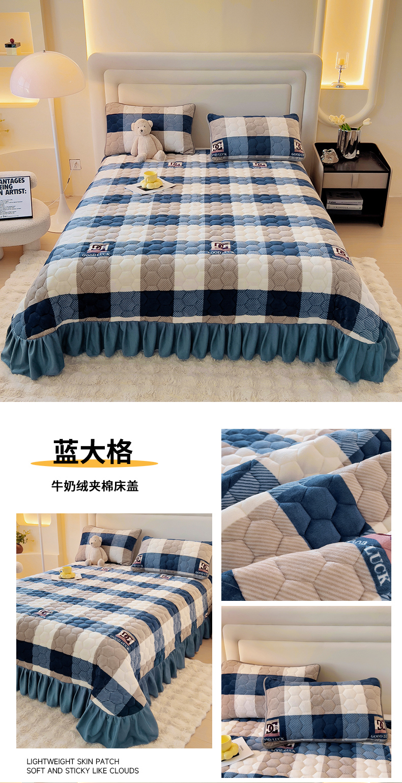 (总)情煊家纺 2025新款简约加厚A类牛奶绒夹棉印花床盖,蓝大格,乐拼字母,太空漫步,一鹿幸福,爱心小熊,豹纹,大力熊,蝶恋,红玫瑰,林深见鹿,秘境,蘑菇小兔,童趣,童真,西高地,银杏叶,紫爱心,三生有杏,大牌风范,莓果熊