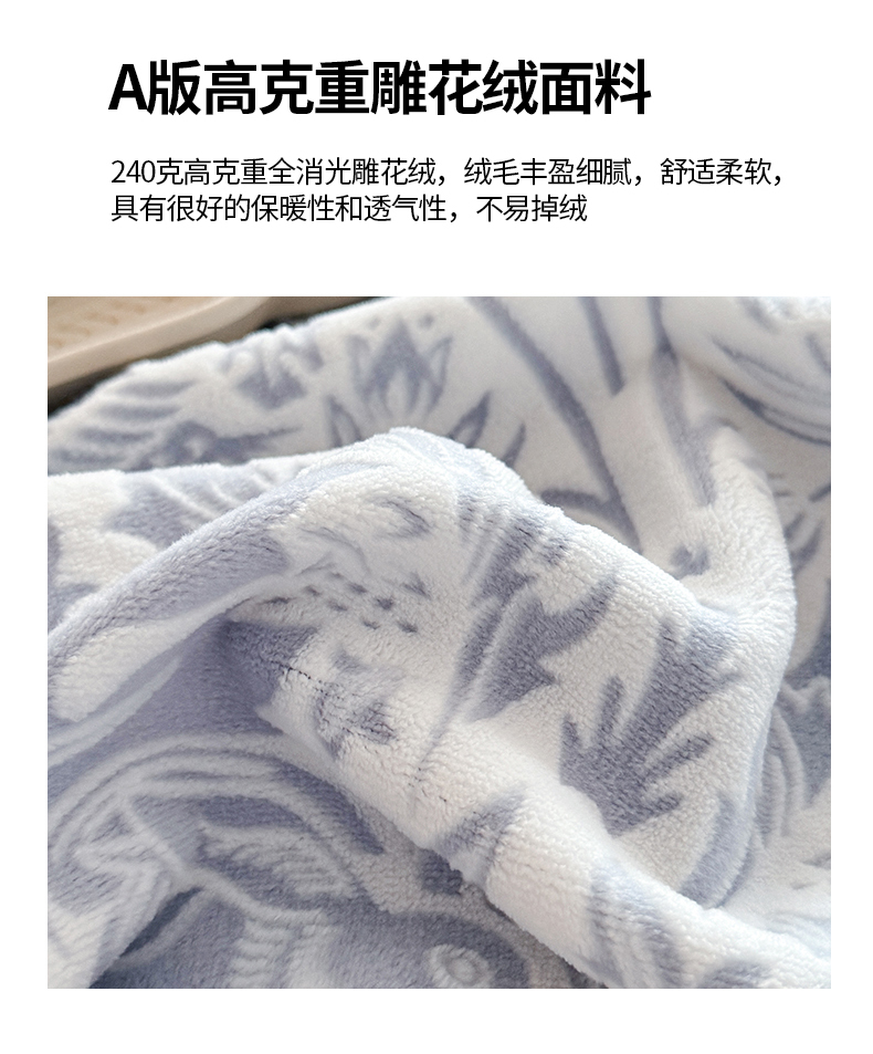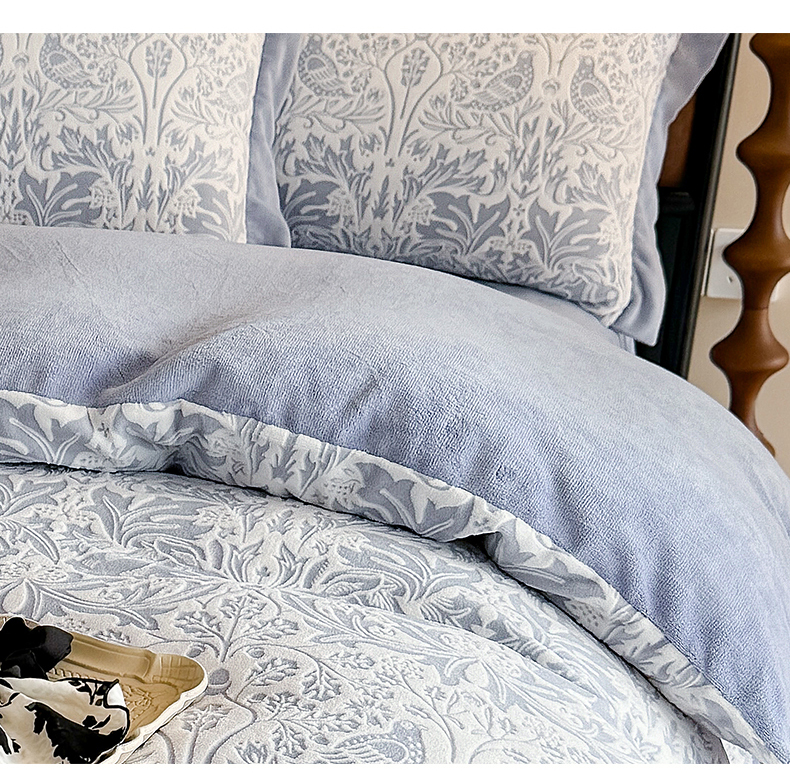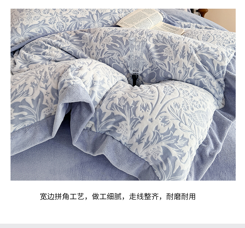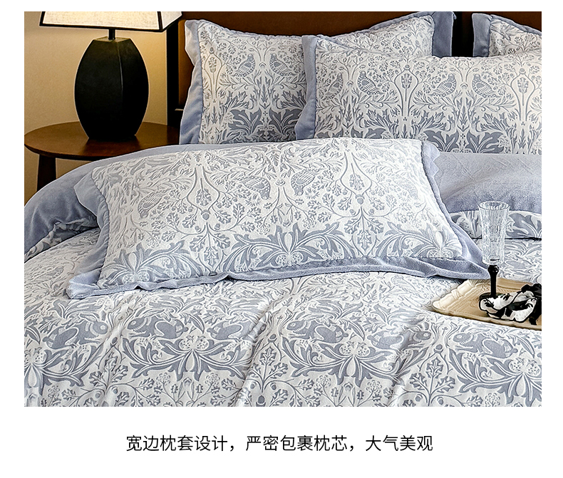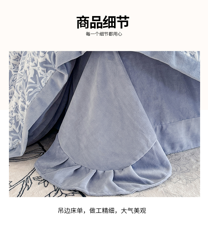 商品名称:慕晨 2025新款高克重雕花牛奶绒法式风大宽边拼角吊边床单四件套 可可西里-灰蓝