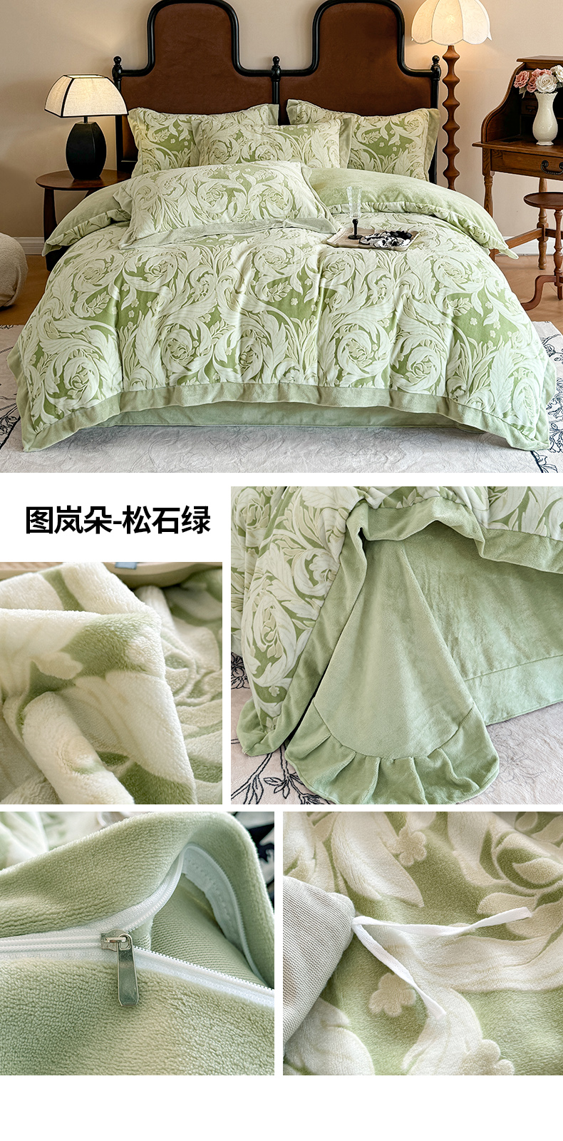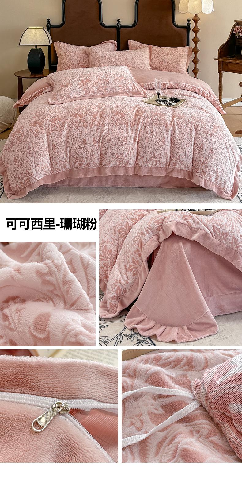 (总)慕晨 2025新款高克重雕花牛奶绒法式风大宽边拼角吊边床单四件套,可可西里-珊瑚粉,图岚朵-珊瑚粉,可可西里-灰蓝,图岚朵-松石绿,图岚朵-柔雾蓝