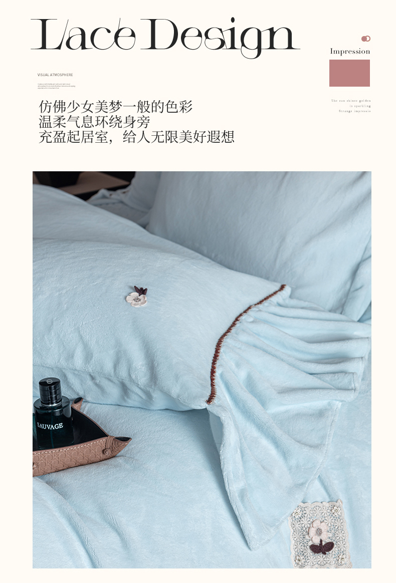 (总)罗优家纺 2025新款柔梦花边款暖绒四件套,暖杏色,柔雾蓝,柔雅灰,甜梦粉