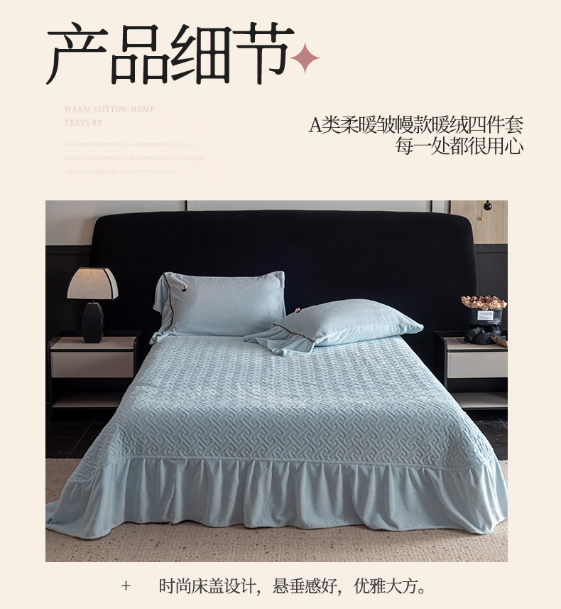(总)罗优家纺 2025新款柔暖皱幔款暖绒四件套,浅粉,浅灰,浅蓝,浅杏