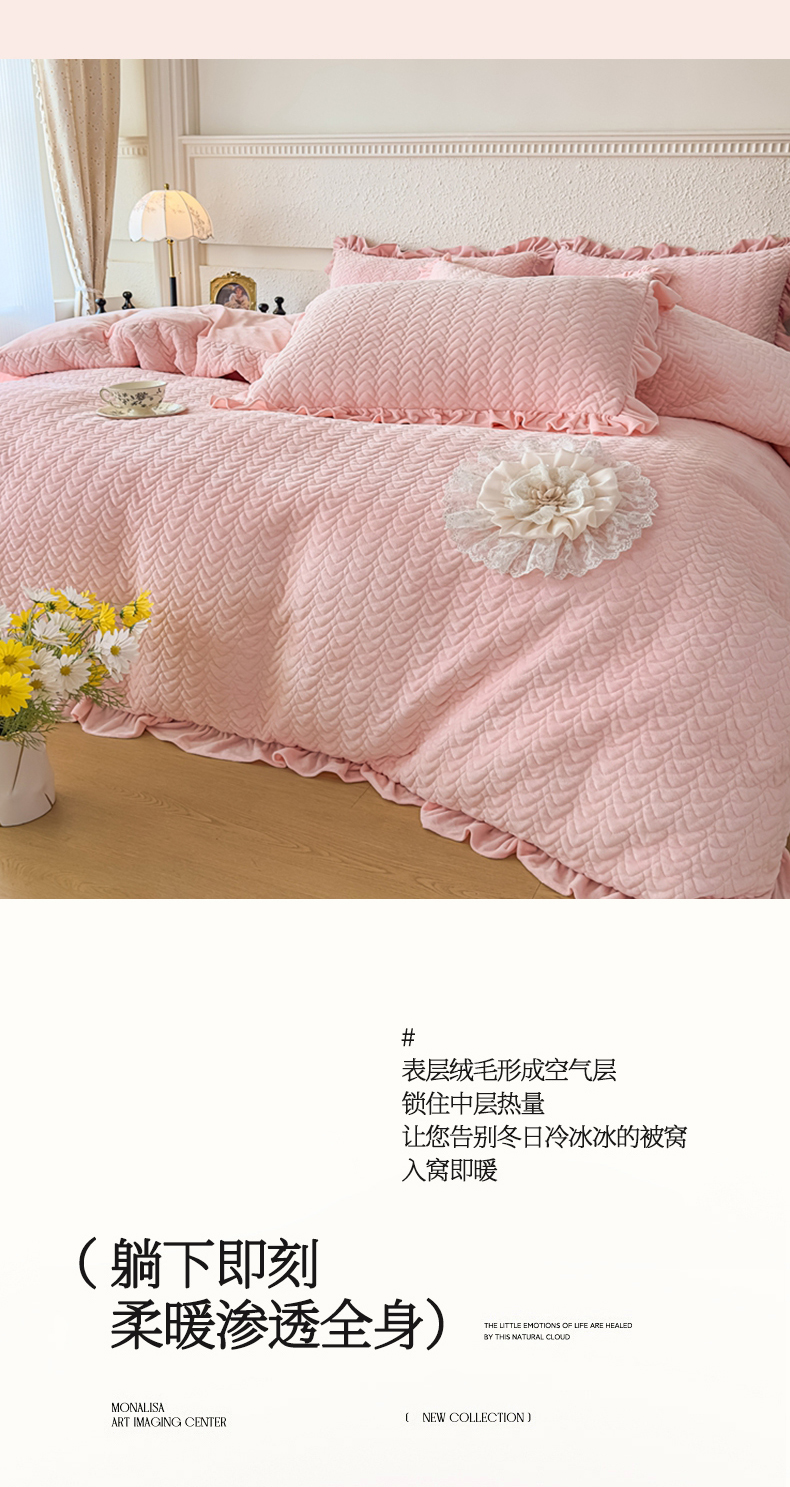 (总)乐嘉盈 2025年新款纯色雕花牛奶绒四件套,粉色