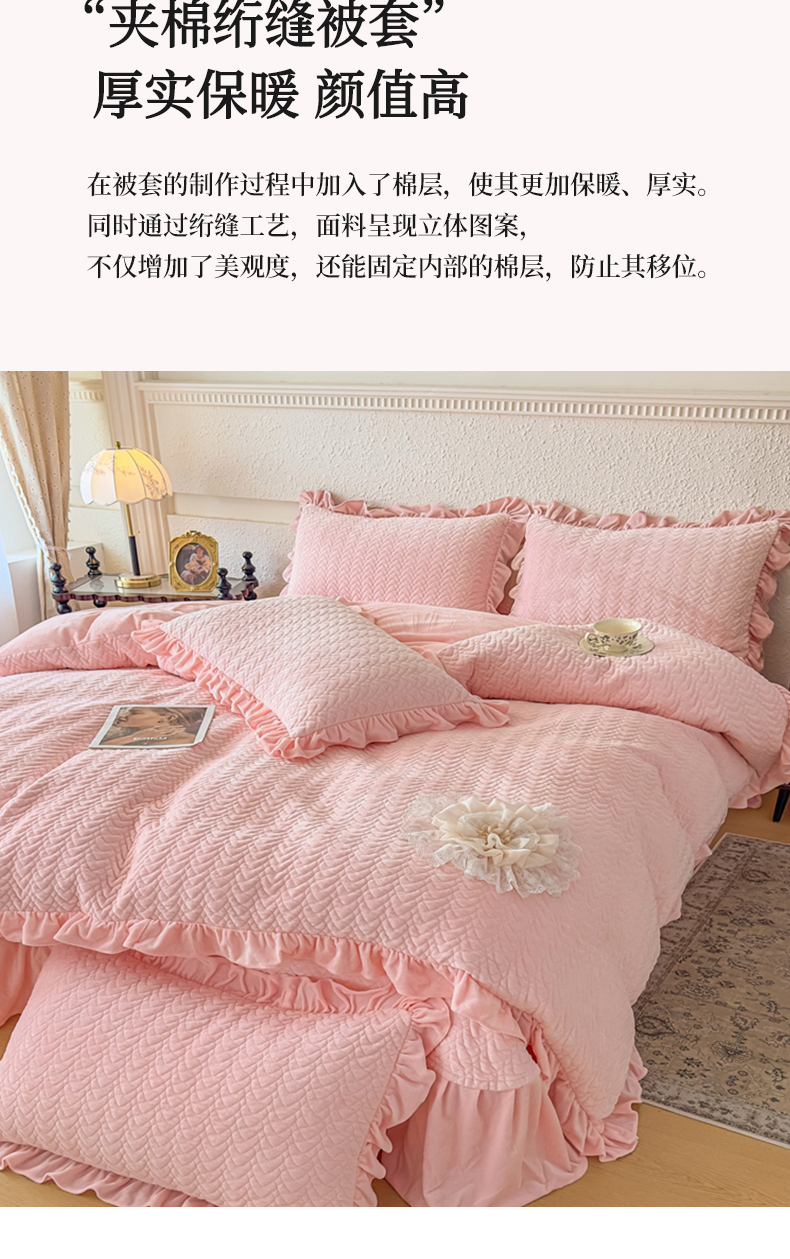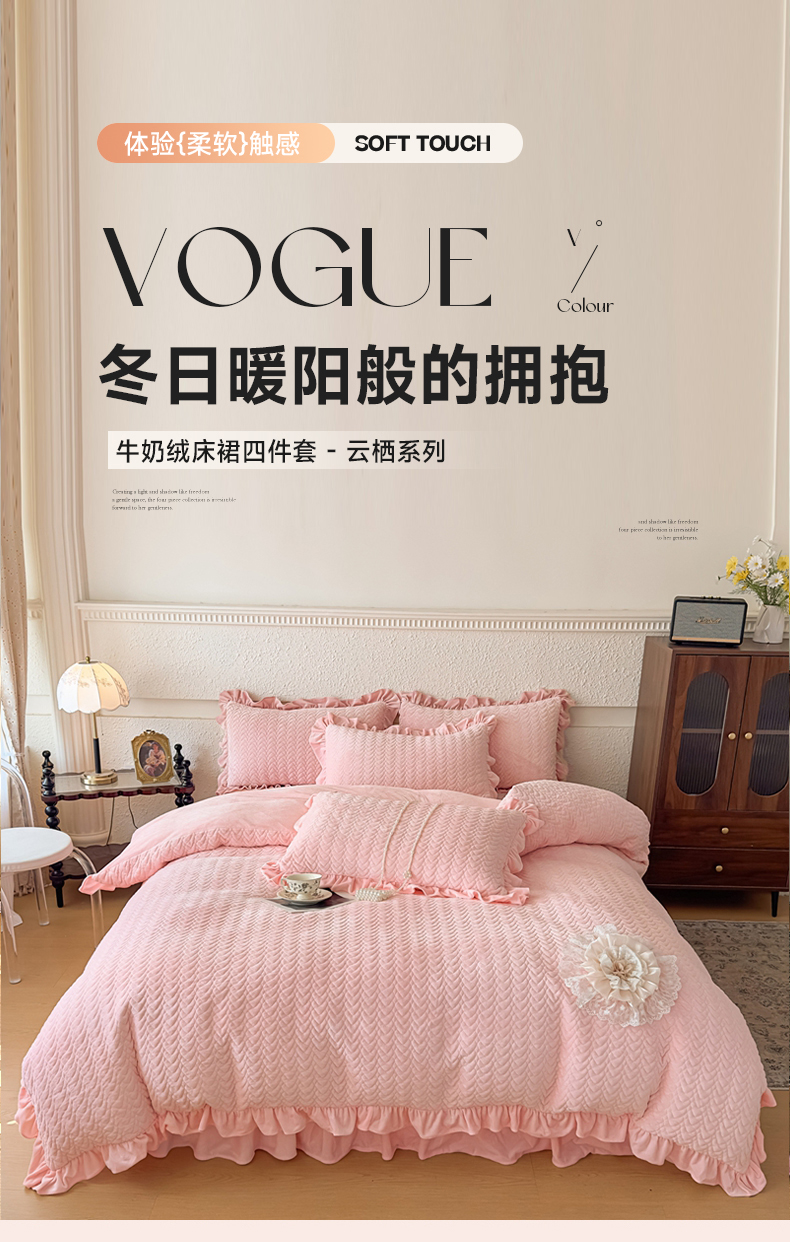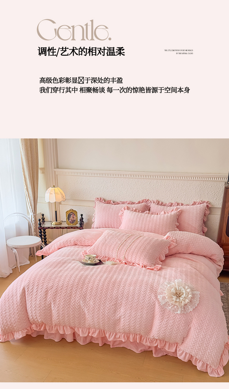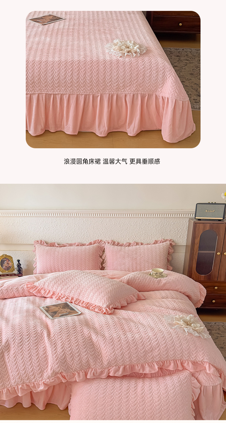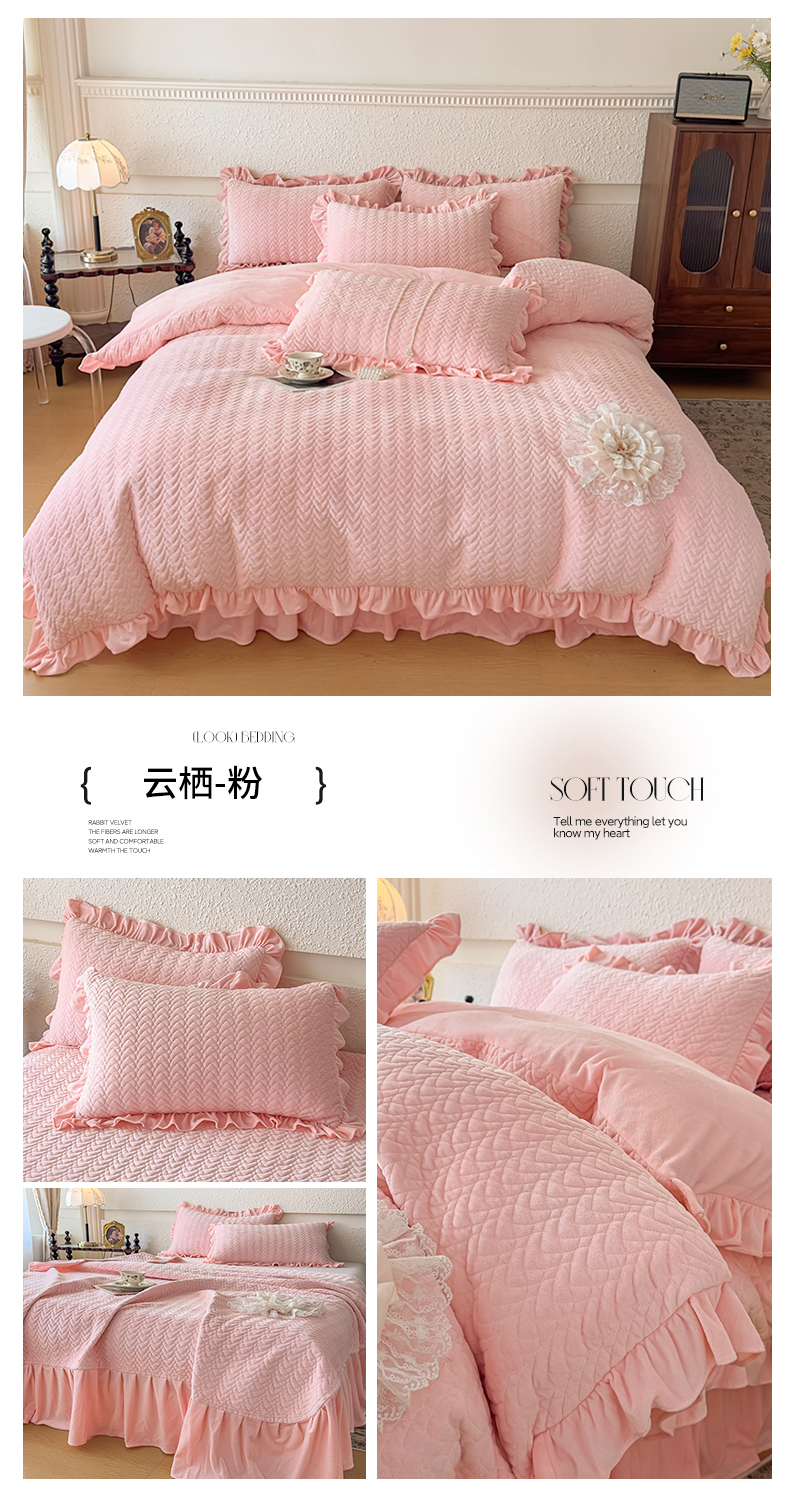 商品名称:乐嘉盈2025年新款纯色刺绣床裙款牛奶绒四件套-云栖 云栖-粉